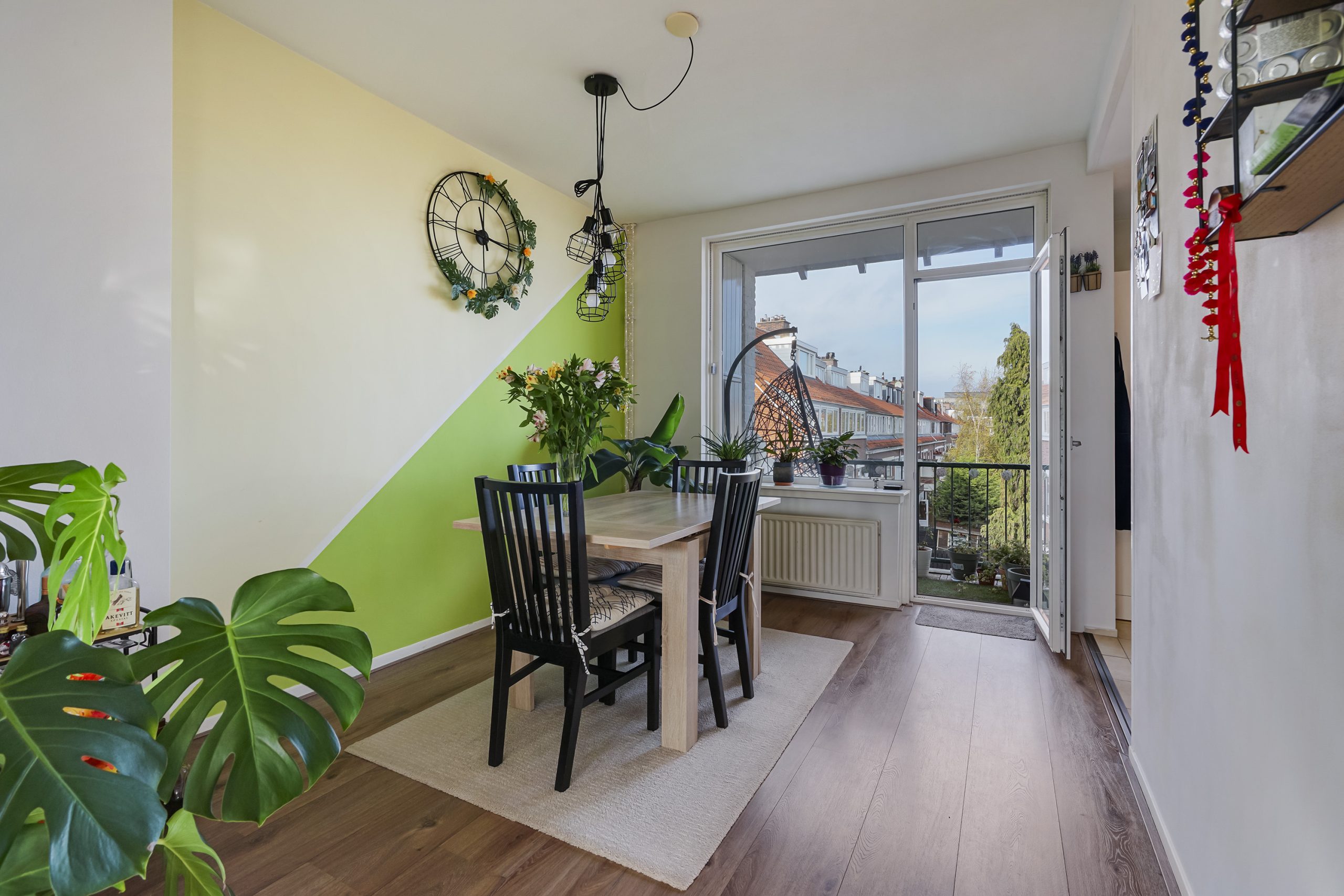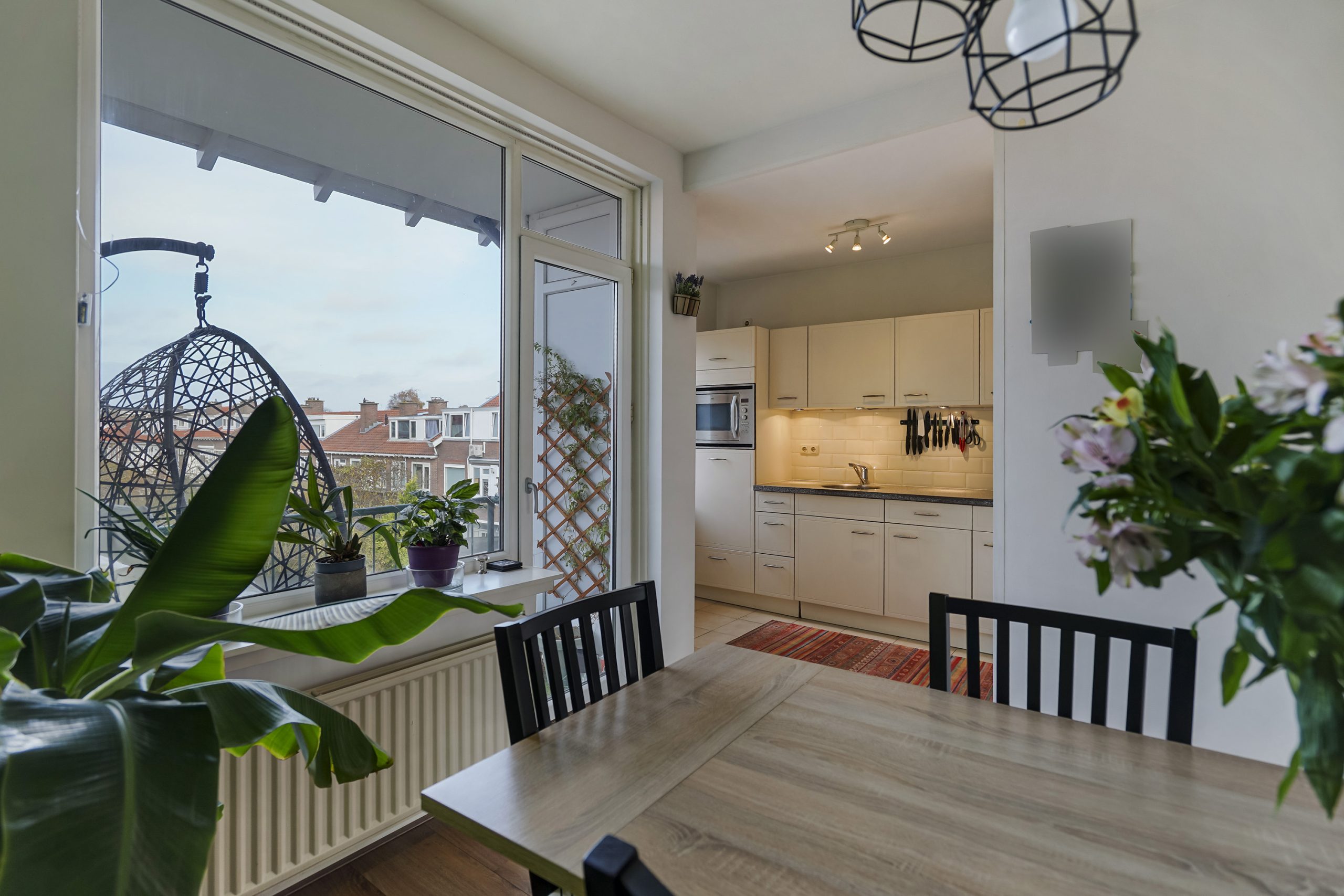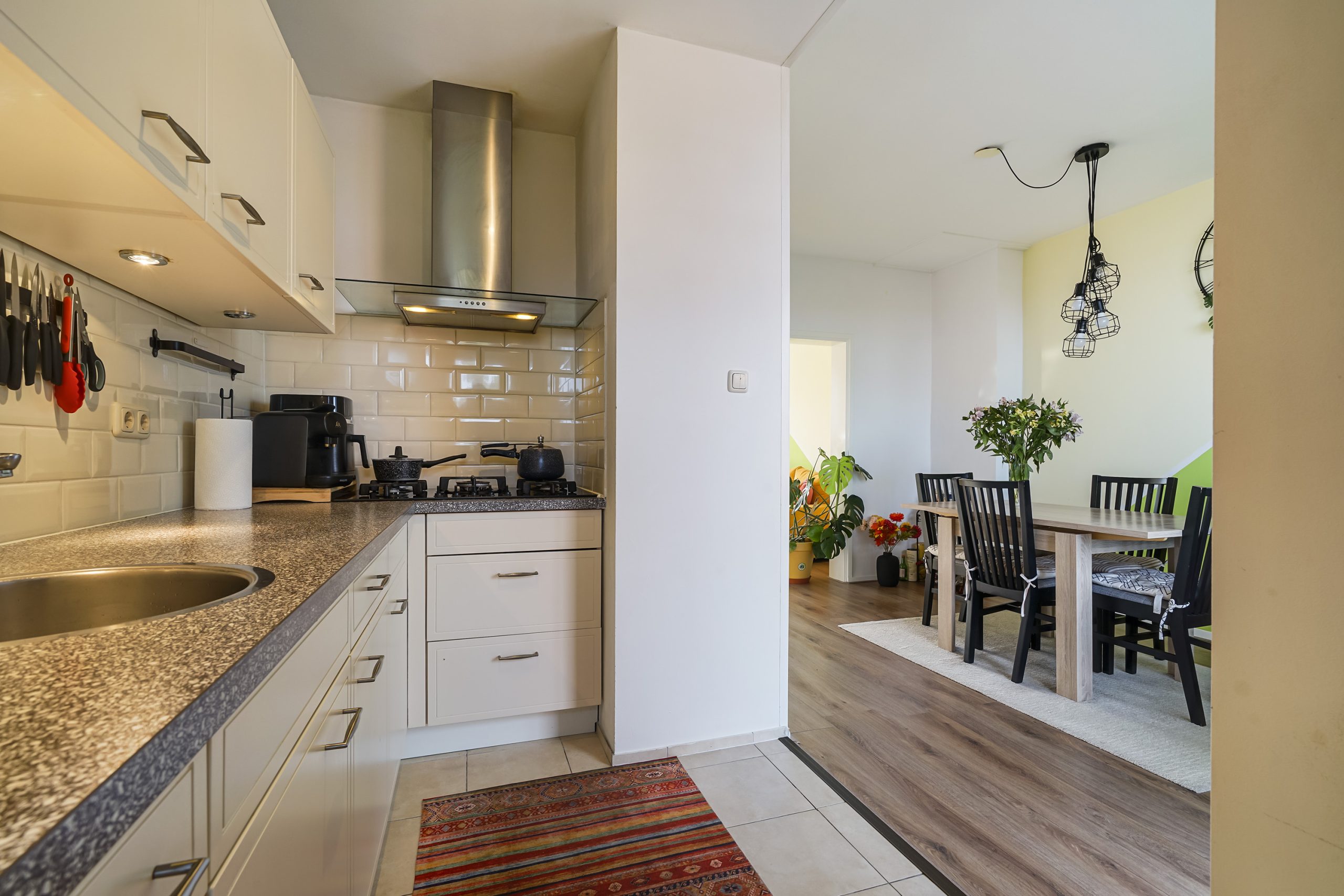 De lichte woonkamer aan de voorzijde biedt een vrij uitzicht en veel natuurlijke lichtinval. Aan de achterzijde vindt u de eetkamer, die direct grenst aan het balkon—een heerlijke plek om buiten te zitten. Vanuit de eetkamer bereikt u tevens de halfopen keuken, welke is voorzien van inbouwapparatuur zoals een gaskookplaat, afzuigkap, vaatwasser en spoelbak.