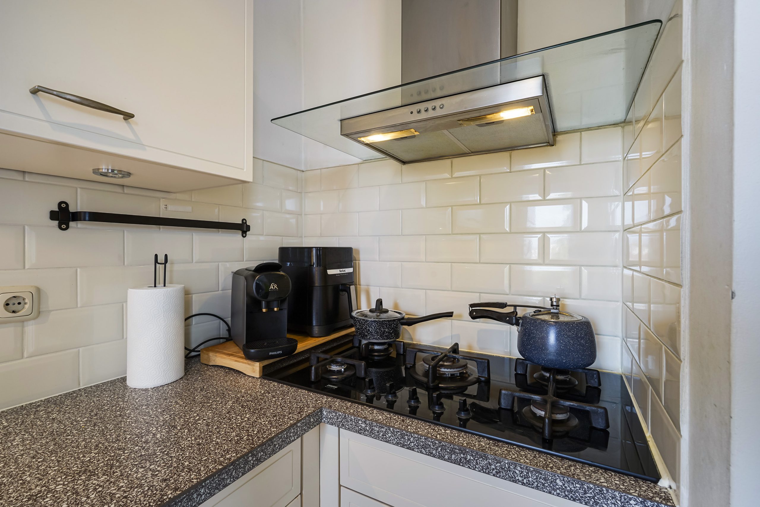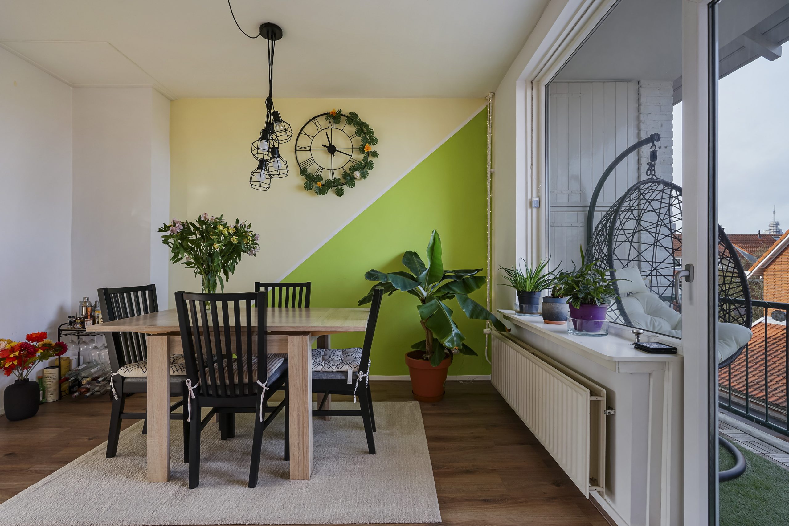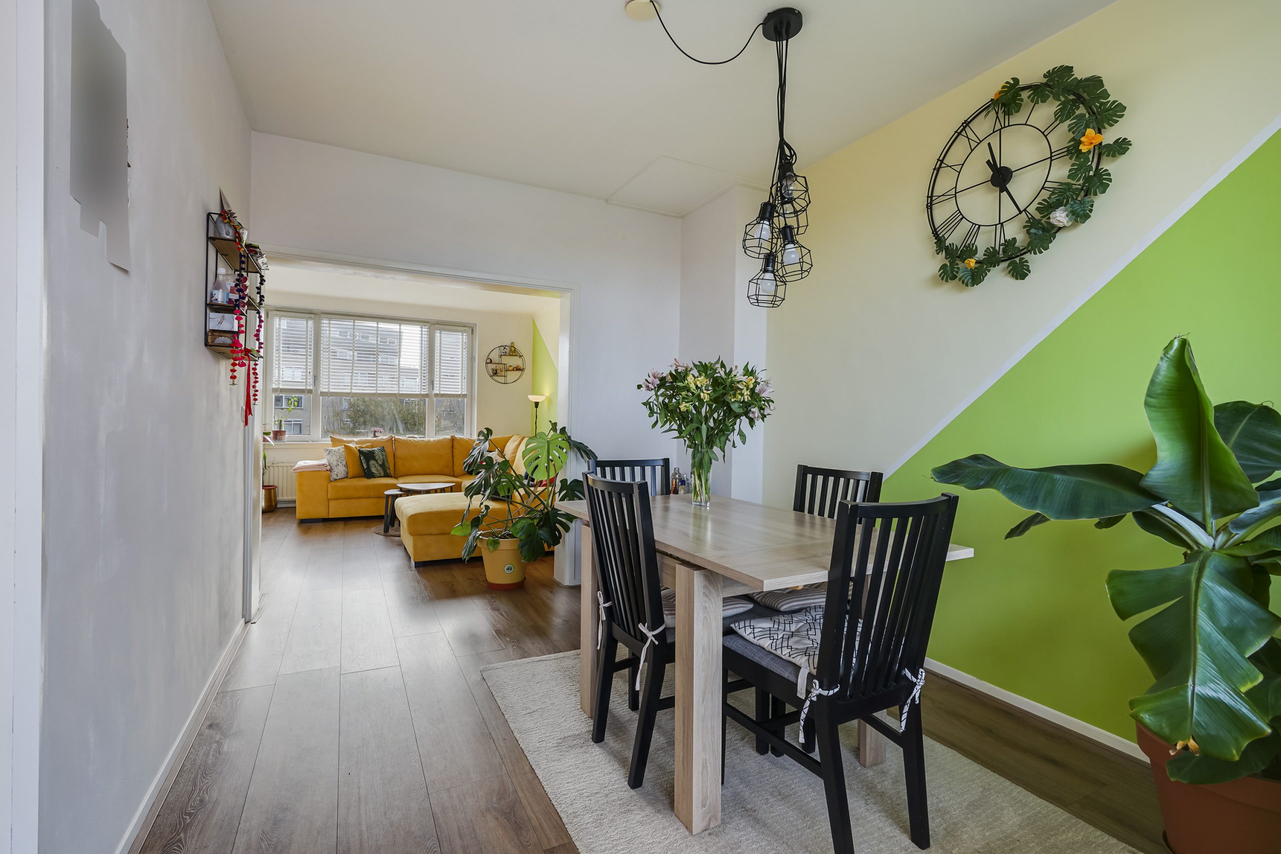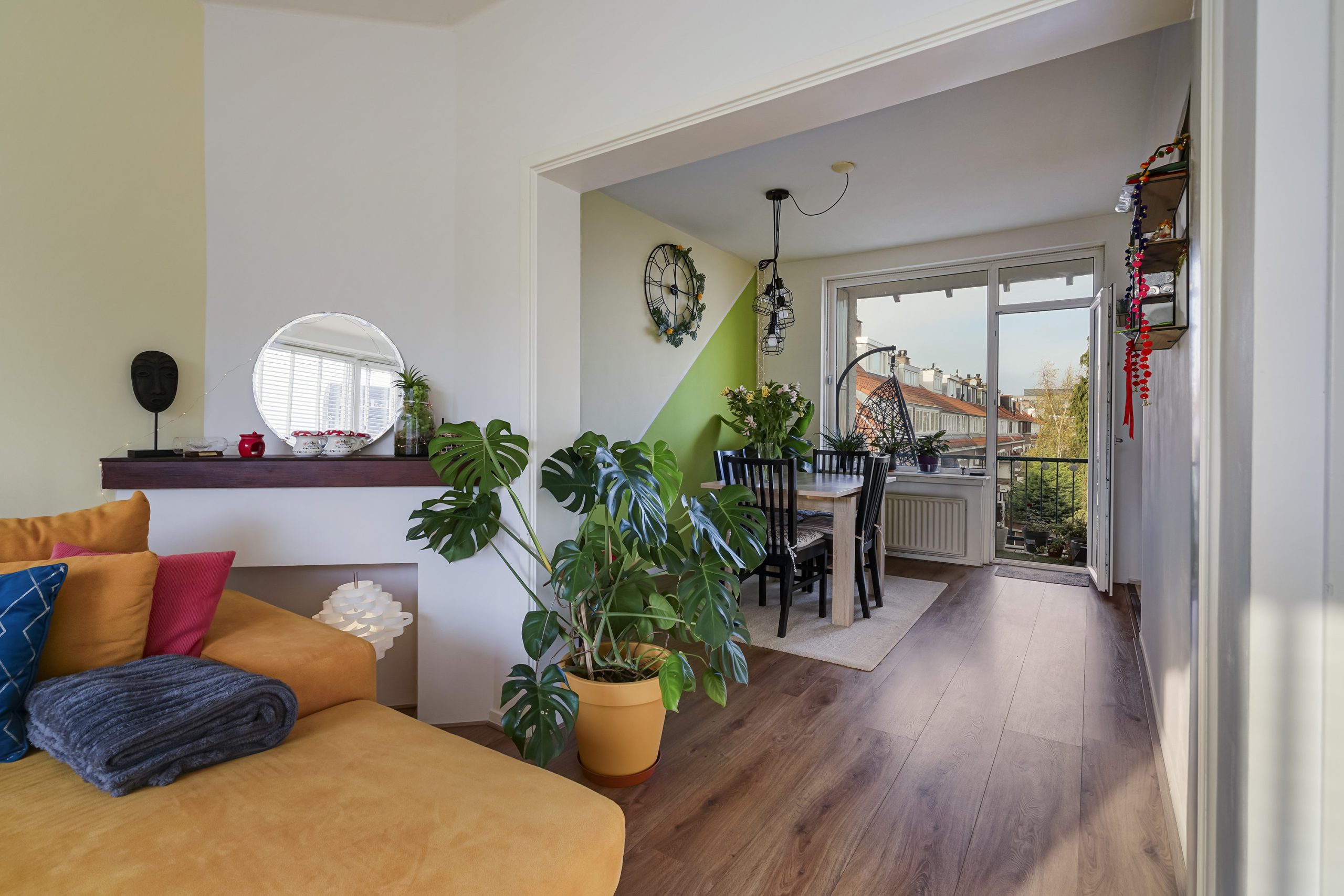 De lichte woonkamer aan de voorzijde biedt een vrij uitzicht en veel natuurlijke lichtinval. Aan de achterzijde vindt u de eetkamer, die direct grenst aan het balkon—een heerlijke plek om buiten te zitten. Vanuit de eetkamer bereikt u tevens de halfopen keuken, welke is voorzien van inbouwapparatuur zoals een gaskookplaat, afzuigkap, vaatwasser en spoelbak.