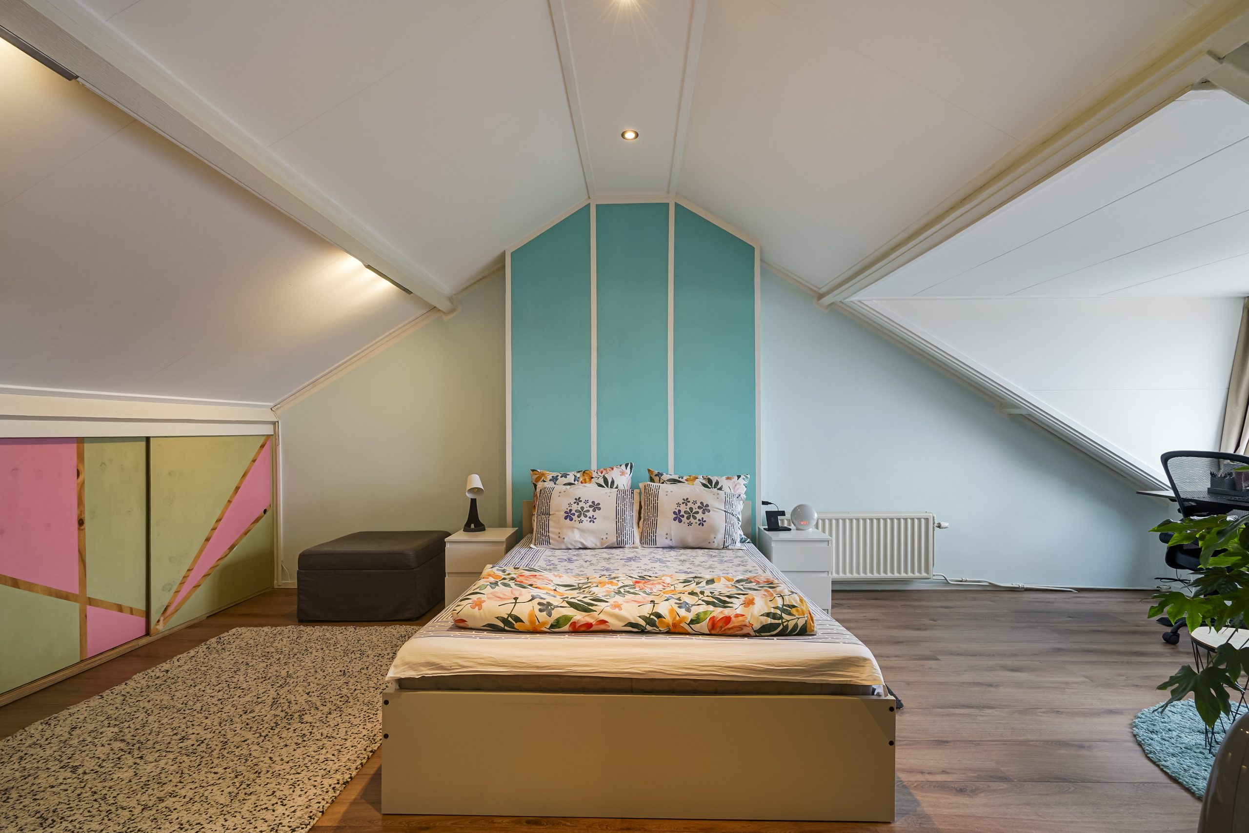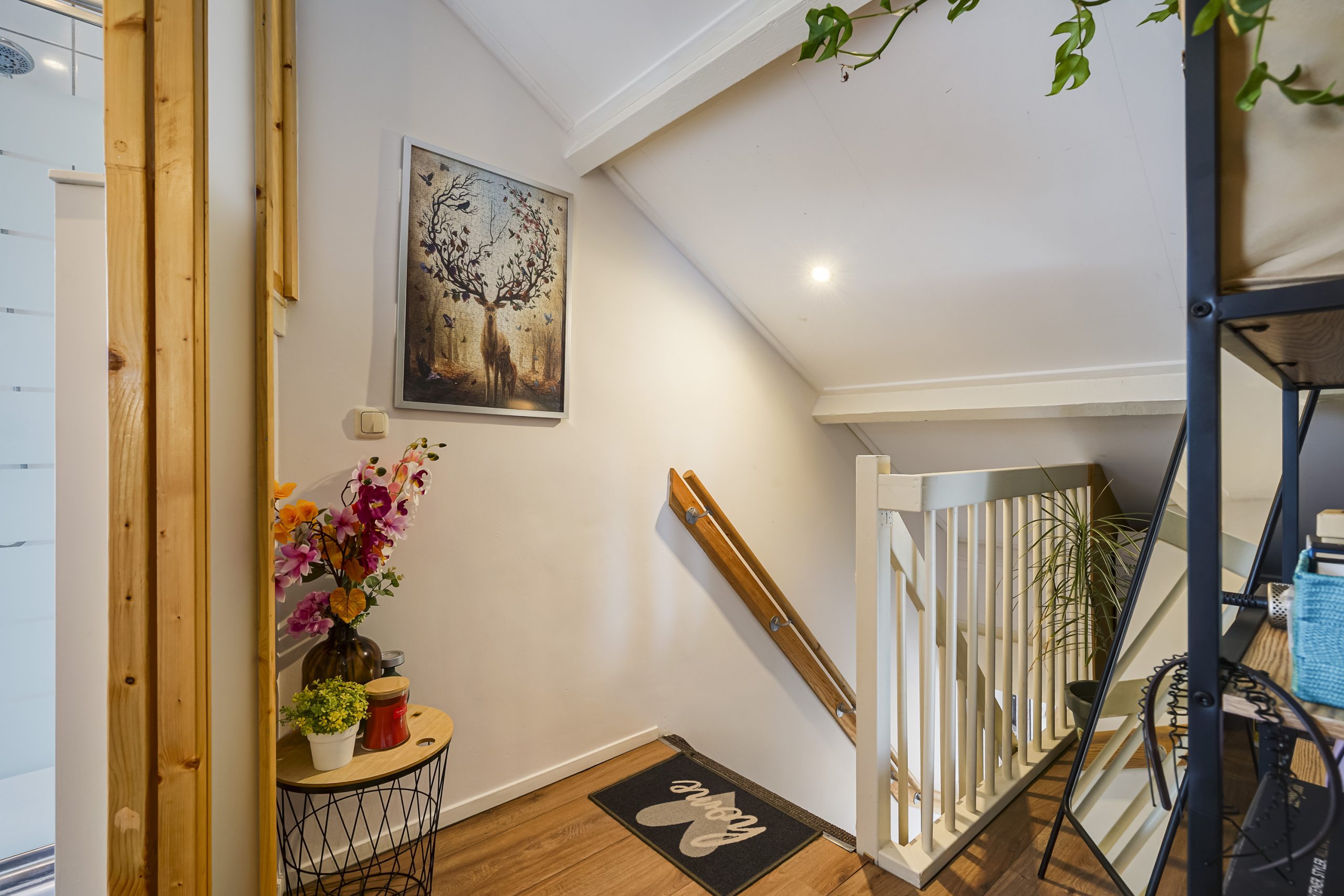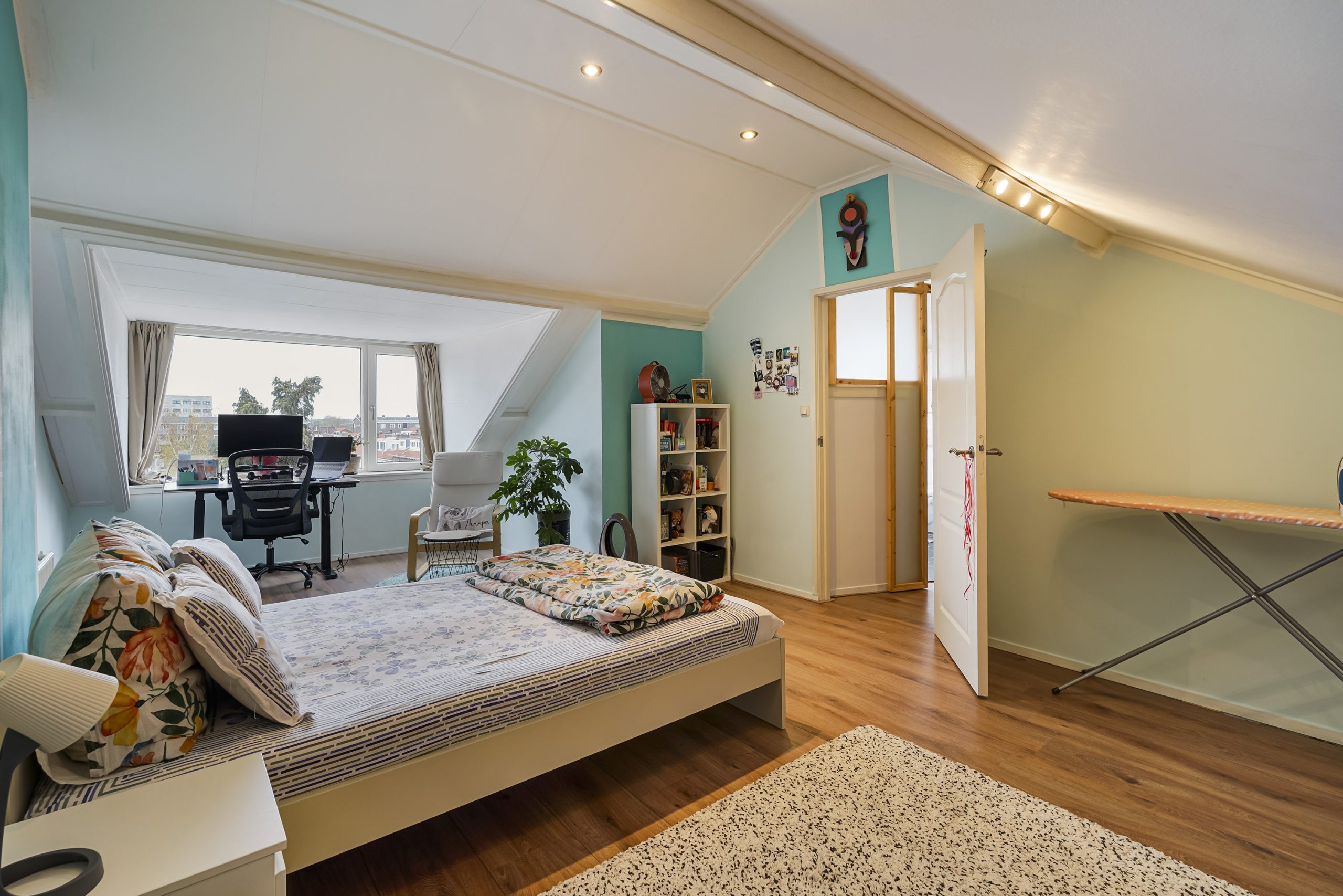 Via de trap bereikt u de bovenste verdieping, waar zich de ruime hoofdslaapkamer bevindt. Deze slaapkamer beschikt over extra opbergruimte achter de knieschotten, ideaal voor koffers, seizoensspullen of andere berging. De verdieping voelt licht en ruim aan, mede door de goede plafondhoogte en praktische indeling.