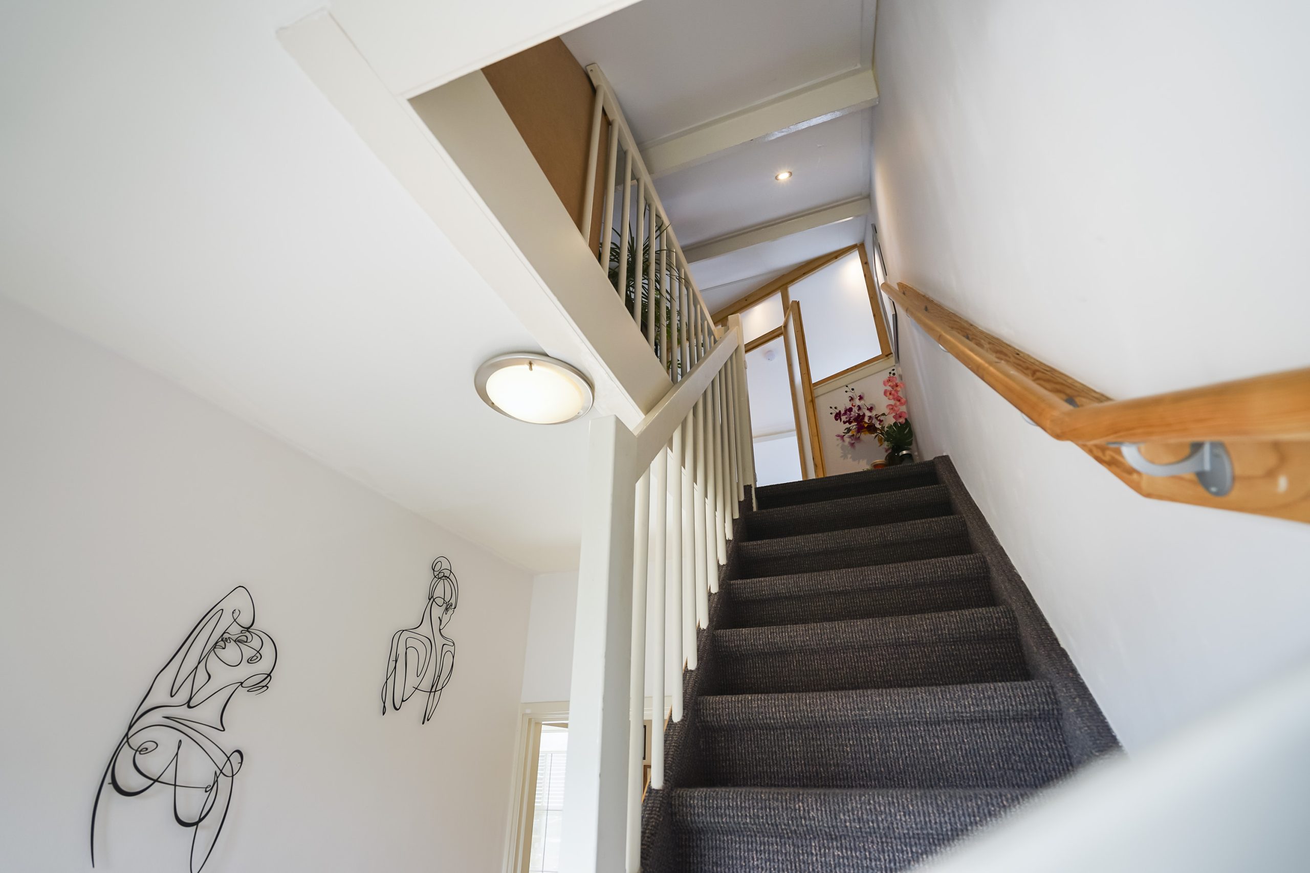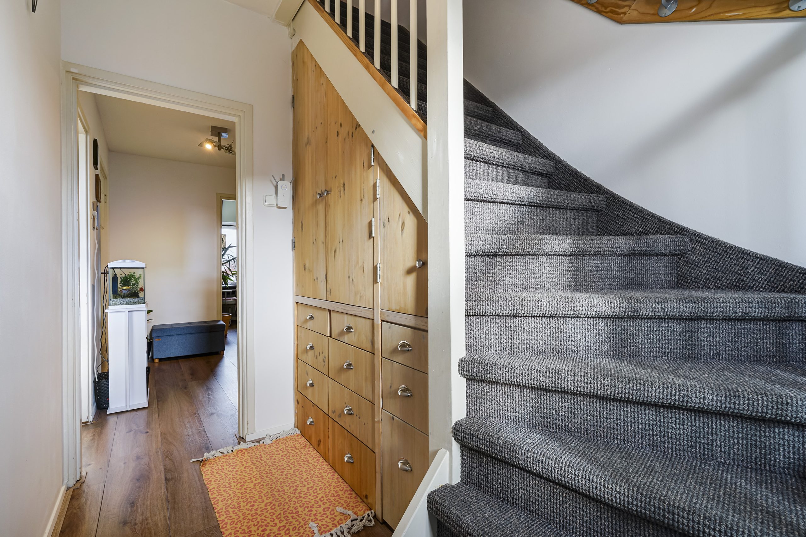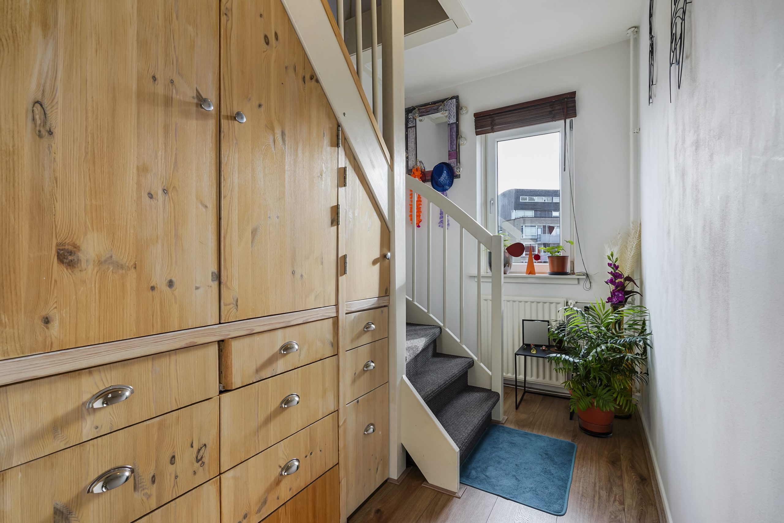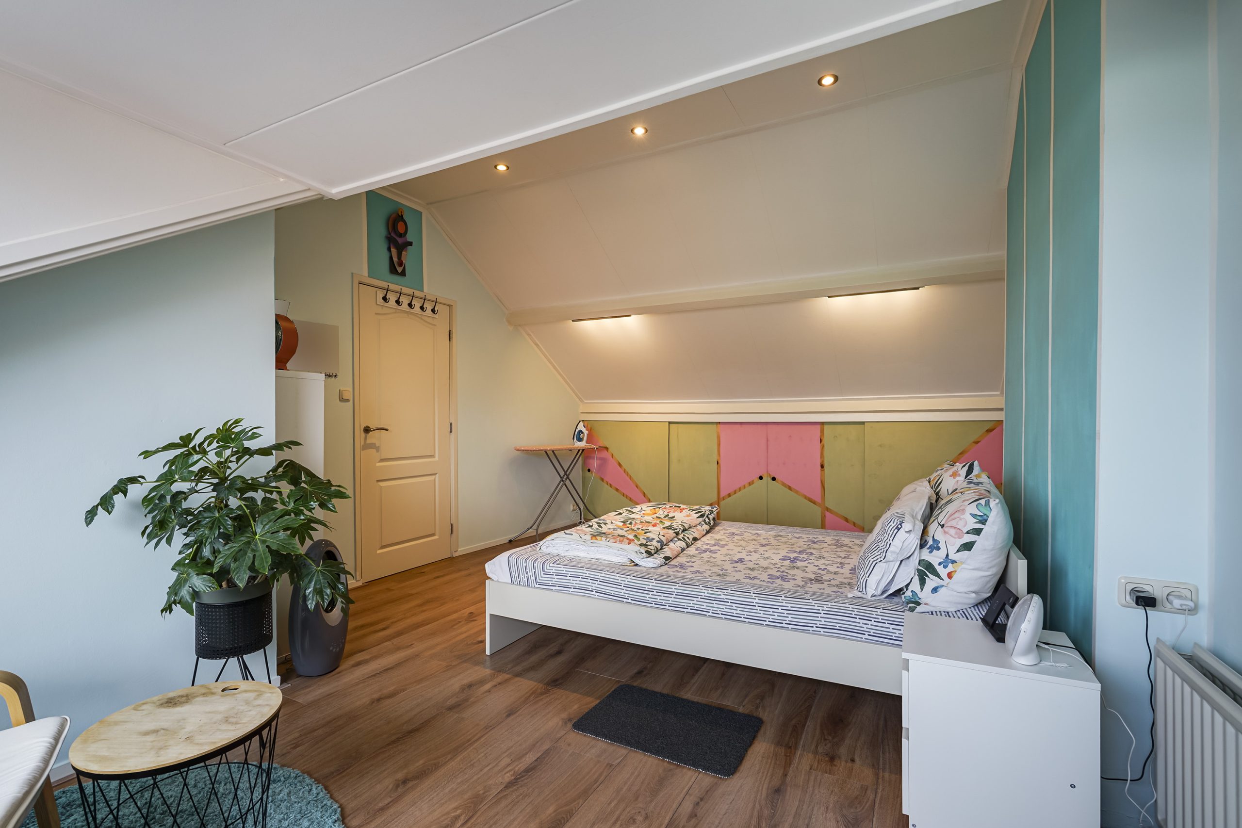 Via de trap bereikt u de bovenste verdieping, waar zich de ruime hoofdslaapkamer bevindt. Deze slaapkamer beschikt over extra opbergruimte achter de knieschotten, ideaal voor koffers, seizoensspullen of andere berging. De verdieping voelt licht en ruim aan, mede door de goede plafondhoogte en praktische indeling.