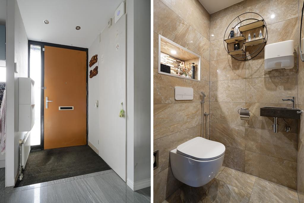 Entrance to the house via the front garden with fencing. Entrance with access to the indoor storage room with electrical installation cabinet (9 groups and 2x a.l.s.). The storage room is also accessible from the outside for storing bicycles, among other things. Modern toilet with a hanging toilet and a sink.