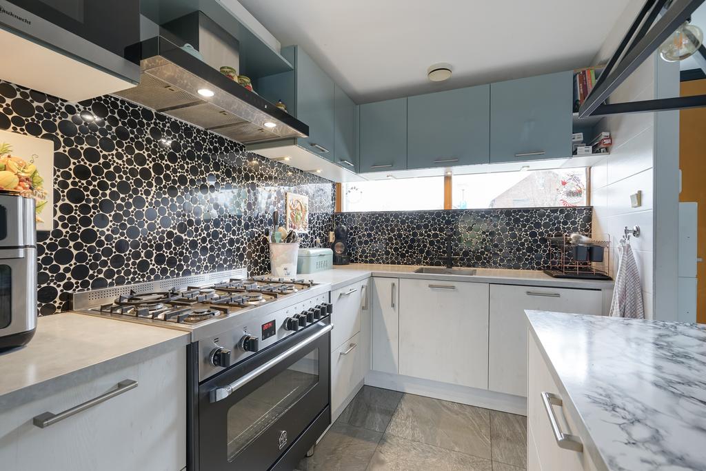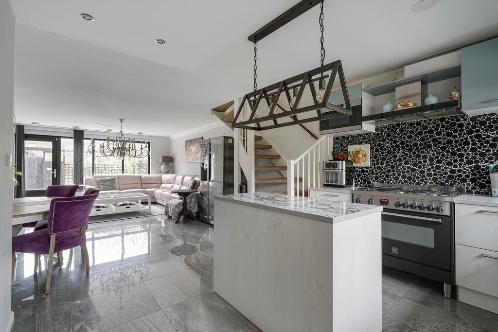 Spacious living room with an open kitchen and kitchen island with various built-in appliances (including 5-burner gas stove, oven, combination microwave, dishwasher, Quooker and extractor hood).