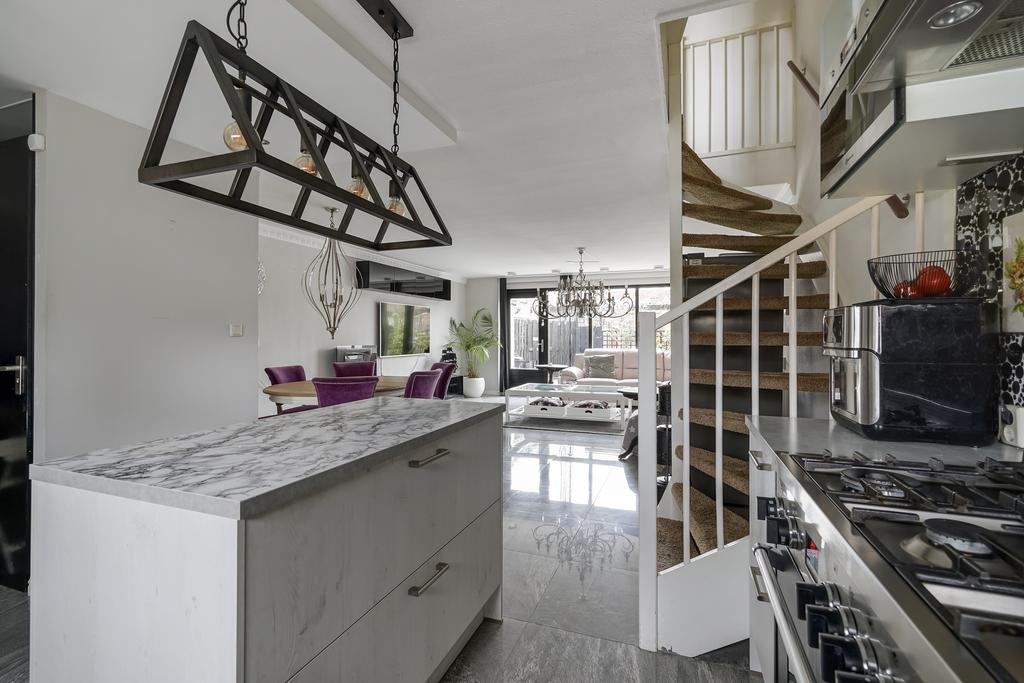 Ruime woonkamer met een open keuken en keukeneiland voorzien van diverse inbouwapparatuur (o.a. 5-pits gasstel, oven, combi-magnetron, vaatwasser, Quooker en afzuigkap).