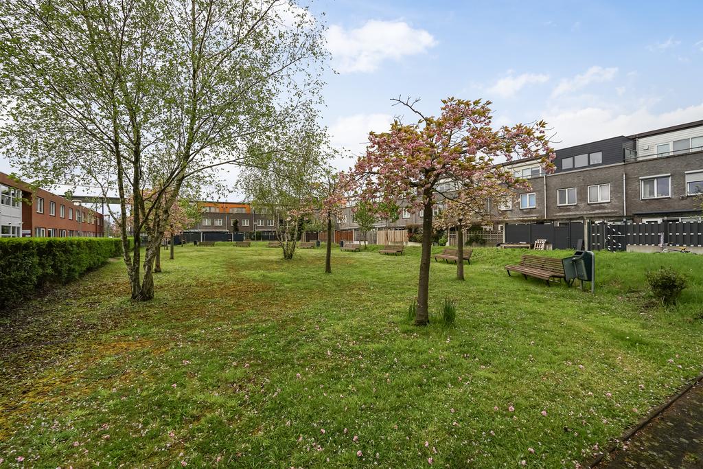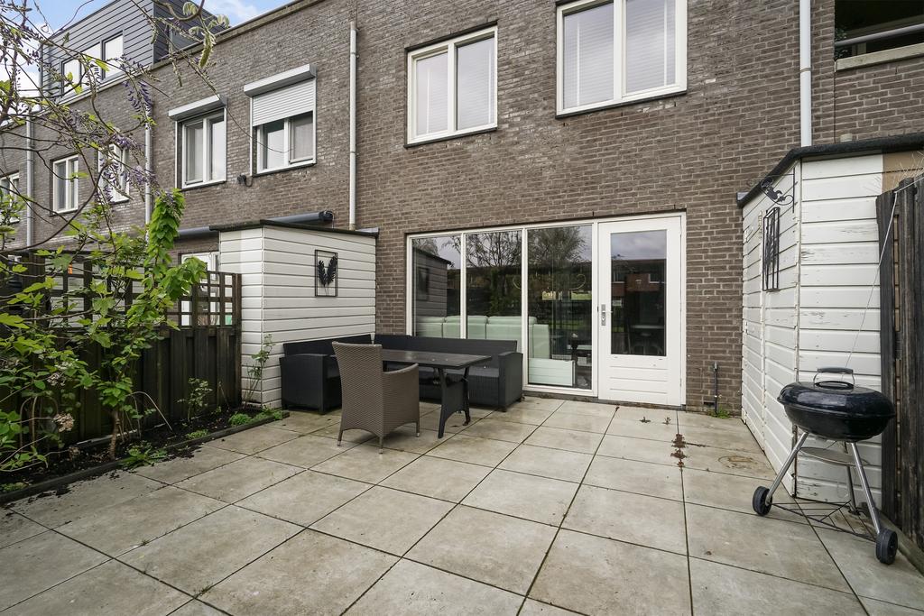 Vanuit de woonkamer via een deur krijg je toegang tot de achtertuin met aangebouwde houten berging en een achterom. Aangrenzend een gemeenschappelijke binnentuin. Opvallend is de vrije ligging en een prettige zonligging op het Zuidoosten.