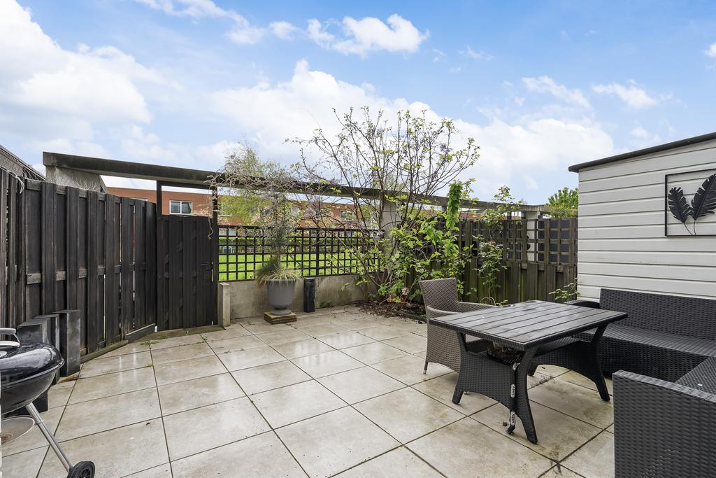 From the living room through a door you get access to the backyard with attached wooden shed and a back entrance. Adjacent a communal courtyard. What is striking is the unobstructed location and a pleasant south-east facing sun position.