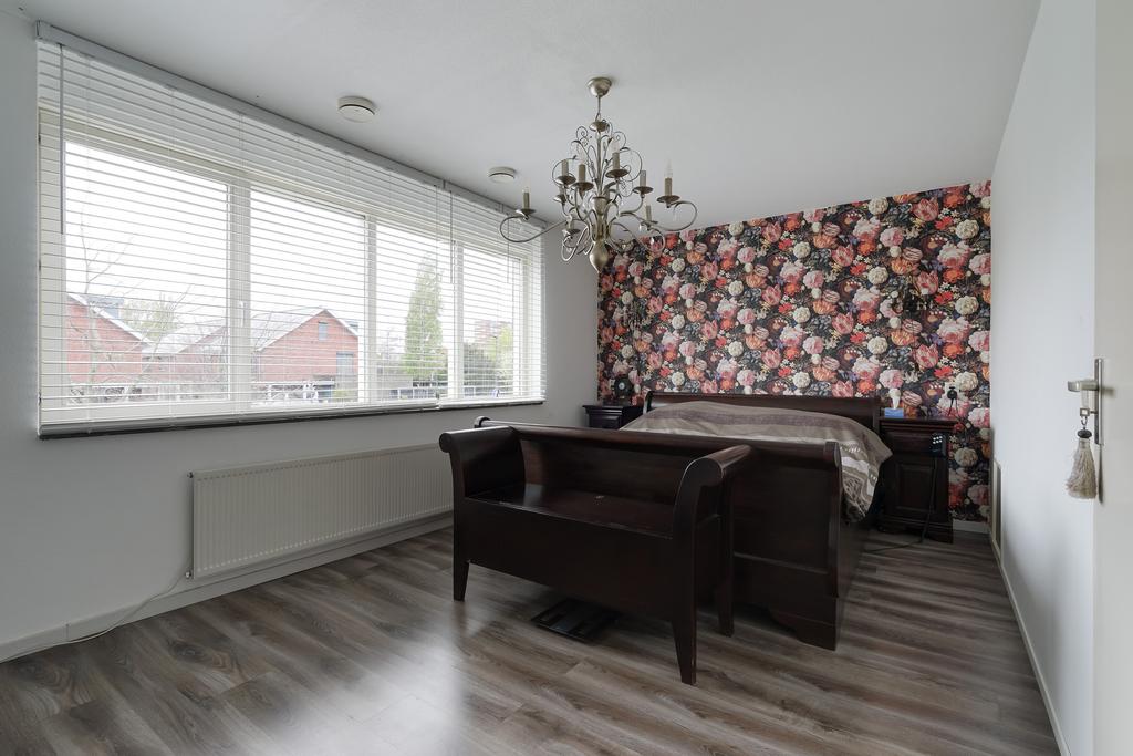 Met een open trap in de woonkamer gaan we naar de 1e verdieping met een ruime overloop. Op deze verdieping twee grote slaapkamers. De slaapkamer aan de achterzijde (voorheen twee slaapkamers) is ingericht als grote kastenkamer. Op deze verdieping ook een sfeervolle badkamer met een inloop douche, dubbel wastafelmeubel, design radiator en een 2e toilet.