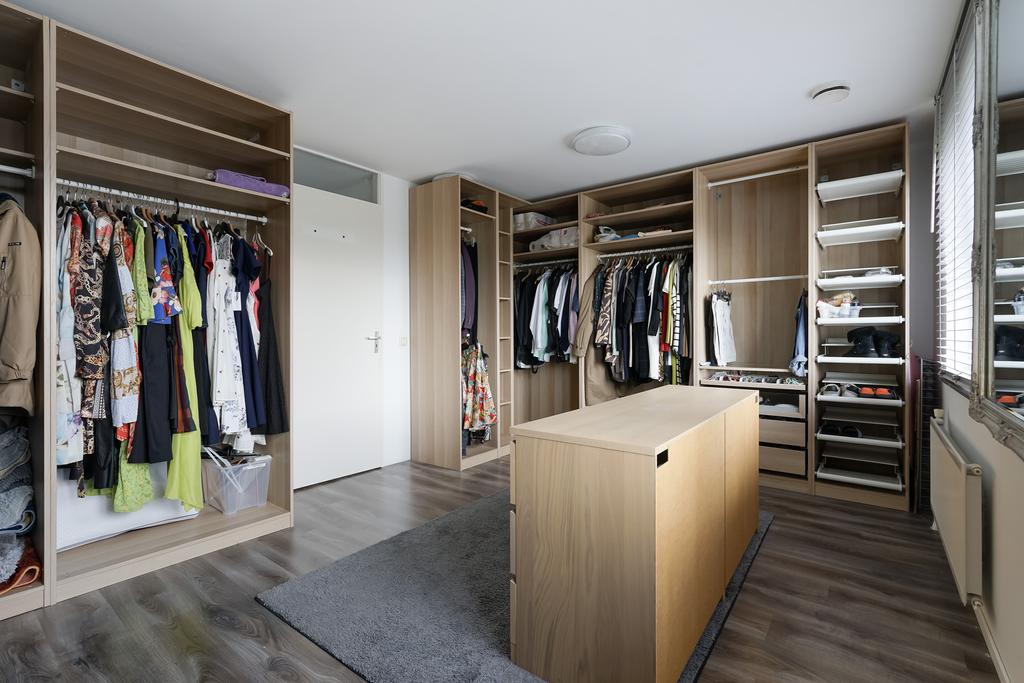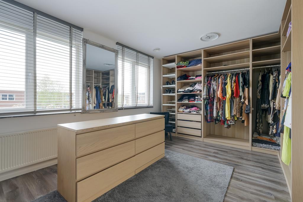 An open staircase in the living room takes us to the 1st floor with a spacious landing. Two large bedrooms on this floor. The bedroom at the rear (formerly two bedrooms) is furnished as a large closet room. On this floor there is also an attractive bathroom with a walk-in shower, double washbasin, design radiator and a 2nd toilet.
