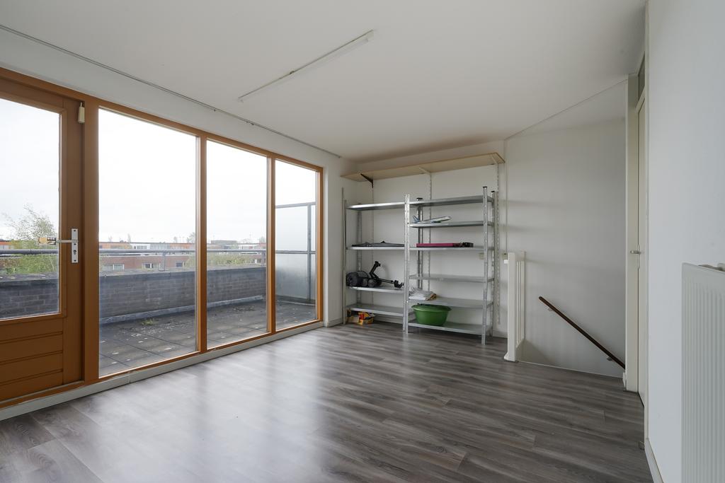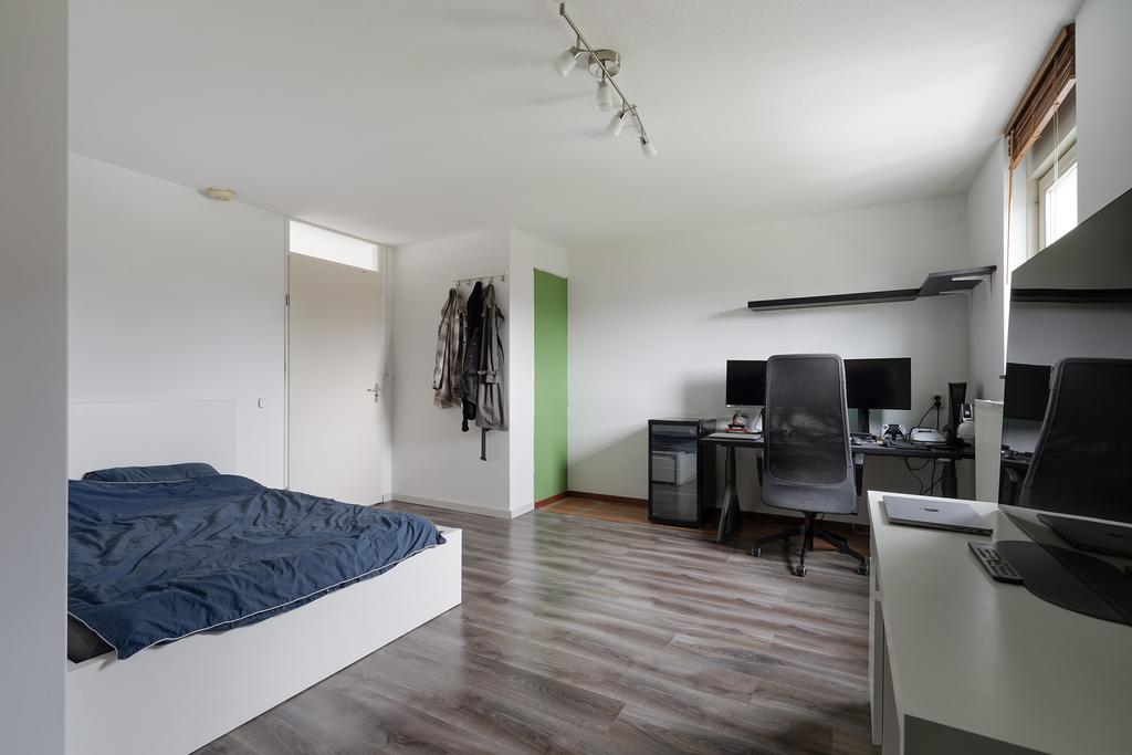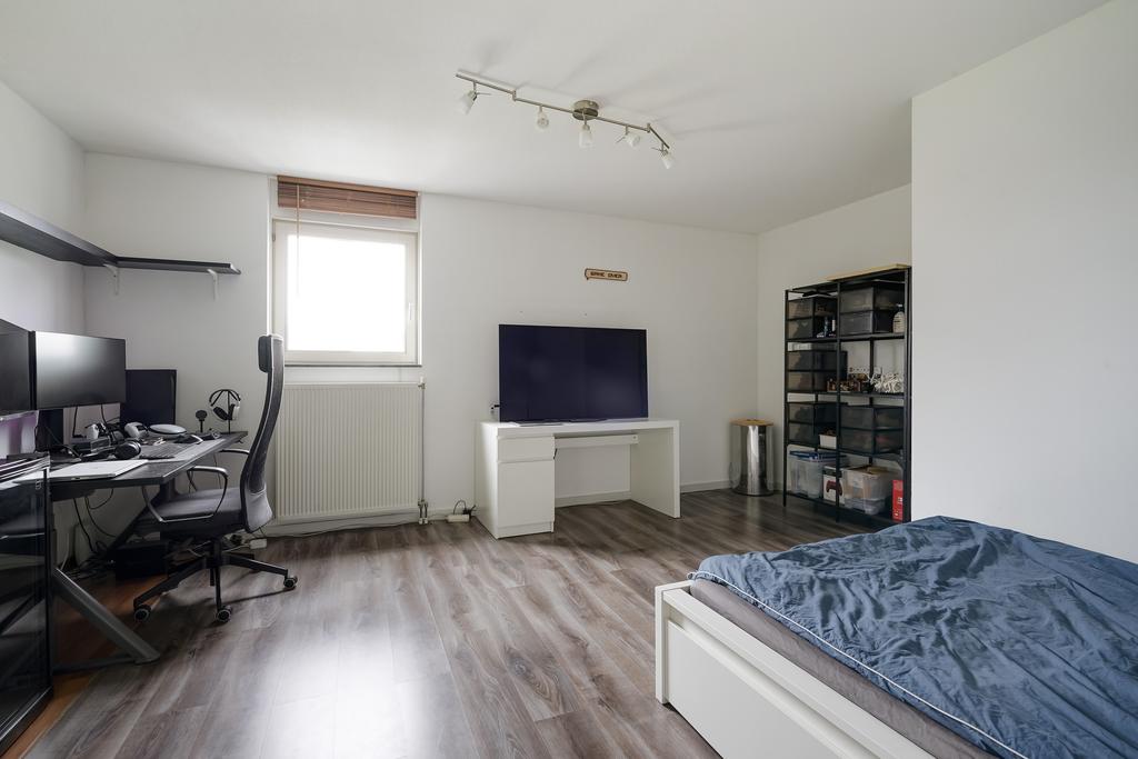 Op de 2e verdieping een ruime slaapkamer aan de voorzijde. Via de overloop heb je toegang tot het dakterras. Op de overloop de opstelplaats voor de HR combi-ketel (Remeha 2016), een warmte terugwin systeem en de omvormer unit voor de zonnepanelen (10 stuks en in eigendom). In dit gedeelte vind je ook de opstelling voor de wasmachine en wasdroger en een tweede wastafelmeubel.