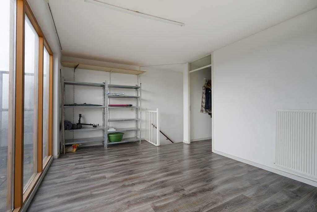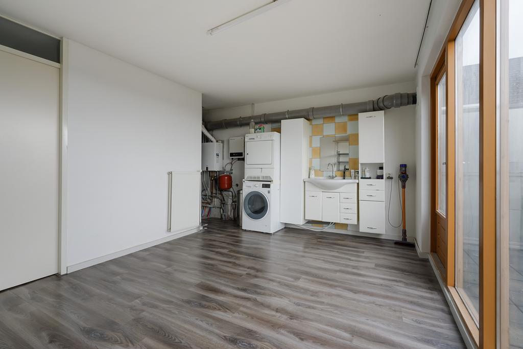 On the 2nd floor a spacious bedroom at the front. You have access to the roof terrace via the landing. On the landing is the installation location for the HR combi boiler (Remeha 2016), a heat recovery system and the inverter unit for the solar panels (10 pieces and owned). In this section you will also find the setup for the washing machine and dryer and a second washbasin.