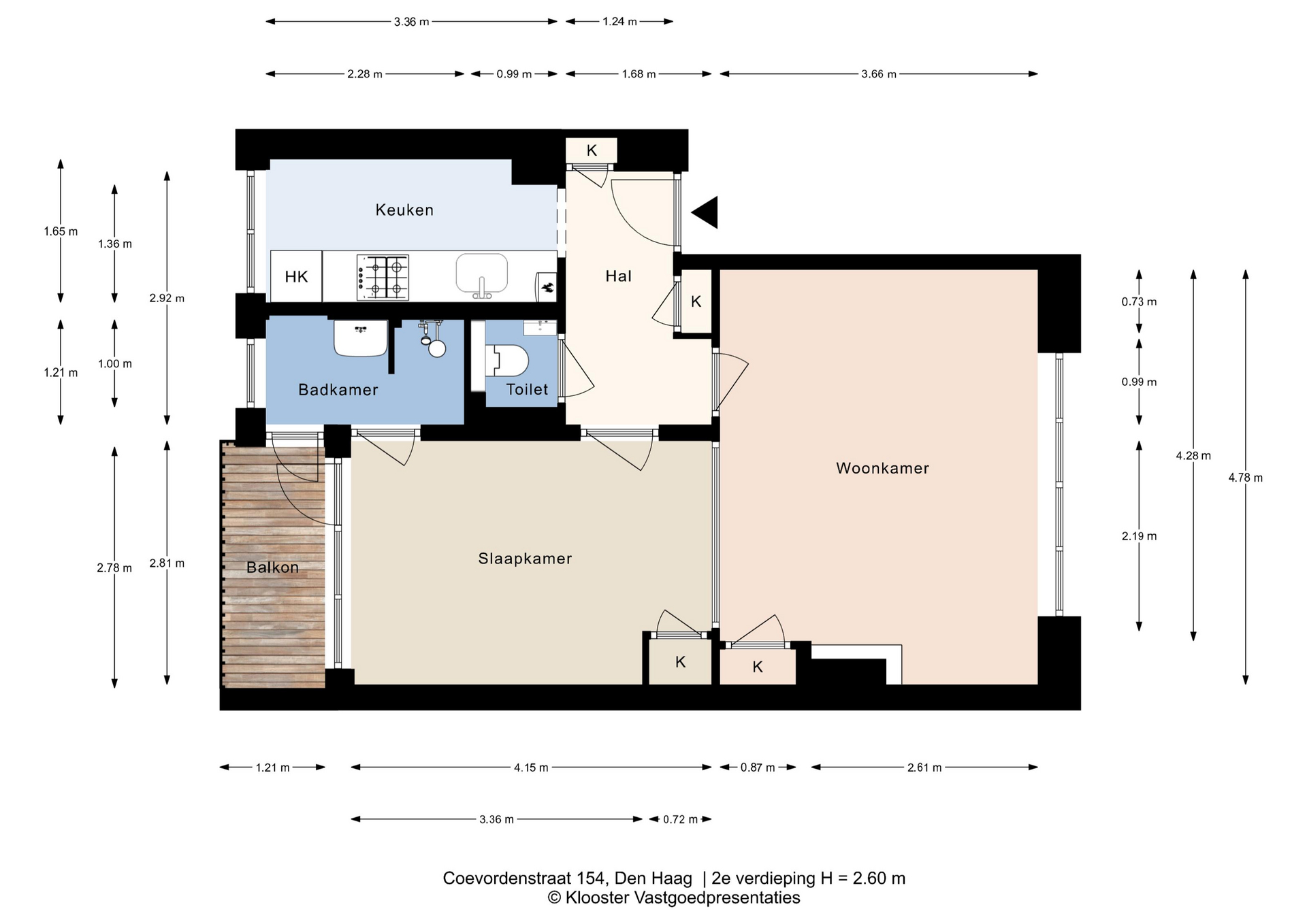 Verderop door de gang is de woonkamer te bereiken die zeer licht is door de grote raampartijen (zie foto's). De apart gesitueerde toiletruimte uit 2023 is voorzien van strakke betegeling, hangtoilet en fontein. De woonkamer aan de voorzijde is zeer licht door de grote raampartijen (zie foto's). Aan de achterzijde ligt de slaapkamer. Aan de slaapkamer grenst de badkamer met inloopdouche en wastafel. Via zowel de slaapkamer als badkamer is het zonnige balkon te bereiken.