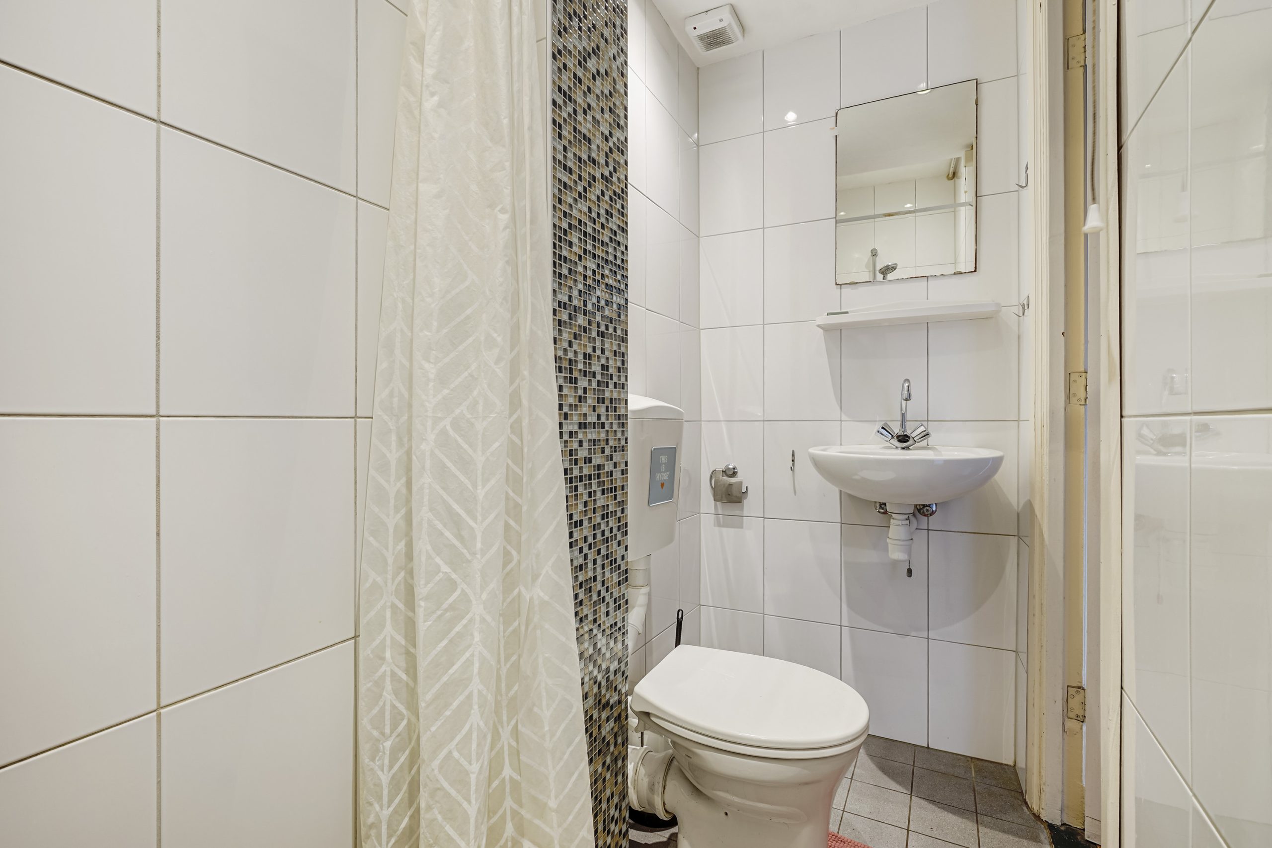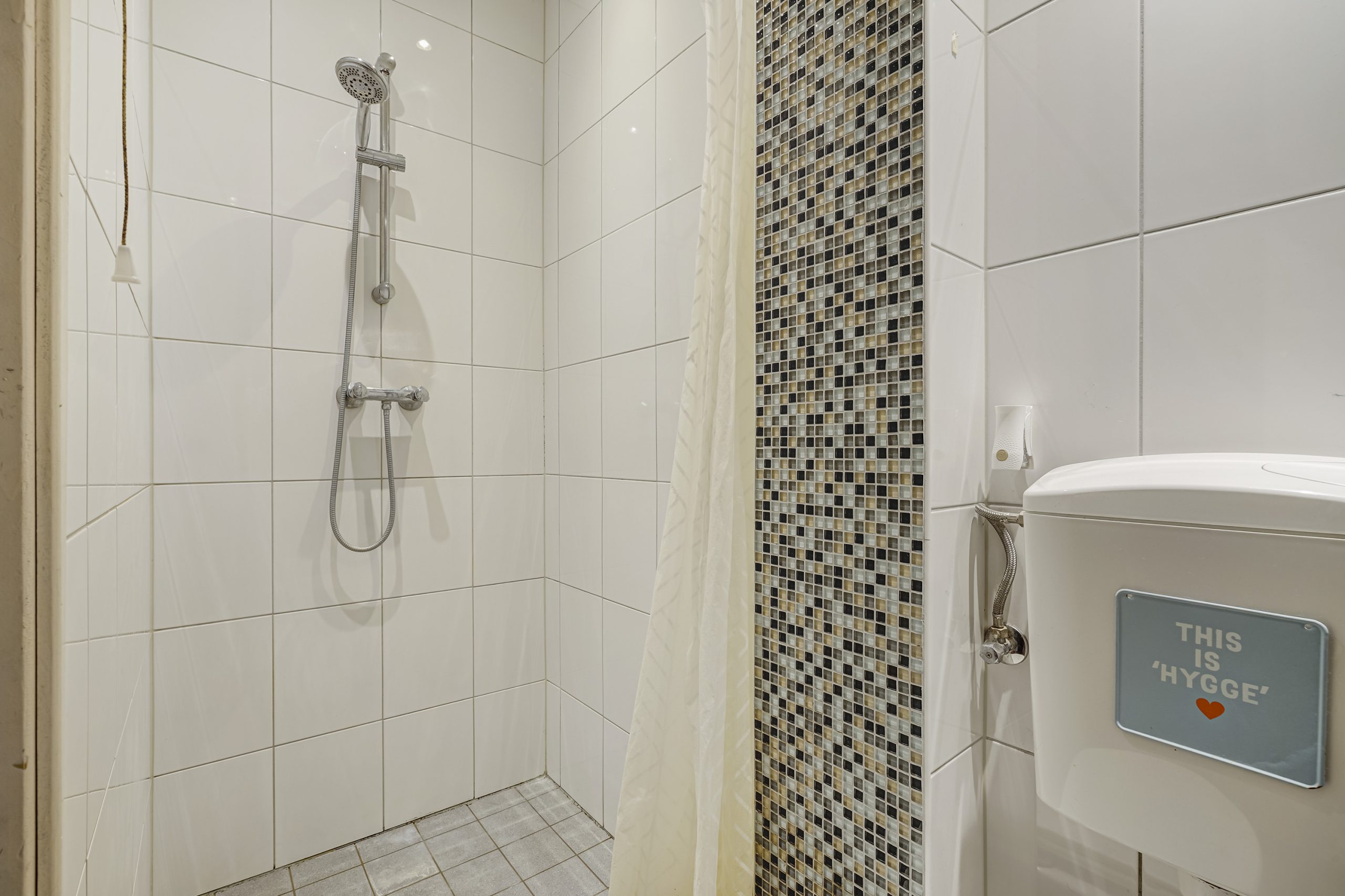 De badkamer is verzorgd en praktisch ingedeeld met douche, wastafel, toilet en aansluiting voor de wasmachine.