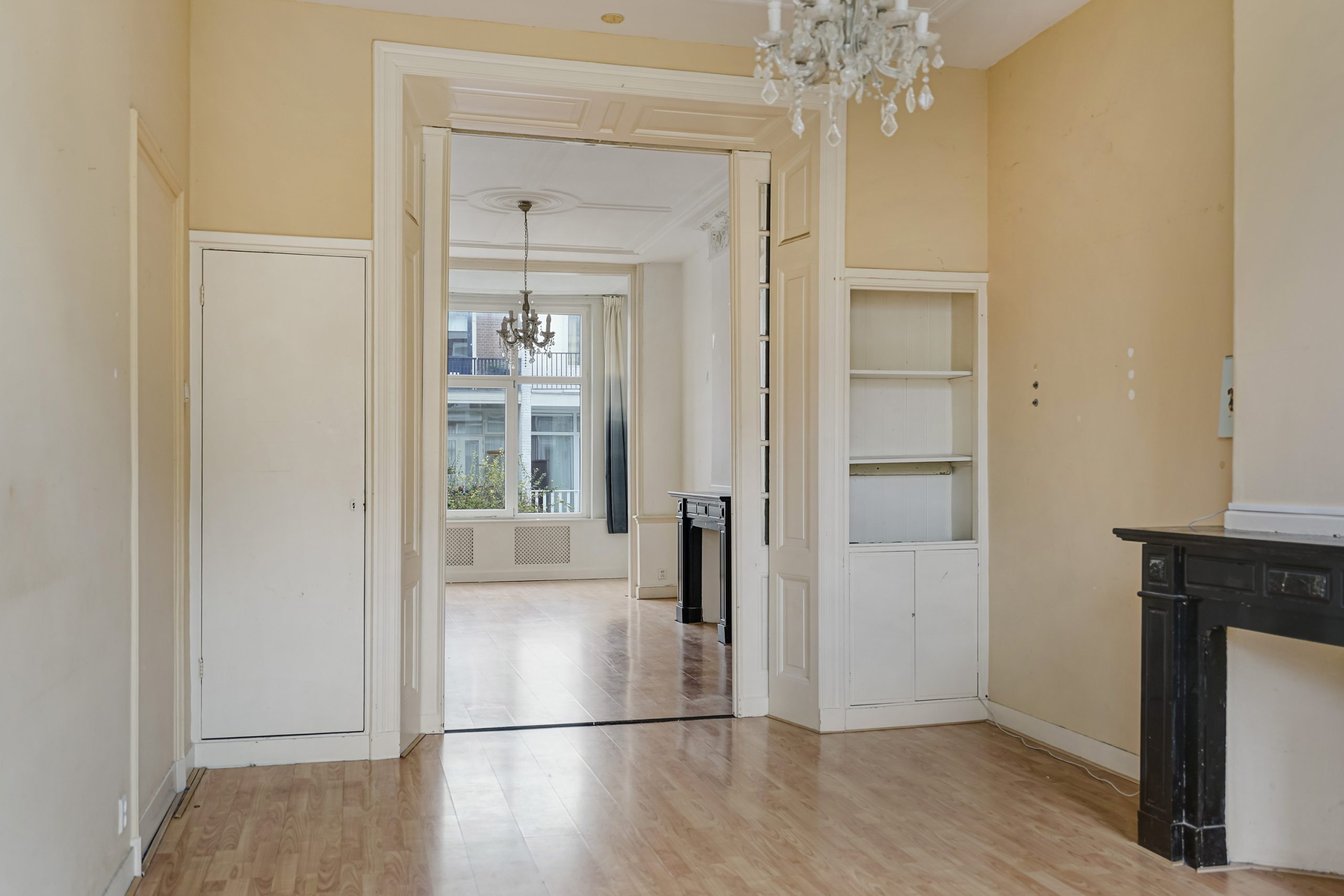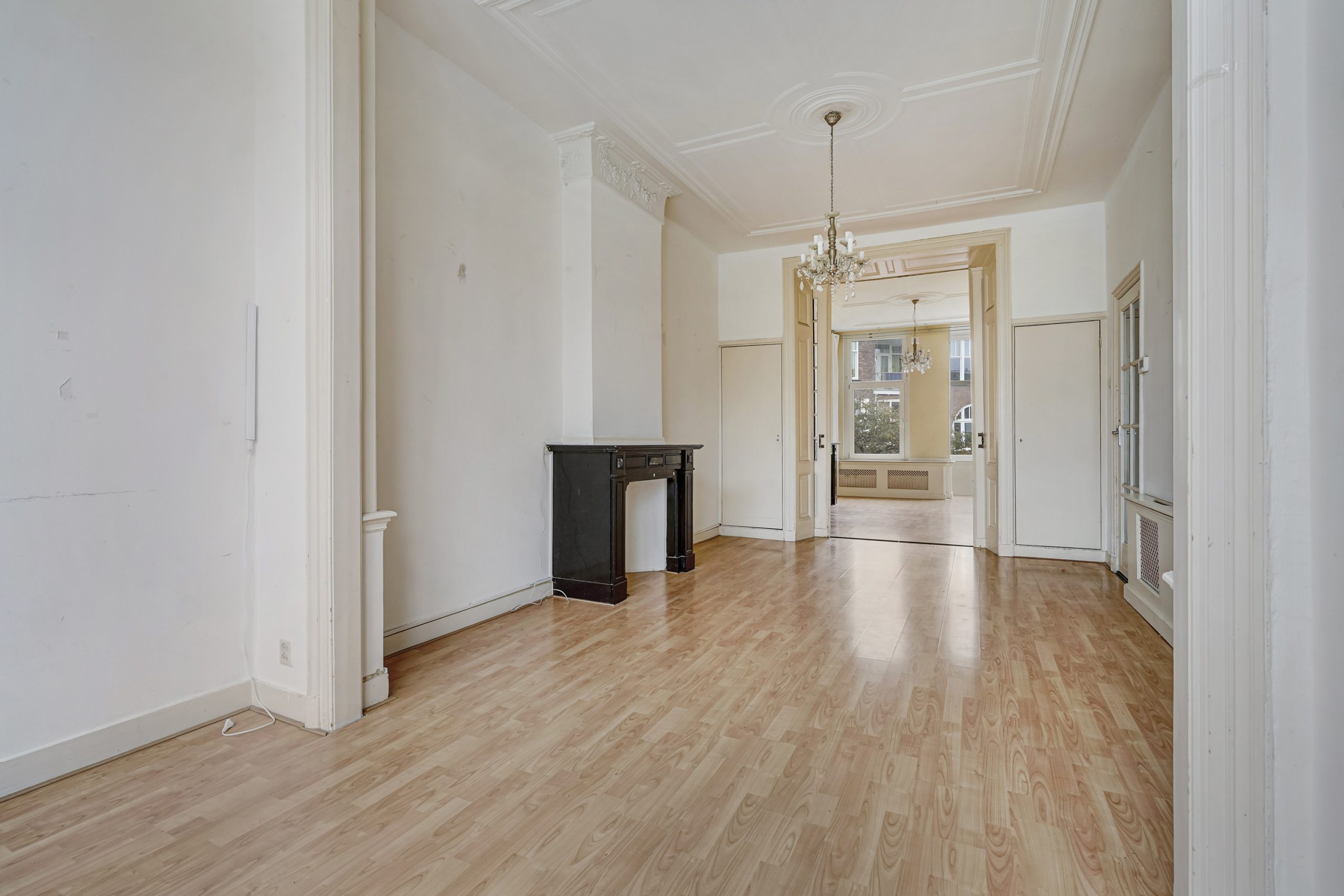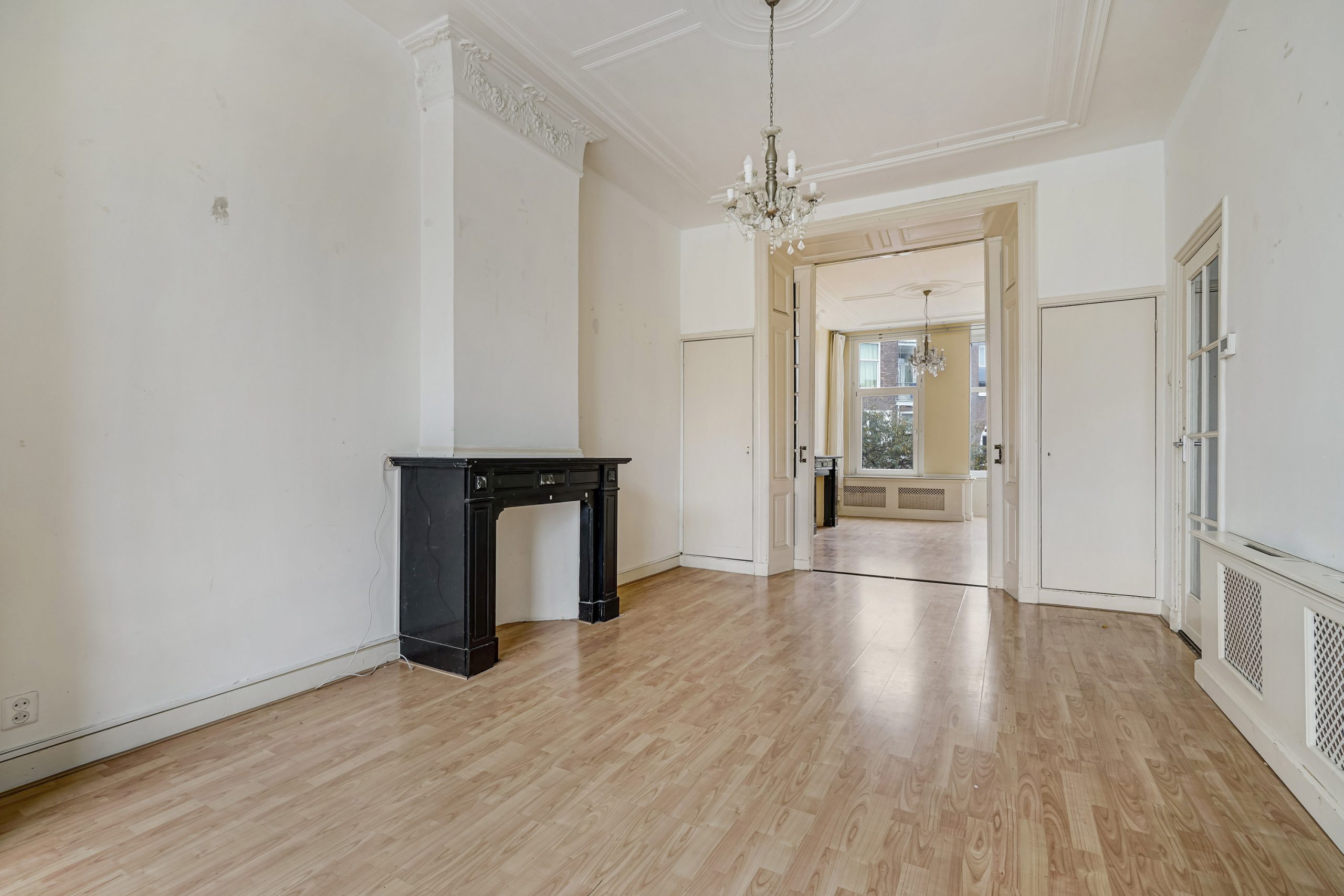 Via het gezamenlijke portiek bereik je de woning op de eerste etage. De entree leidt naar een ruime en lichte woonkamer met prachtig hoge plafonds en authentieke ensuite deuren die de voor- en achterkamer op sfeervolle wijze van elkaar scheiden. De grote raampartijen en het hoge plafond zorgen voor een bijzonder ruimtelijk gevoel.