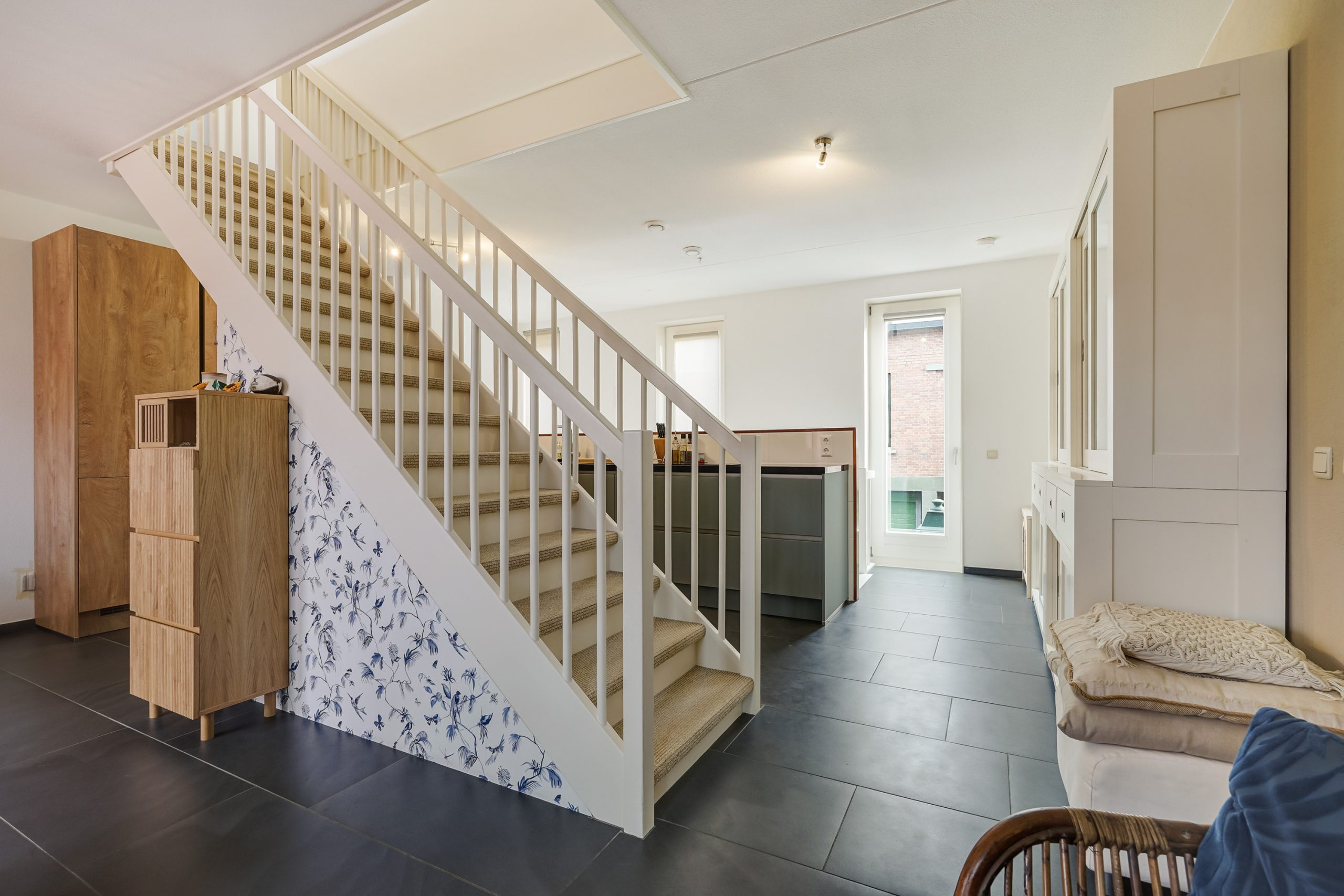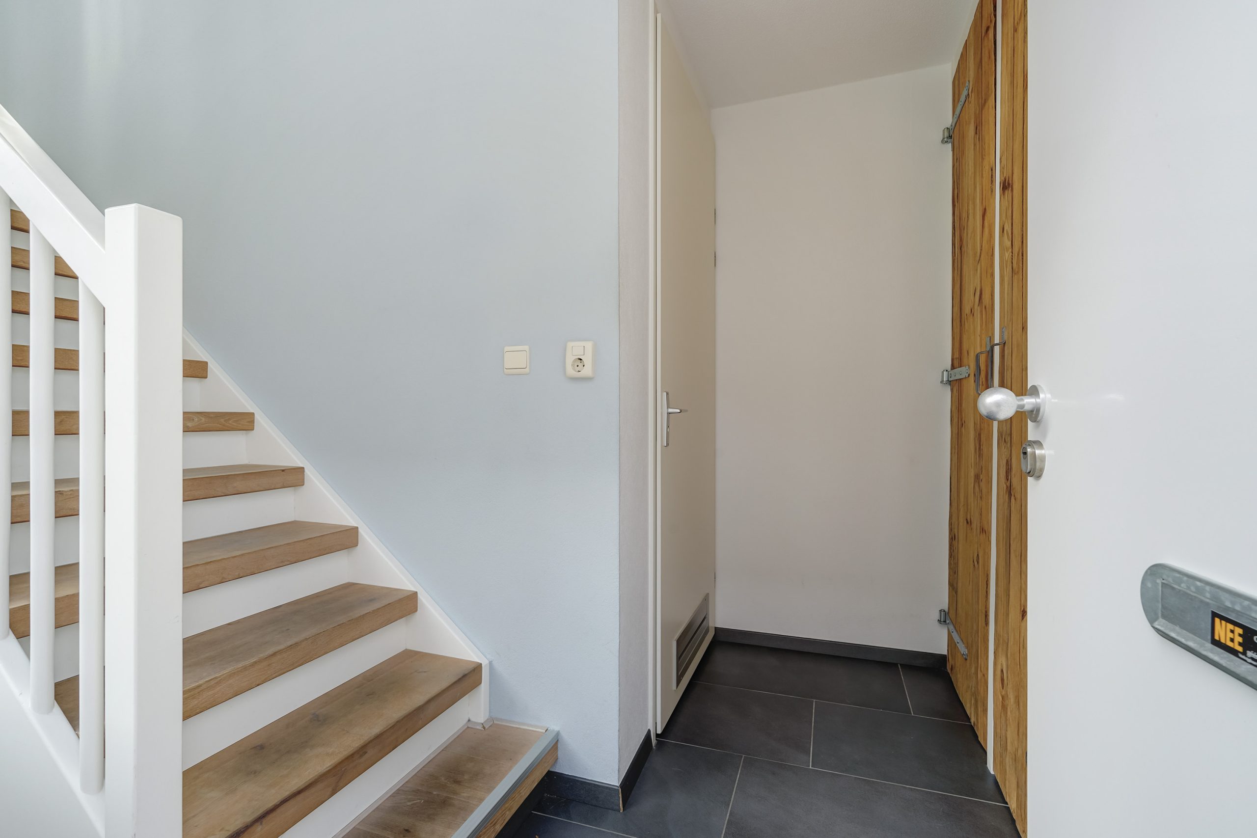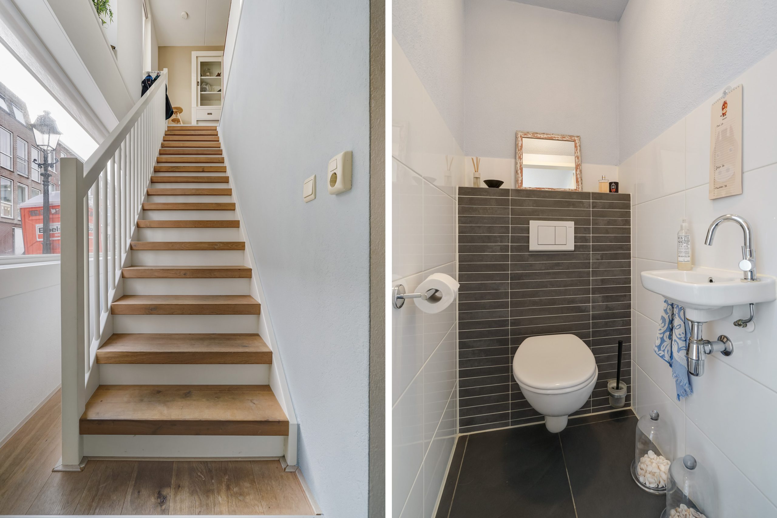 Toegang tot de woning op straatniveau. U betreedt de hal met meterkast en een modern toilet met fontein. Via de trap bereikt u de eerste verdieping: