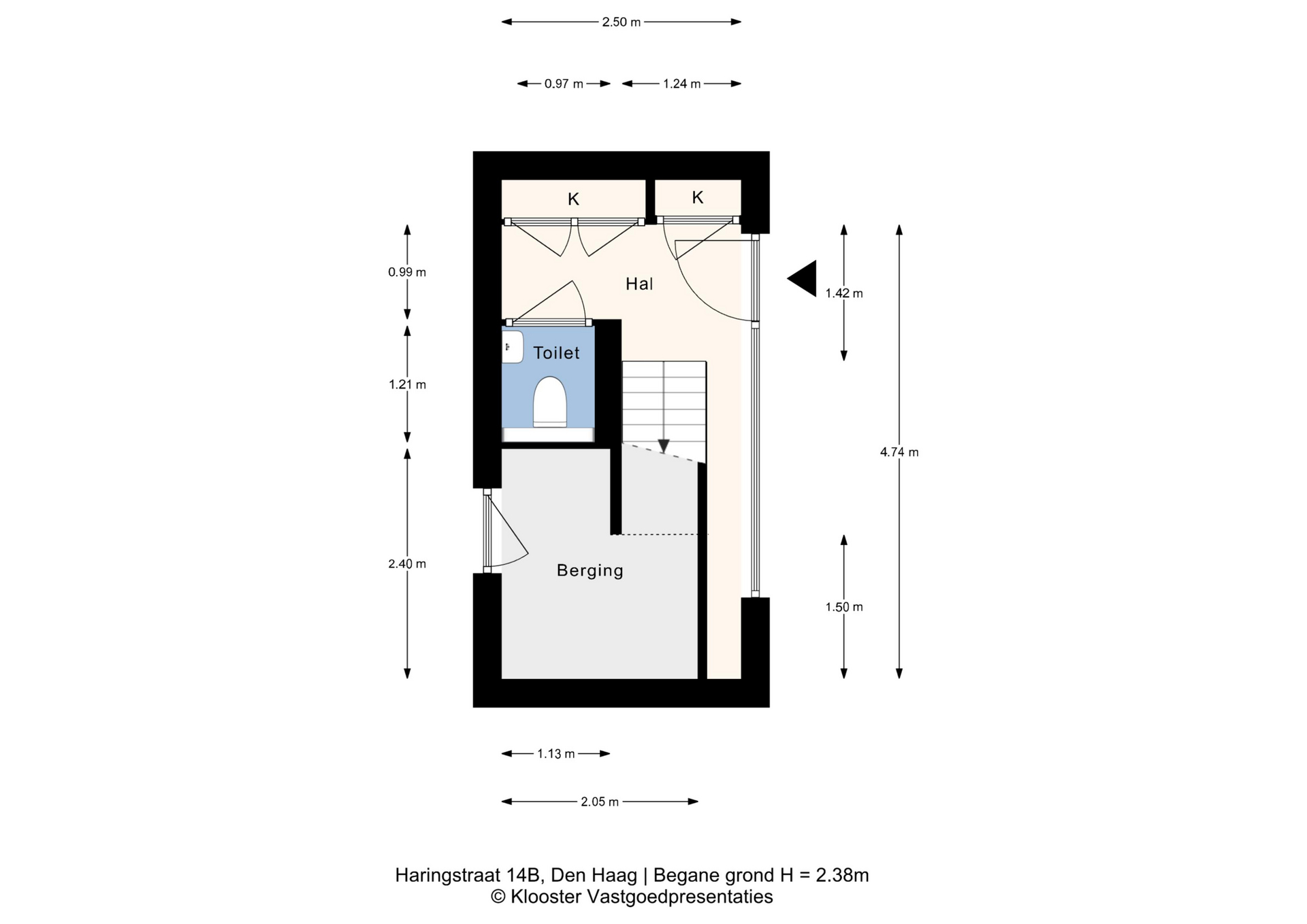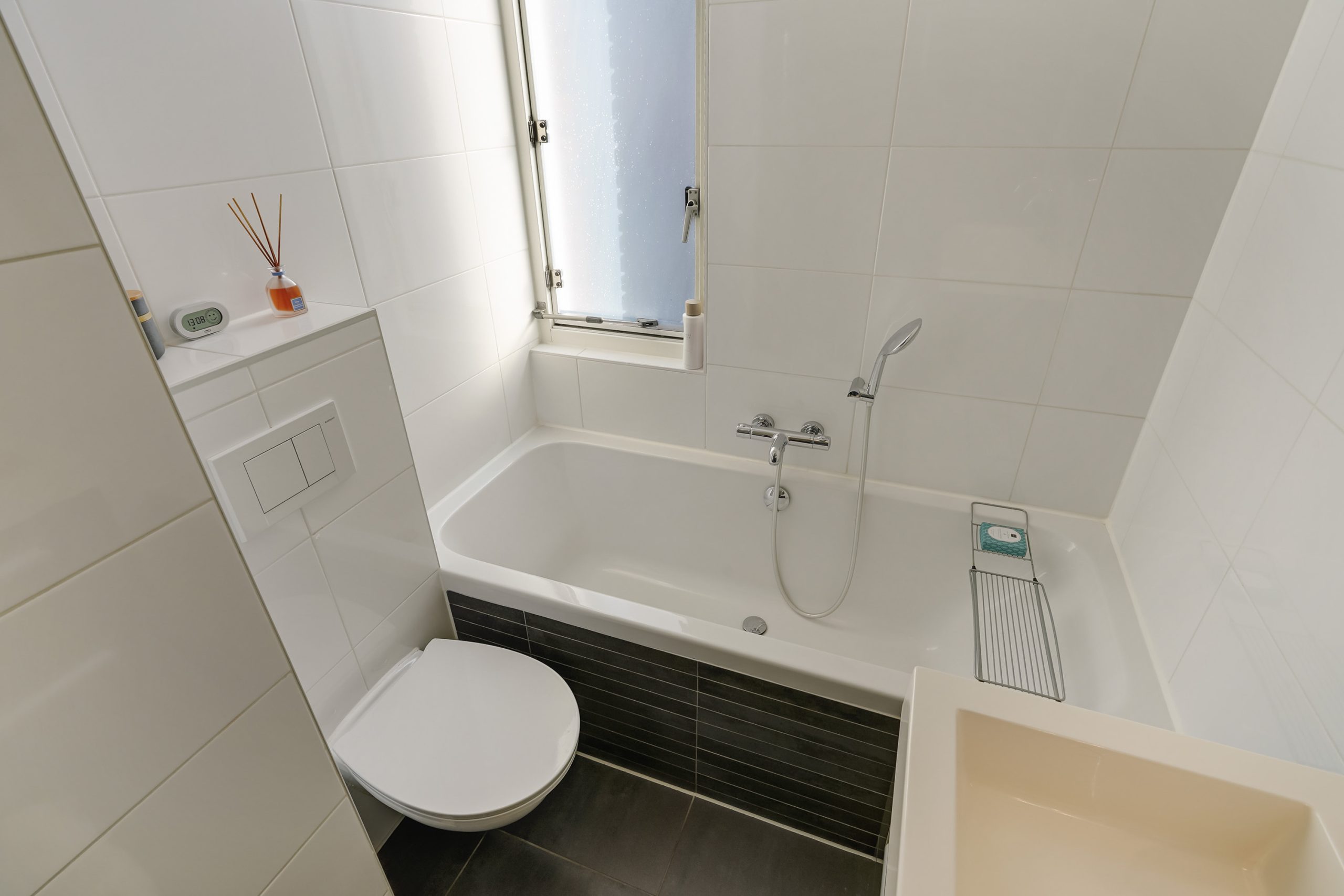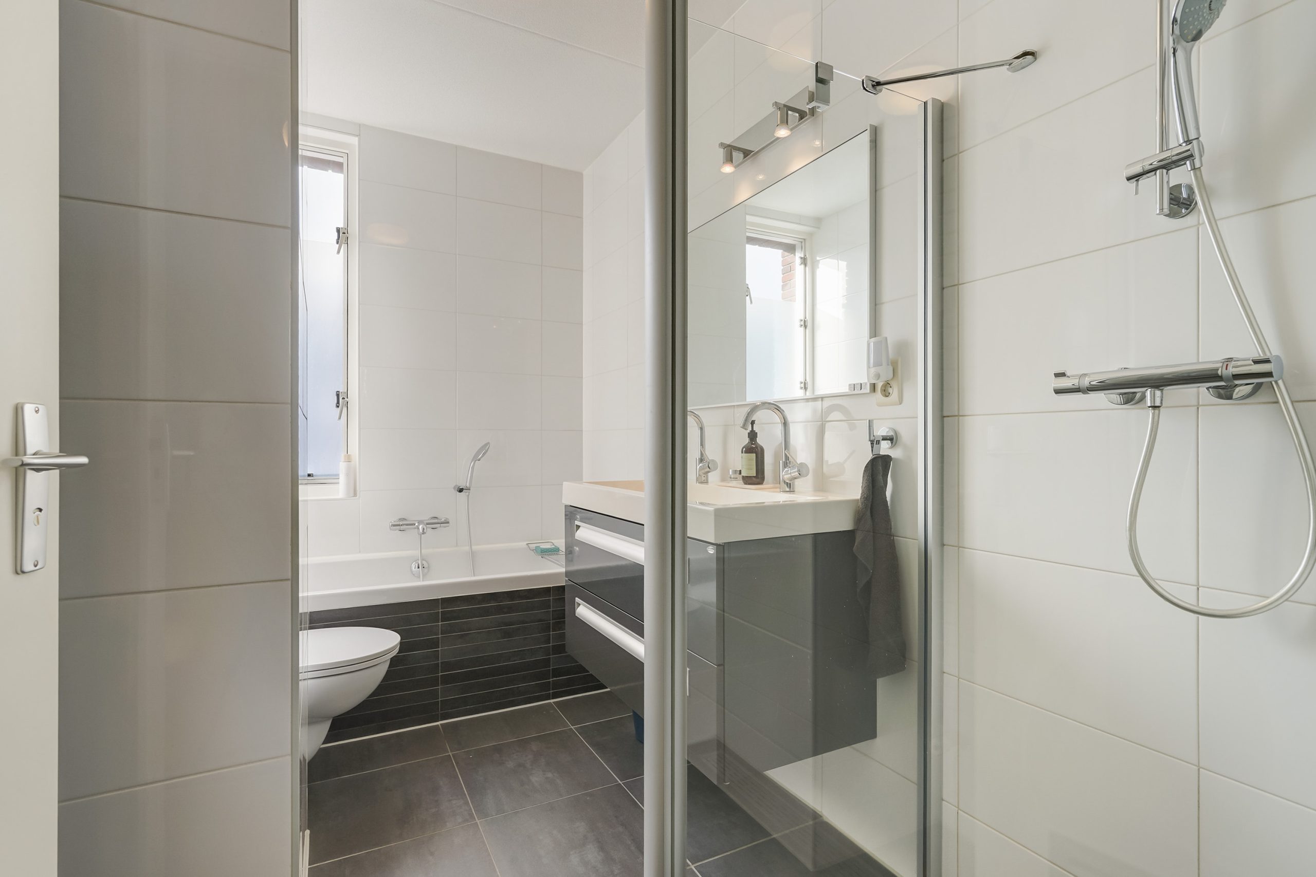 Toegang tot de woning op straatniveau. U betreedt de hal met meterkast en een modern toilet met fontein. Via de trap bereikt u de eerste verdieping: