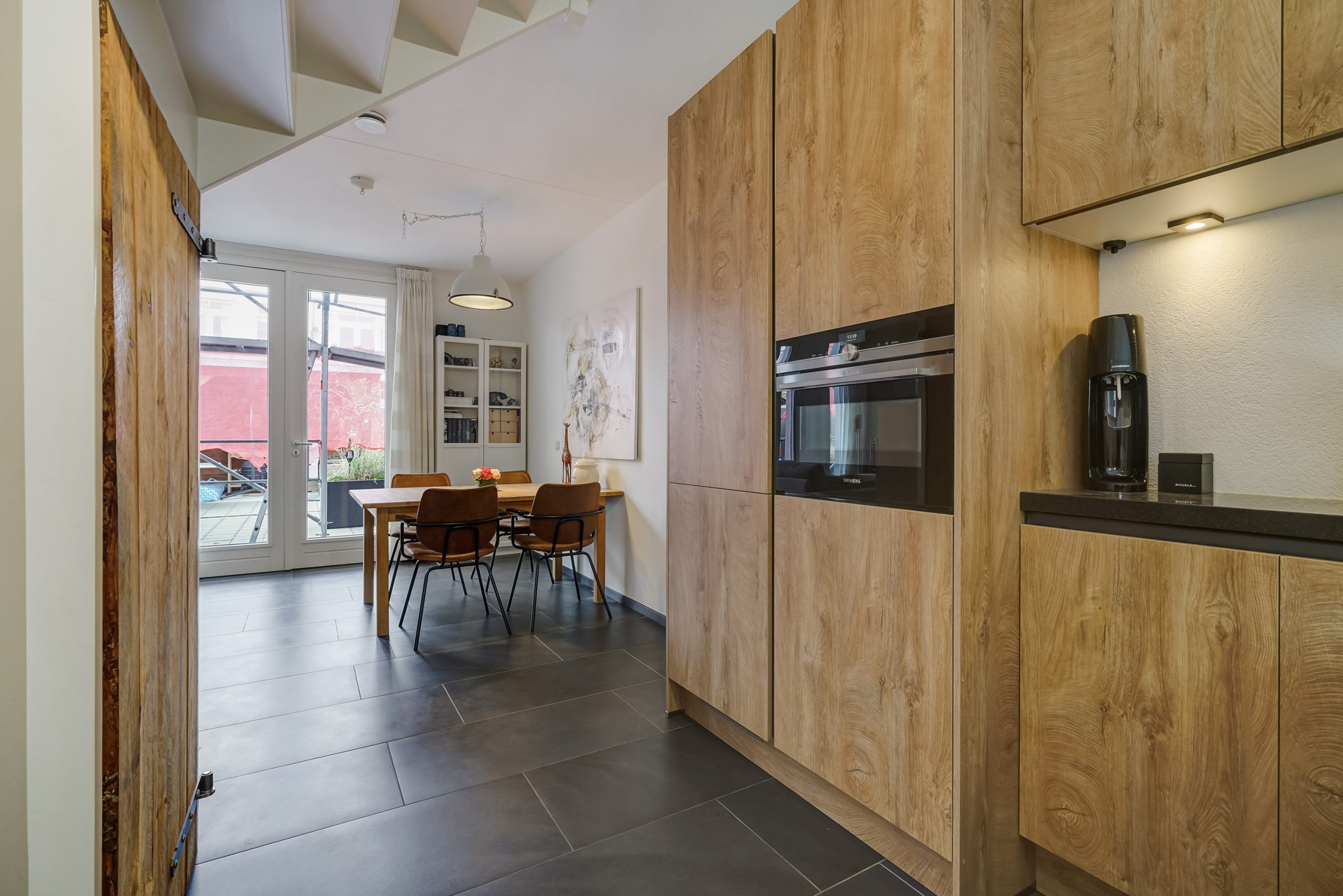 First Floor (Living Area) – Spacious and bright living room with a modern open kitchen. The entire floor features underfloor heating for optimal comfort. The kitchen, completely renewed in 2023, is equipped with top-quality Siemens StudioLine appliances and a Bora induction hob with integrated extraction. Through French doors, you step directly onto the impressive roof terrace (64 m²), complete with a wooden garden house and a covered sitting area. The perfect place to relax on sunny days!