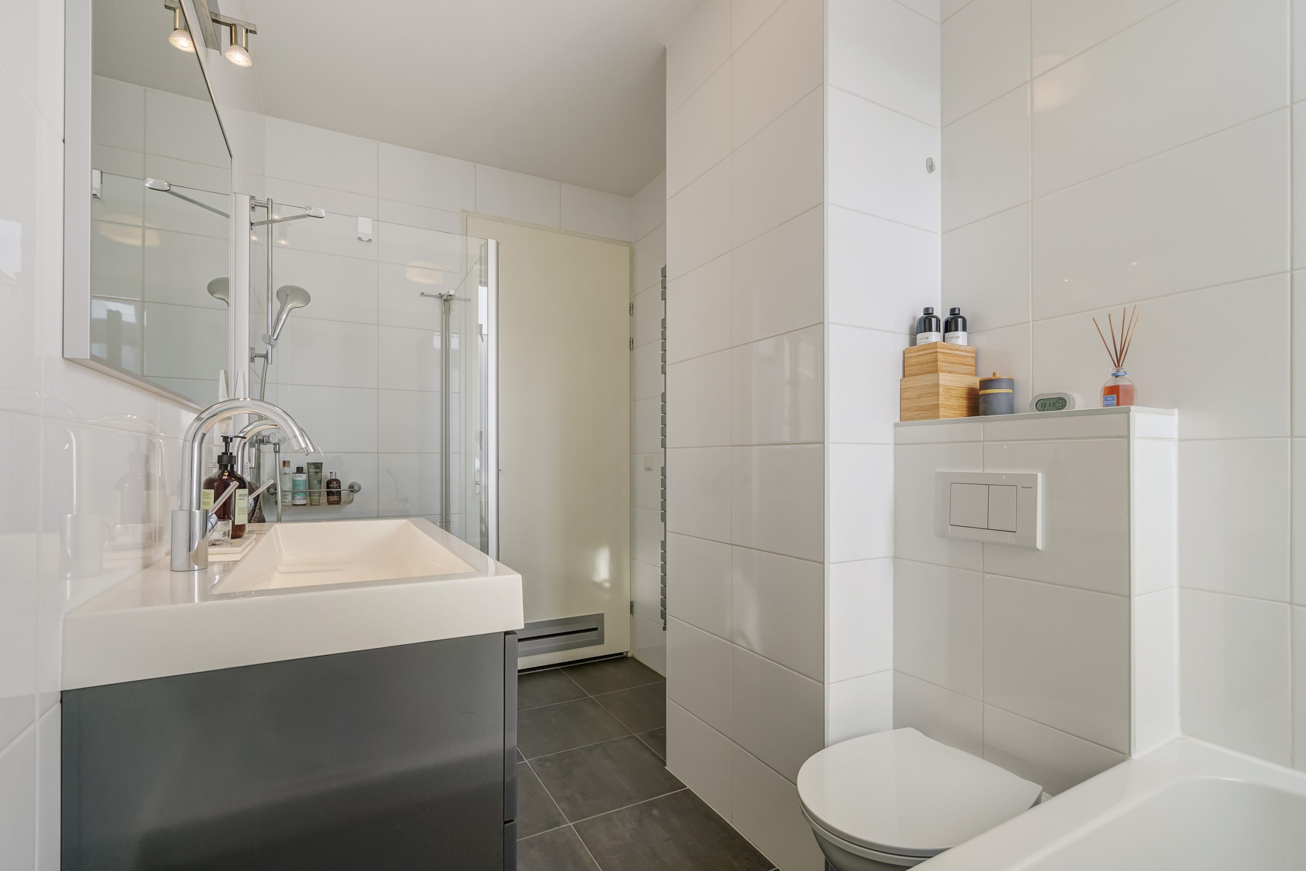 Via openslaande deuren in de woonkamer stapt u direct op het riante dakterras (64m²), compleet met een houten tuinhuis en een overdekt zitgedeelte. Ziet u zichzelf hier al zitten op een heerlijke zomerse dag?
