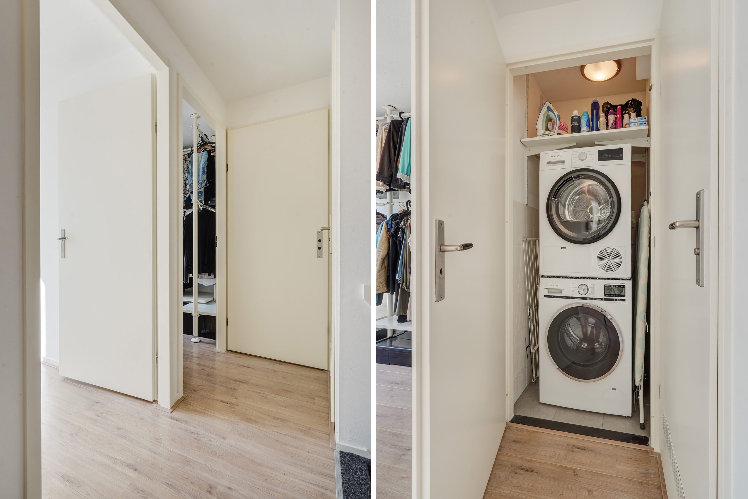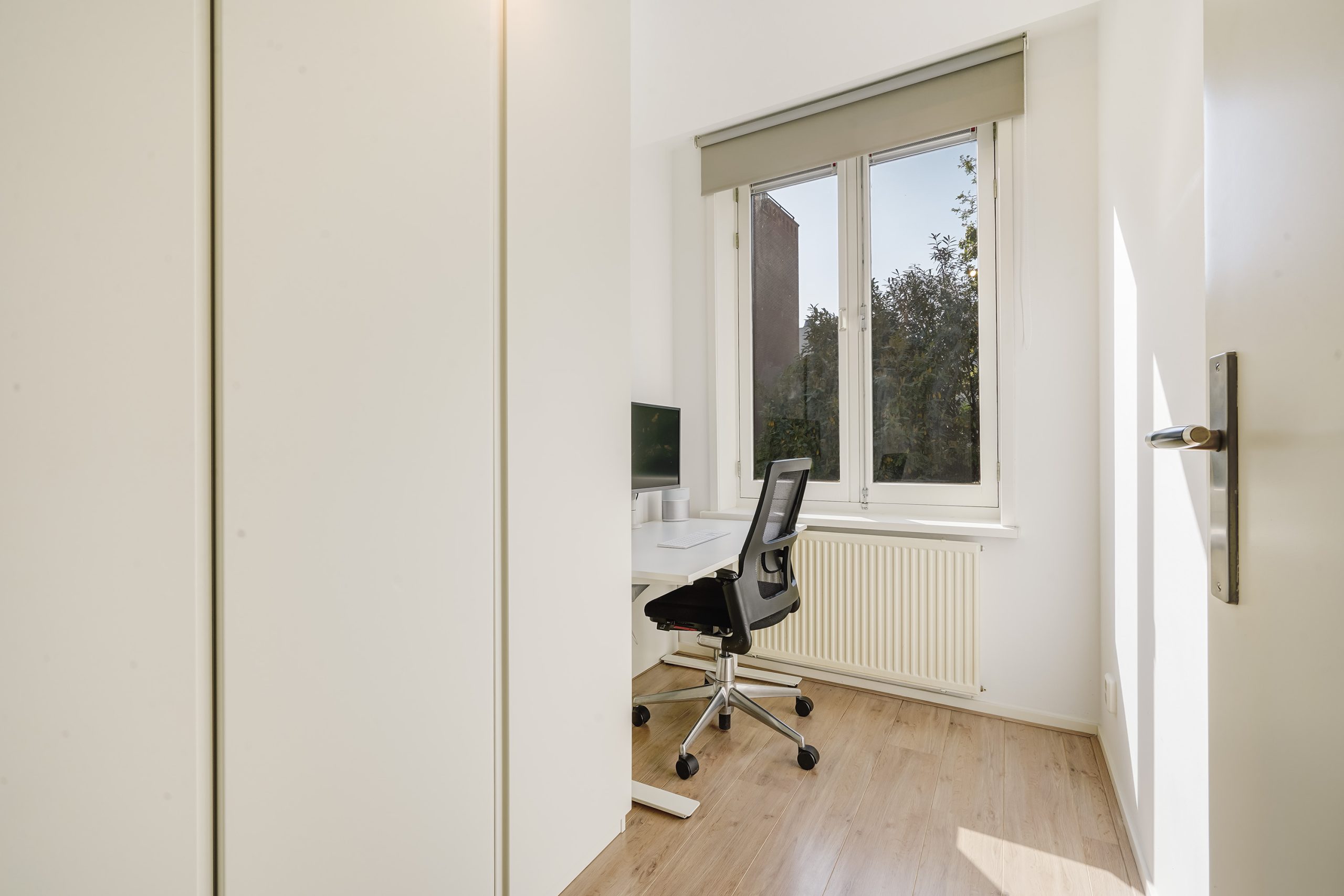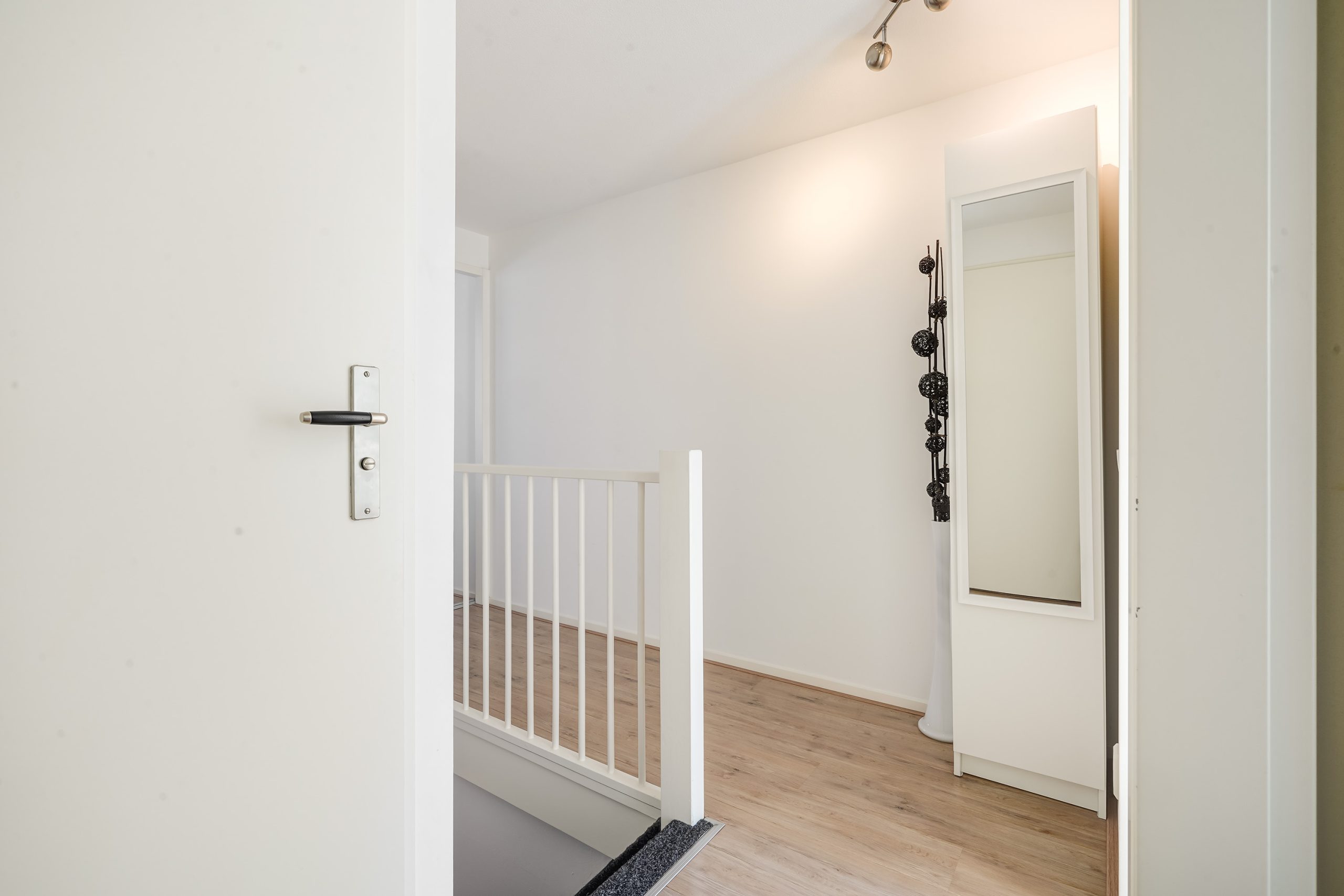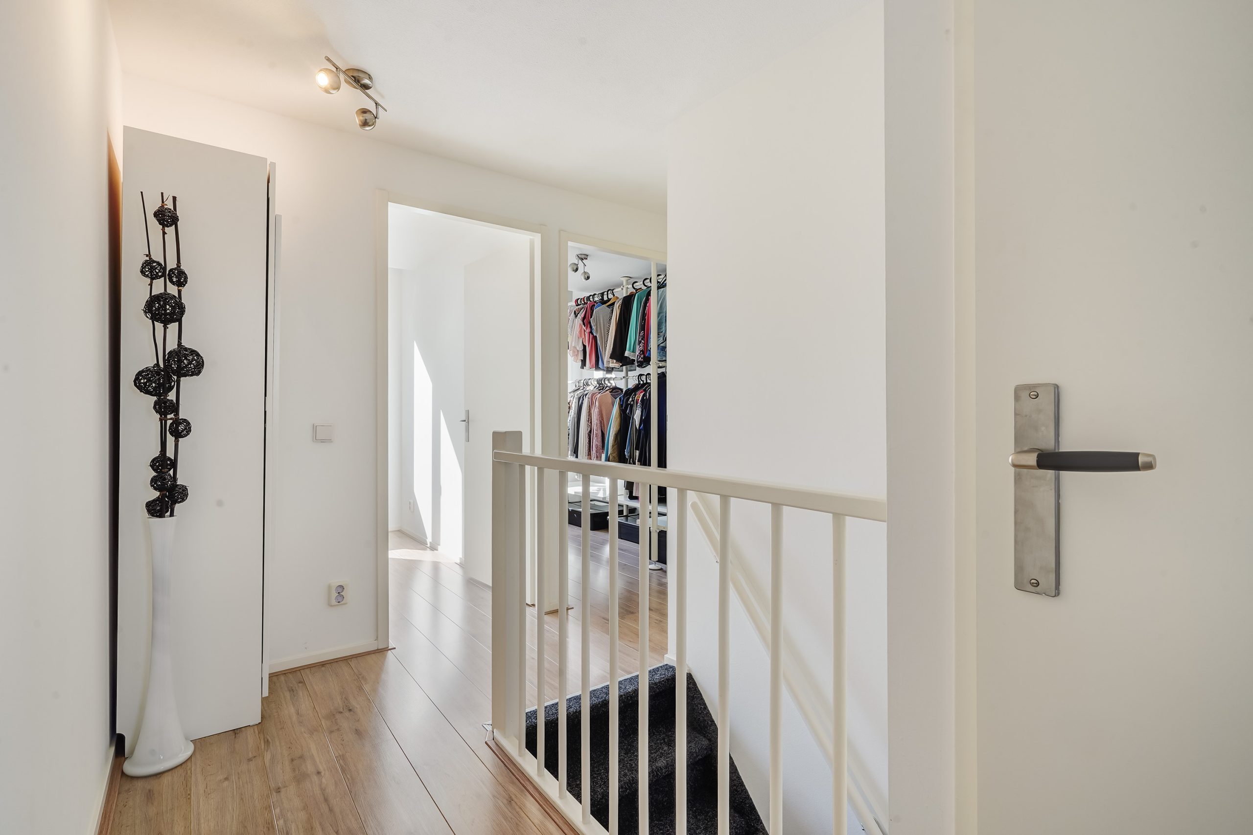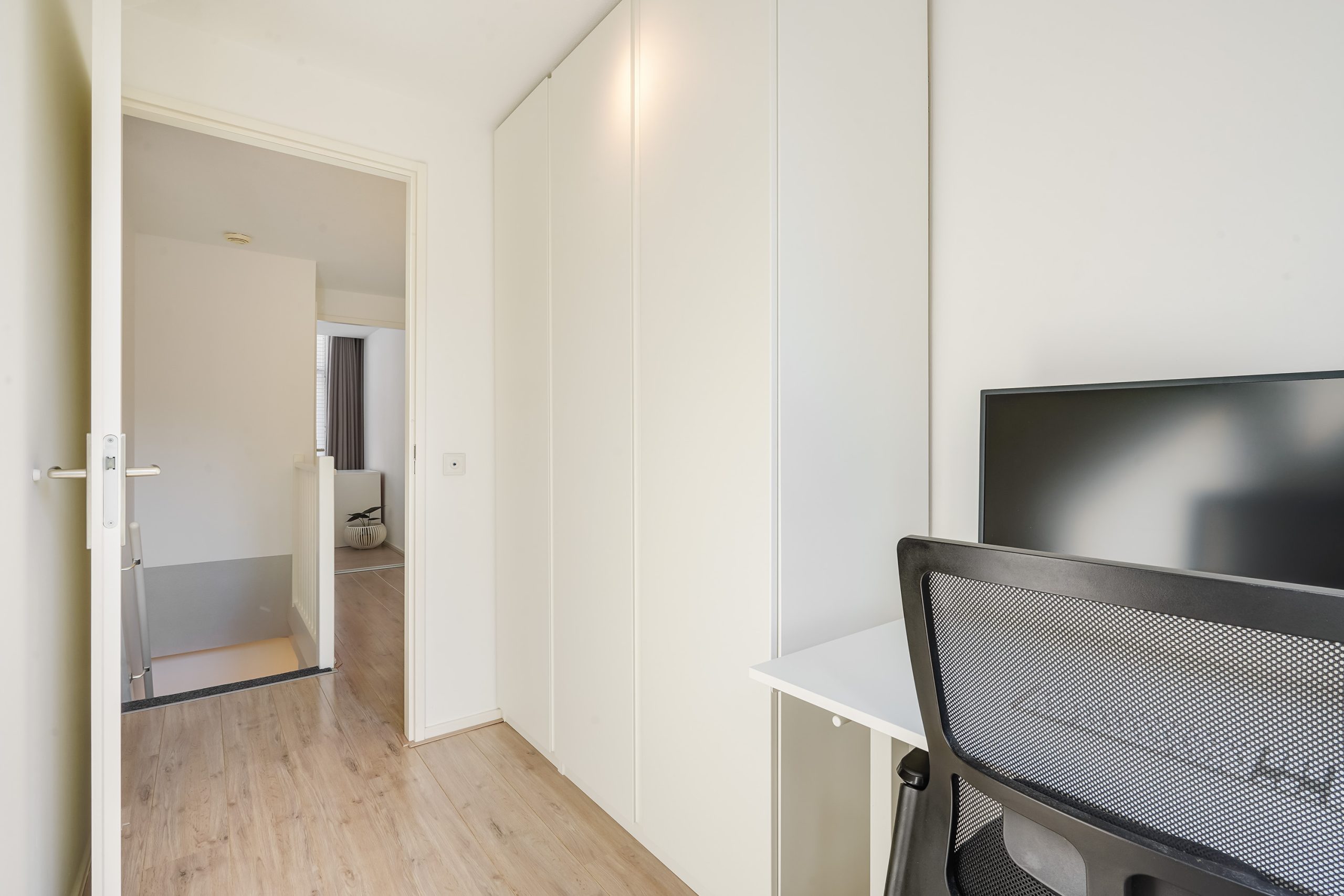 De overloop biedt toegang tot een ruime slaapkamer aan de voorzijde en twee slaapkamers aan de achterzijde, die ook uitstekend dienst kunnen doen als werkruimte of inloopkast. Verder is er een handige aparte kast met aansluitingen voor de wasmachine en droger. De badkamer is voorzien van een inloopdouche, een hangend toilet en een wastafelmeubel.