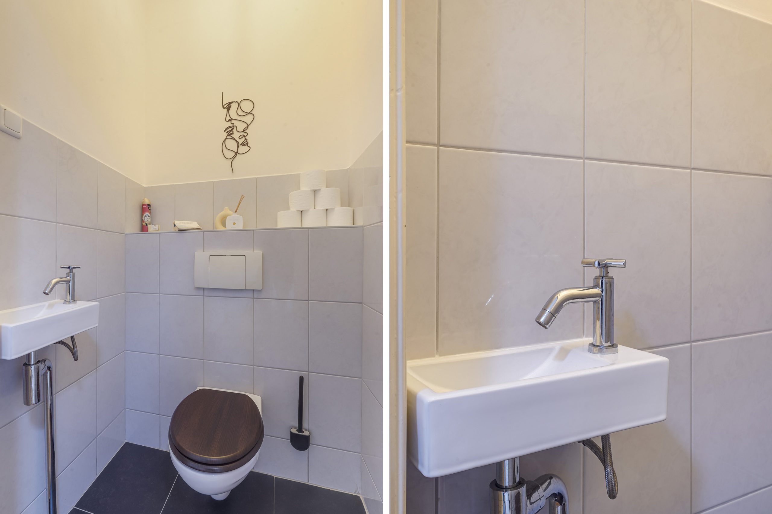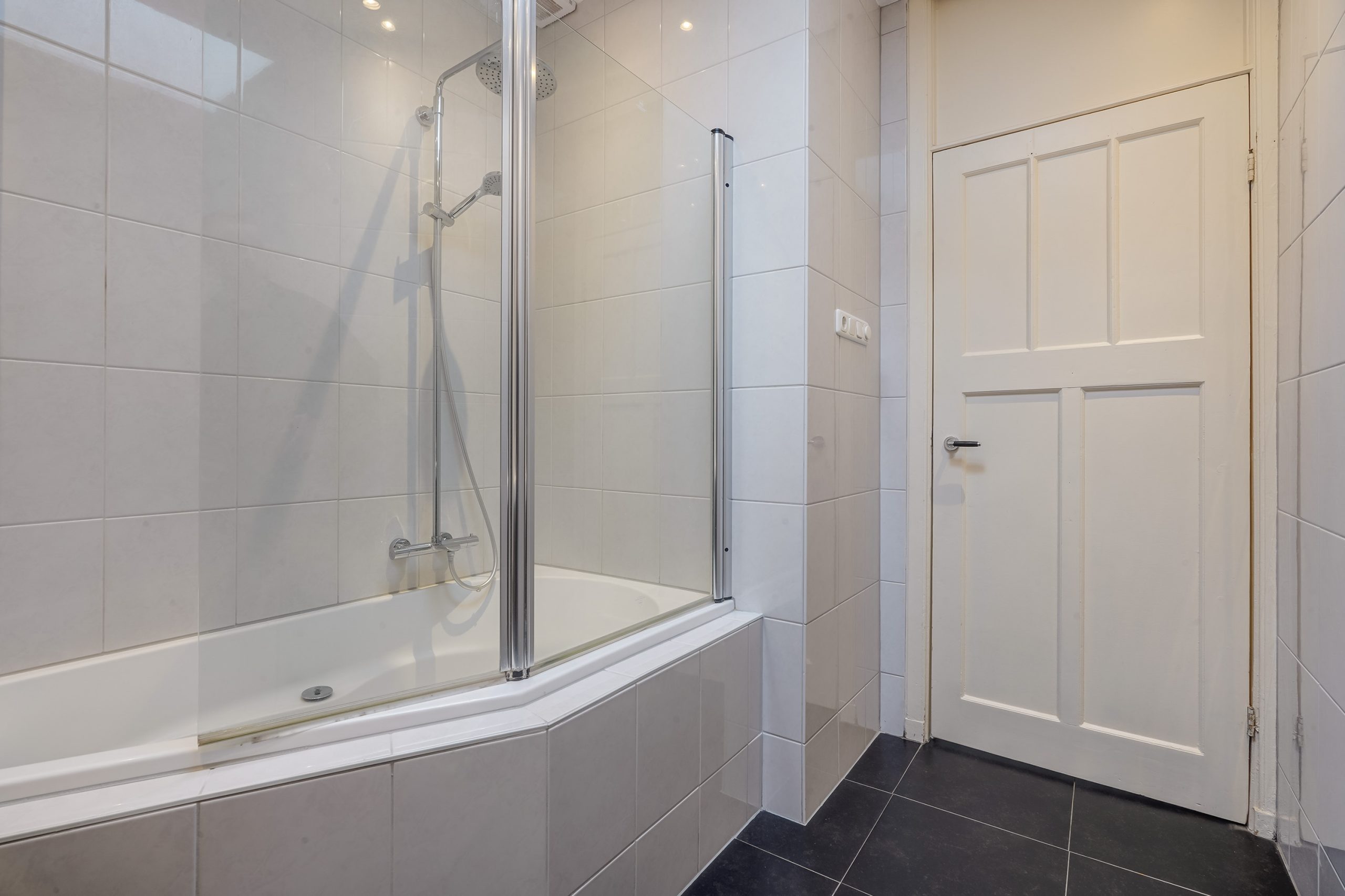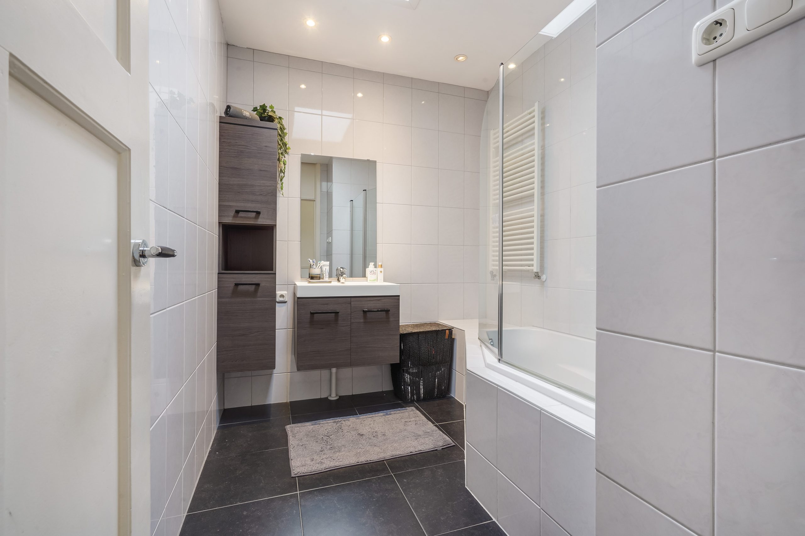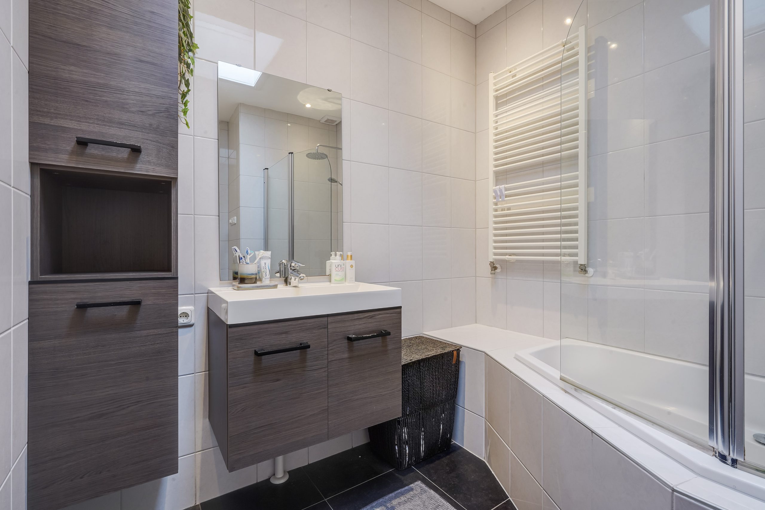De moderne badkamer is voorzien van een ligbad met regendouche, wastafelmeubel met extra kastruimte, handdoekradiator, strakke wandafwerking tot aan het plafond en een dakraam. Het separate toilet, eveneens bereikbaar via de overloop, is voorzien van een hangtoilet, fonteintje en moderne betegeling. Ook hier zorgt een dakraam voor natuurlijke lichtinval.