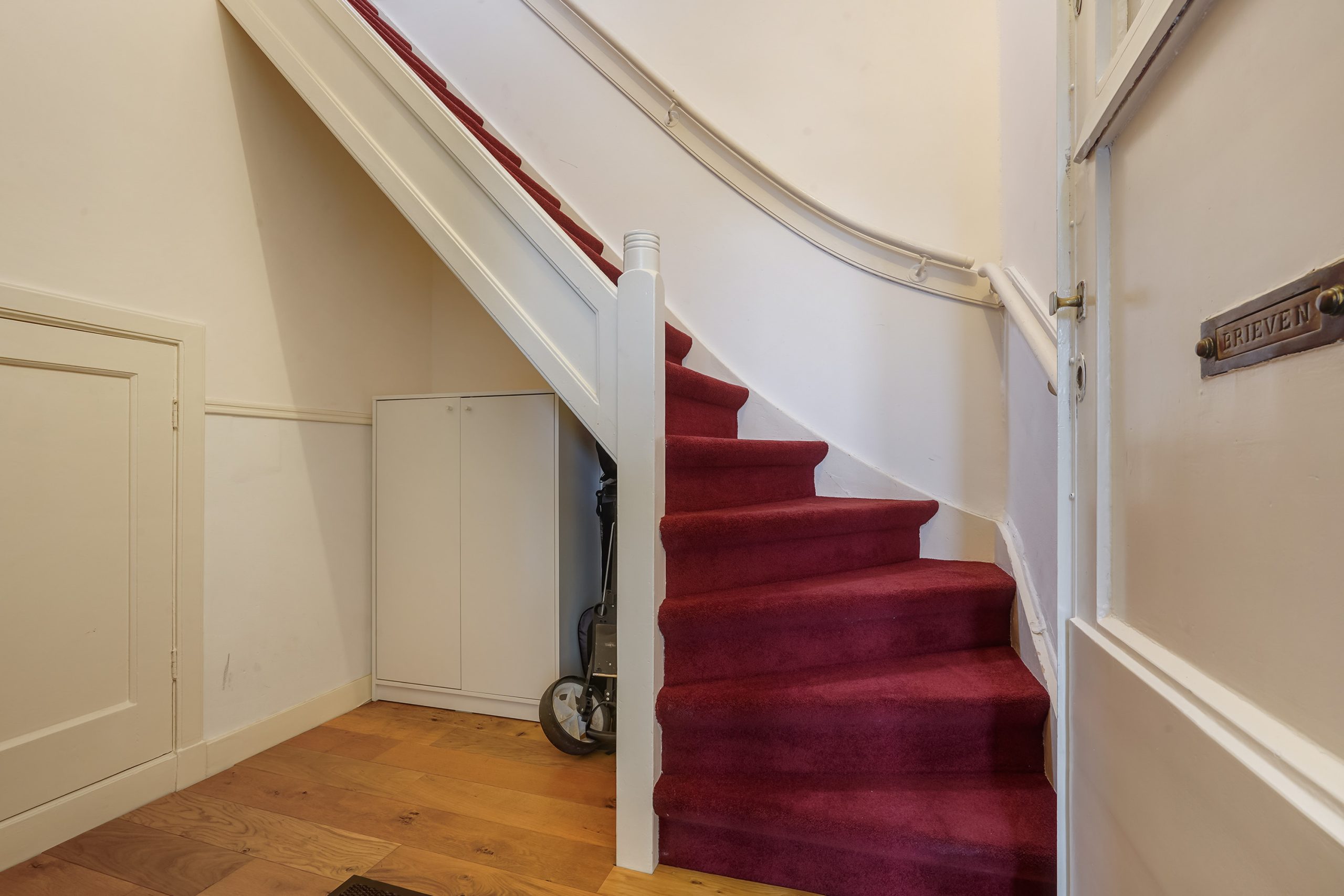 Via het portiek toegang tot de entree, waar de meterkast en overige nutsvoorzieningen netjes zijn weggewerkt. De ruimte onder de trap is open gelaten en biedt een diepe bergruimte. Via de trap bereikt u de woonverdieping. De lichte woonkamer met hoge plafonds beschikt over een open keuken met inbouwapparatuur van goede kwaliteit. De keuken is voorzien van een 5-pits gaskookplaat, nieuwe Siemens recirculatiekap, nieuwe combimagnetron, Siemens vaatwasser en een ruime koel-vriescombinatie.