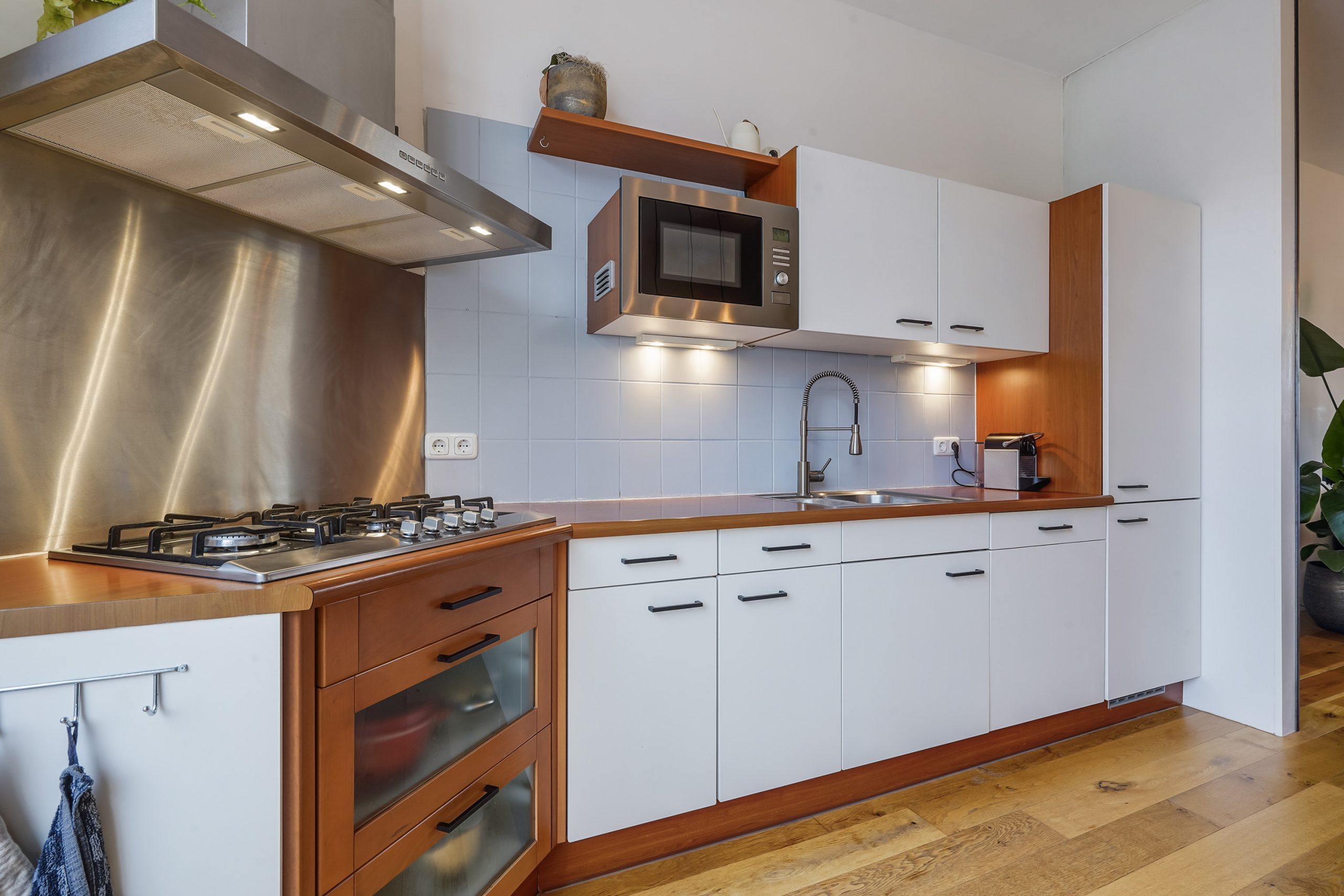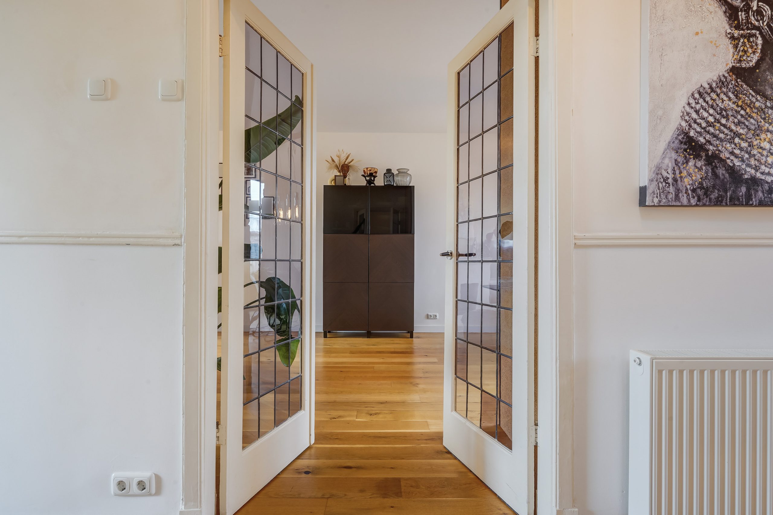 Through the communal entrance, you reach the private entryway, where the fuse box and utilities are neatly concealed. The space under the stairs is open, providing a deep storage area. A staircase leads to the main living floor. The bright living room with high ceilings features an open kitchen with quality built-in appliances, including a 5-burner gas stove, a new Siemens recirculation extractor hood, a new combi microwave, a Siemens dishwasher, and a spacious fridge-freezer combination.