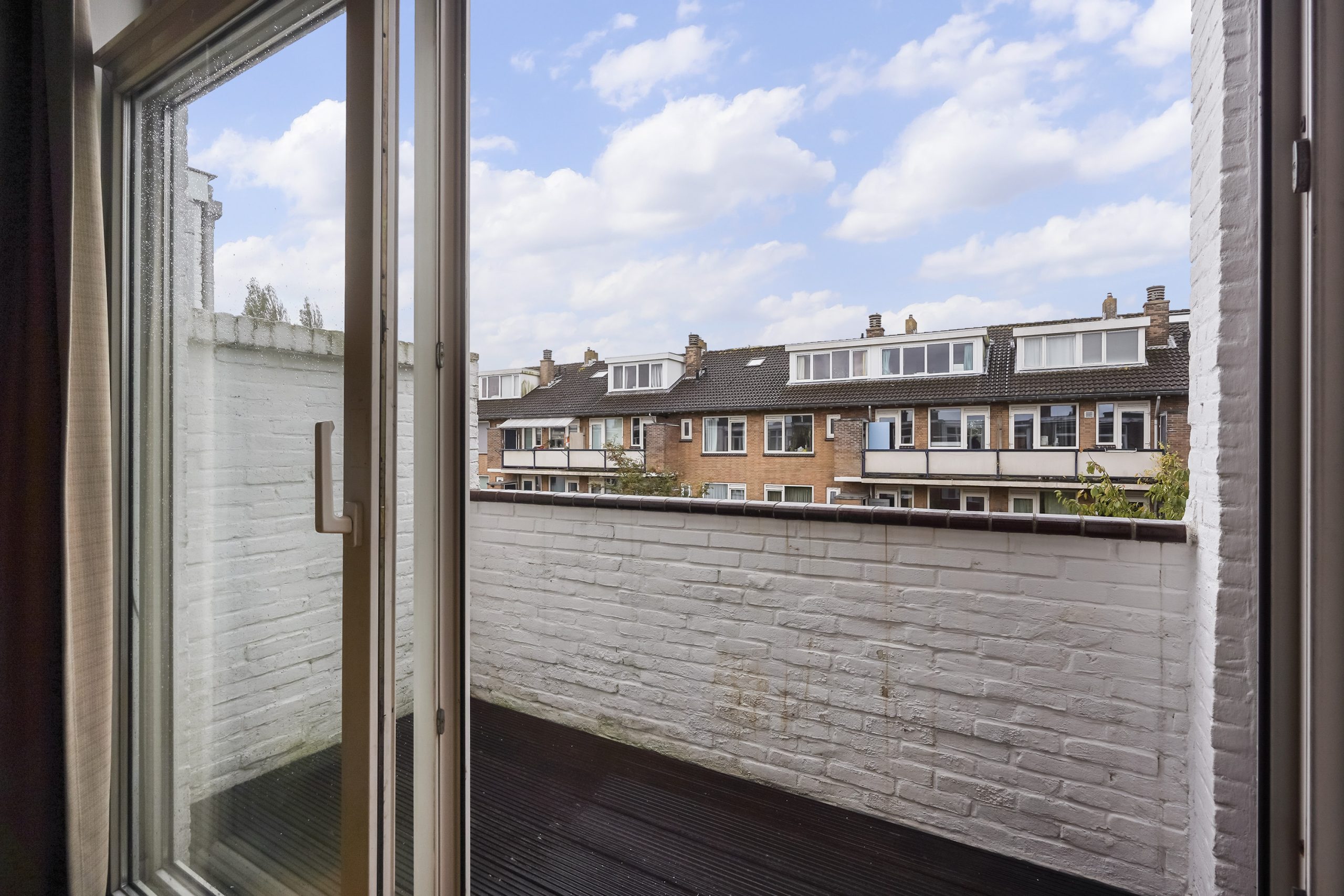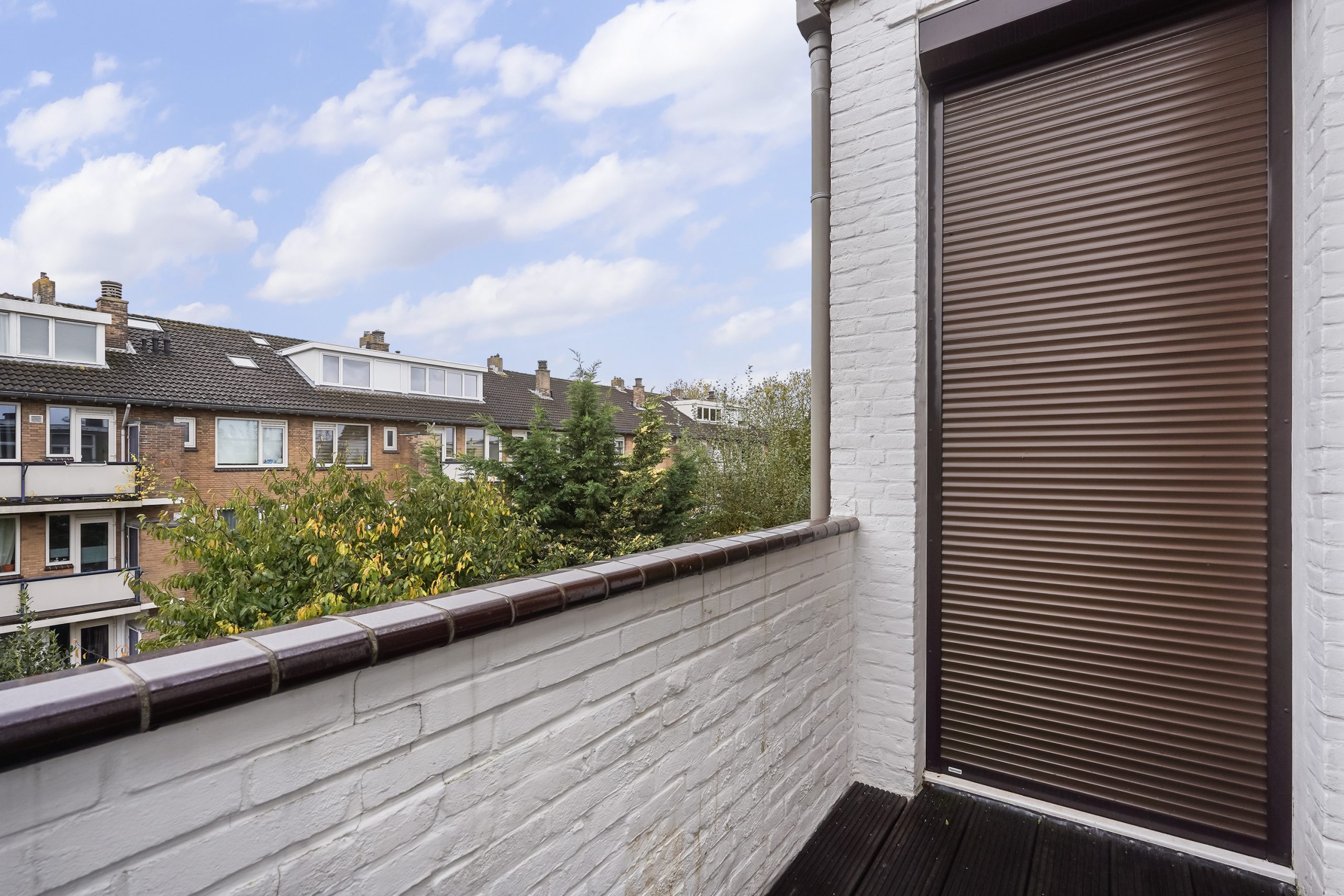 Via een schuifdeur aan de achterzijde van de woonkamer bereikt u het zonnige balkon op het zuidwesten, voorzien van zonwering en een ruime balkonkast met elektrische rolluik.