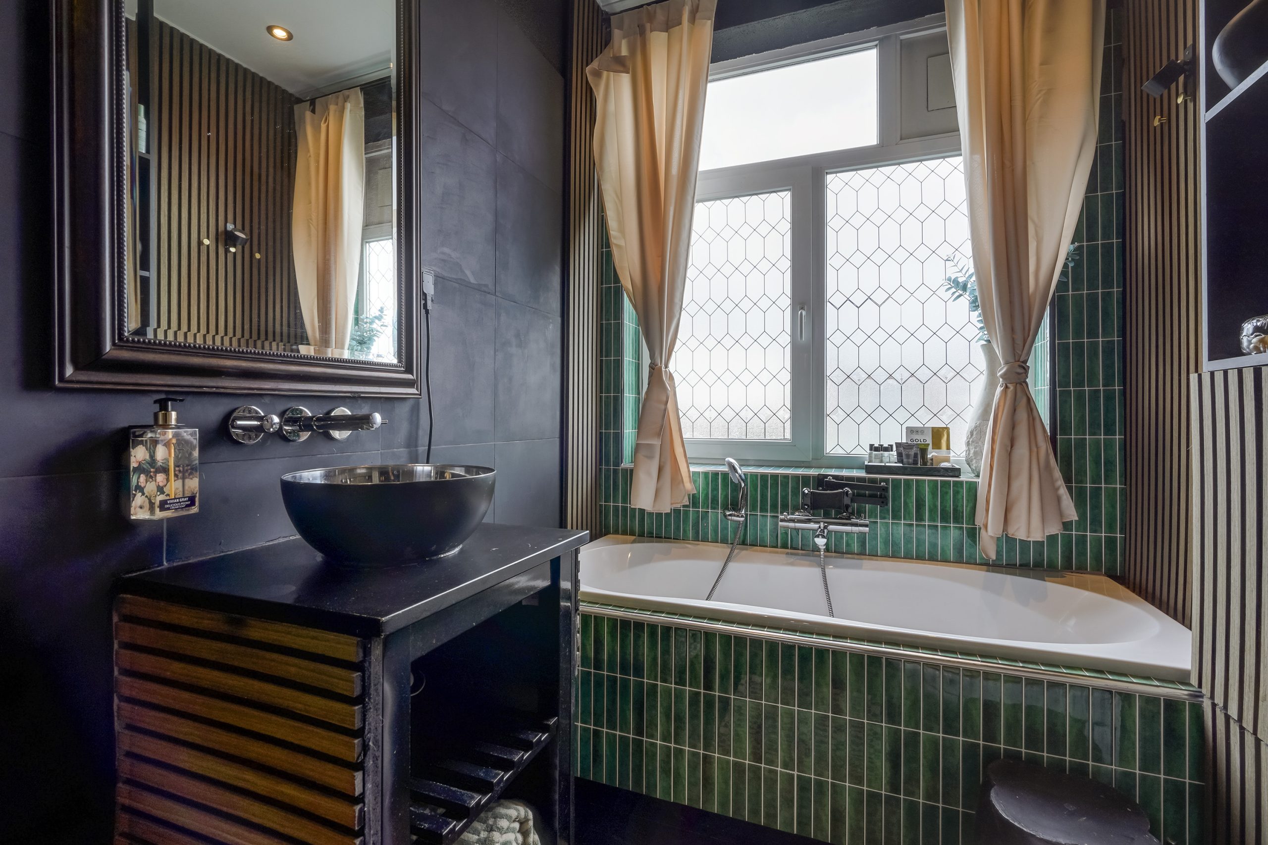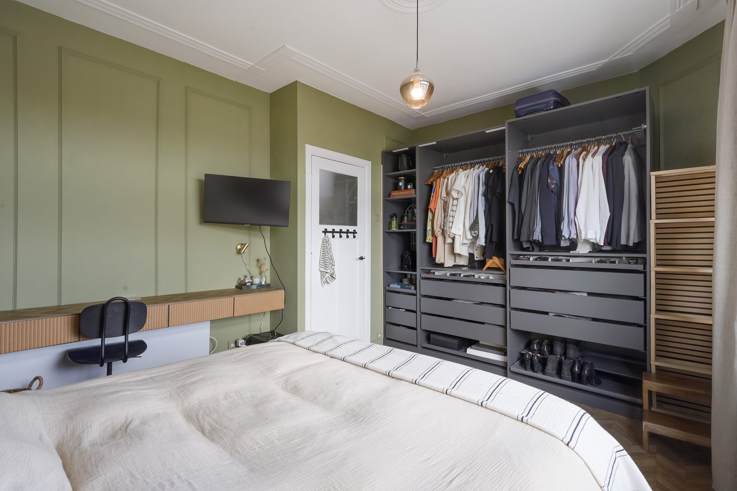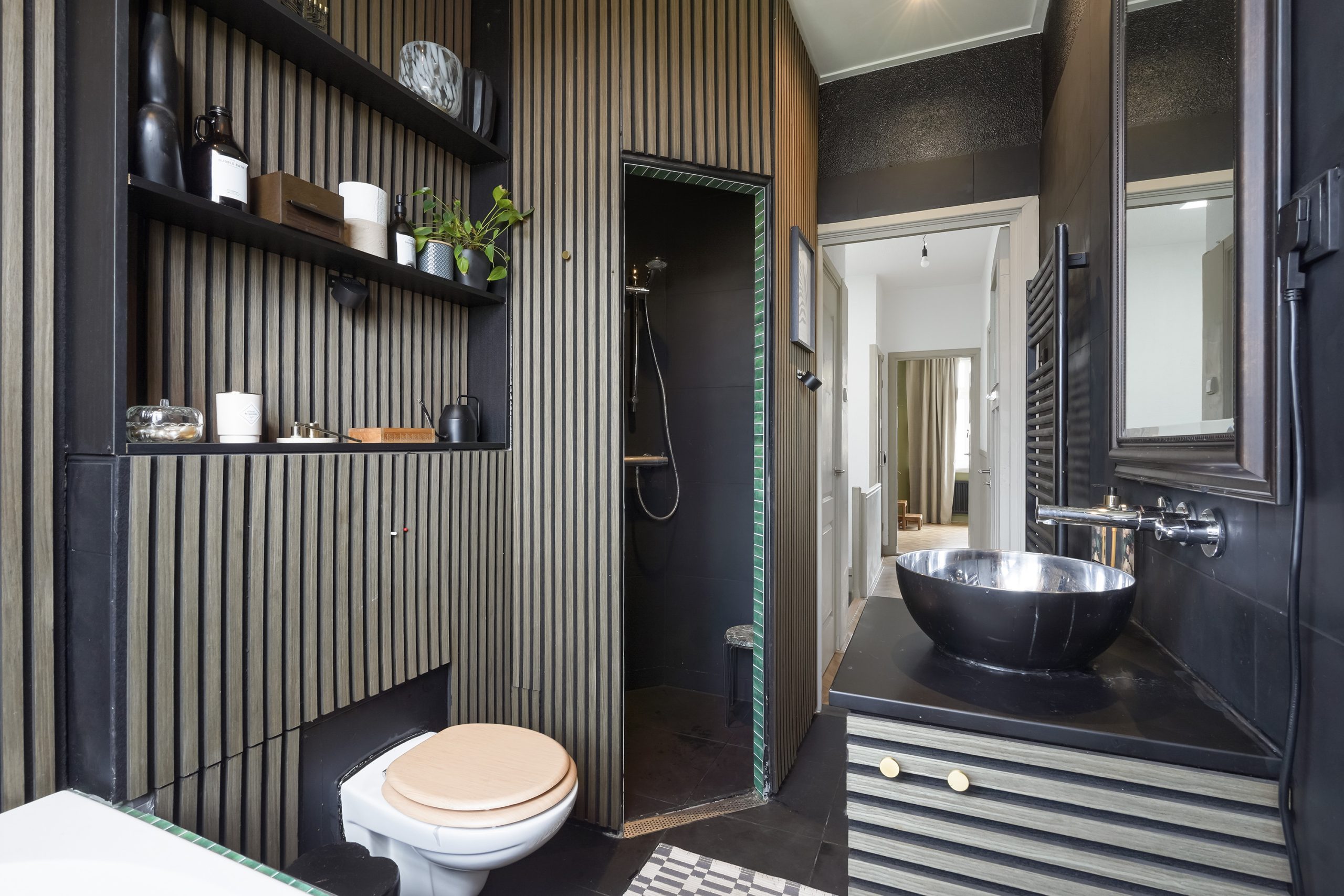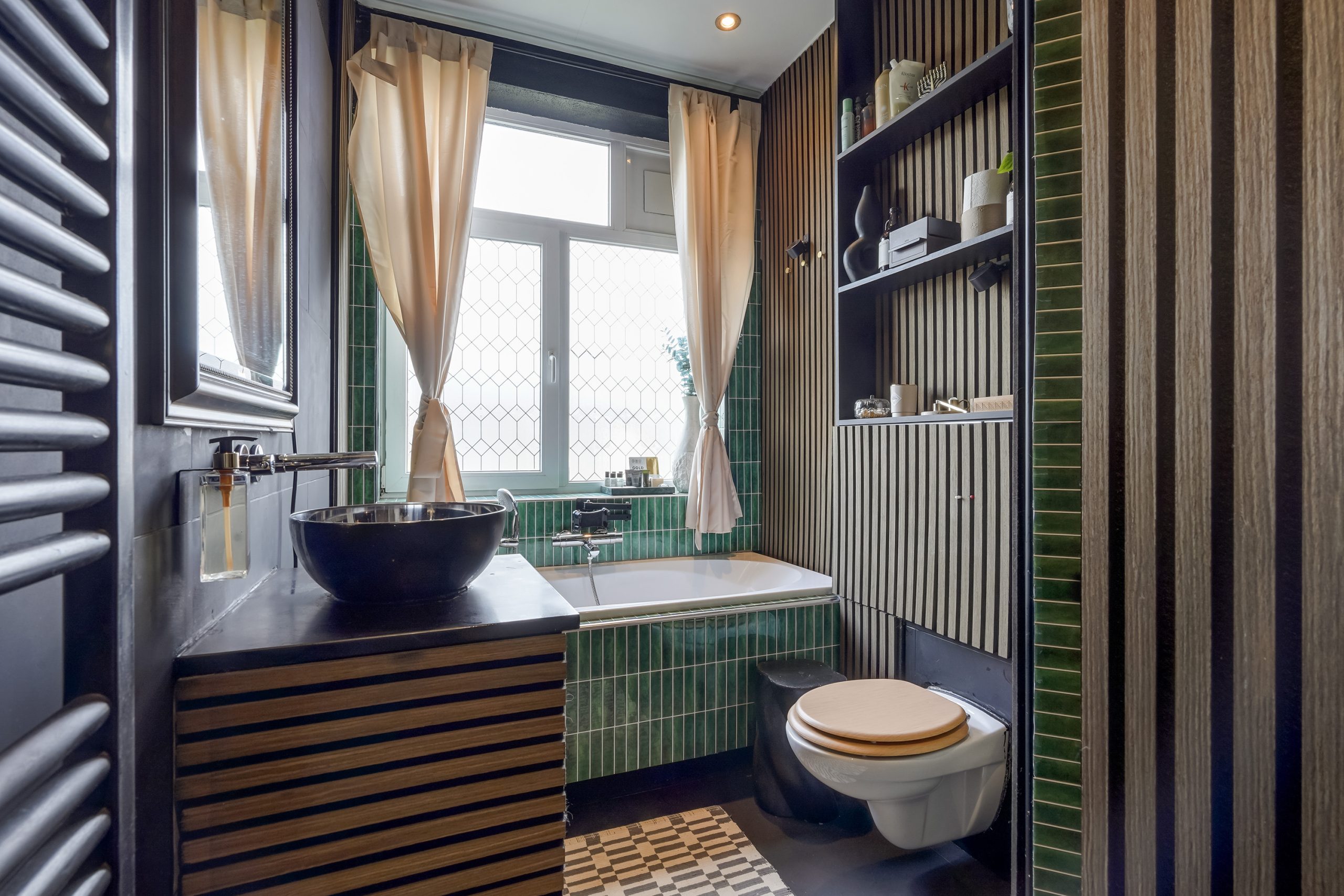 Grenzend aan deze slaapkamer vind je de badkamer, die compleet is uitgevoerd met een ligbad, inloopdouche, tweede toilet en modern wastafelmeubel. Dankzij de praktische indeling en het daglicht voelt de badkamer ruim en comfortabel aan.
