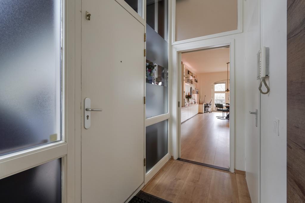 Gemeenschappelijke entree, middels lift naar de tweede verdieping, entree woning. Via de entree is de toiletruimte te bereiken met hangtoilet en fontein. De ruime woonkamer van maar liefst 10,06m x 10,03m is voorzien van een open keuken met kookeiland. De keuken is voorzien van een inductiekookplaat, afzuigkap, vaatwasser, combi-oven, veel bergruimte en afgewerkt met een granieten blad. De werkkamer is grenzend aan de woonkamer gelegen.