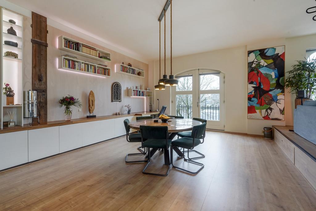 In de woonkamer komt het karakter van het pand naar voren door de prachtige toogkozijnen en de houten balken.