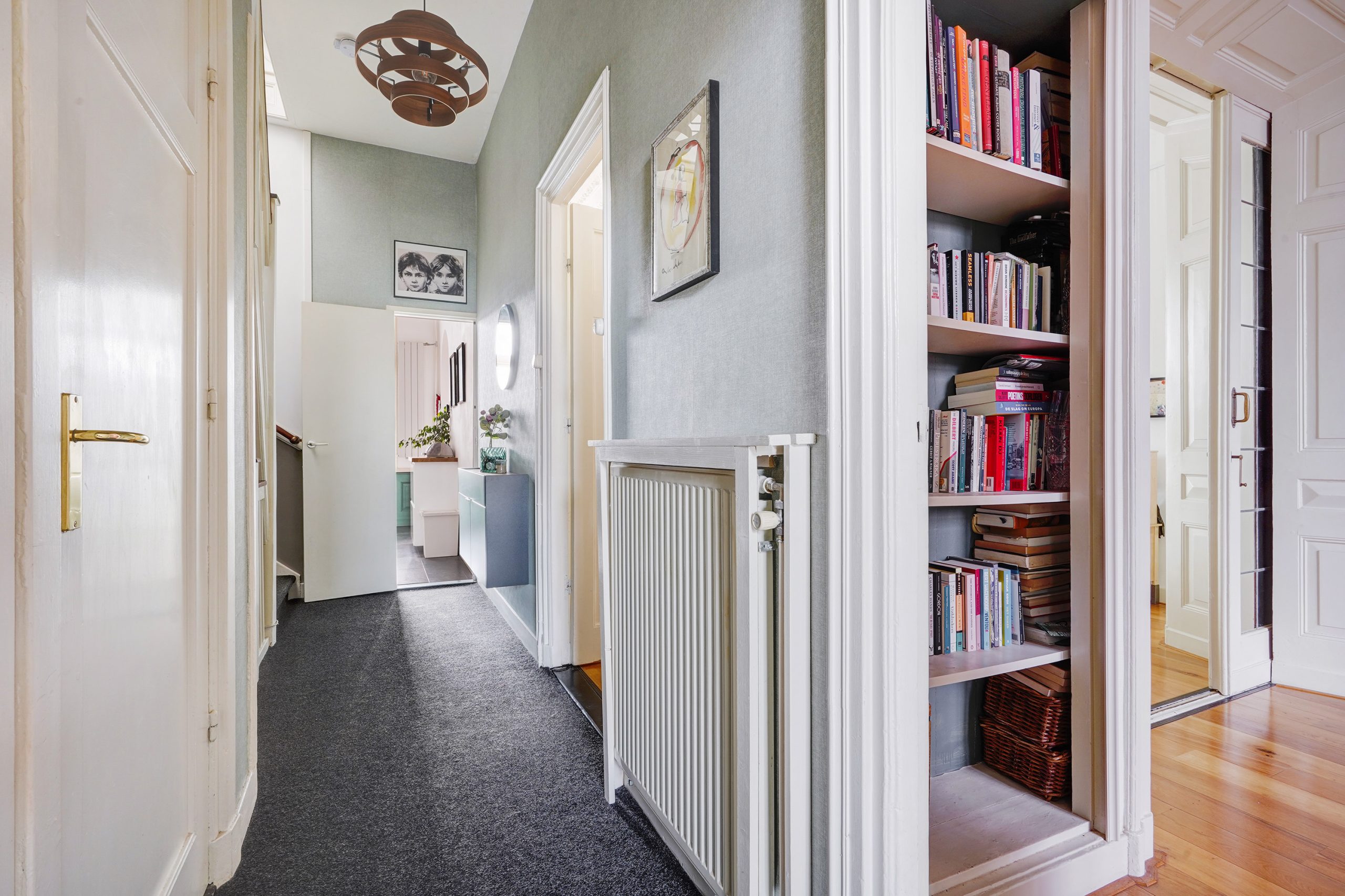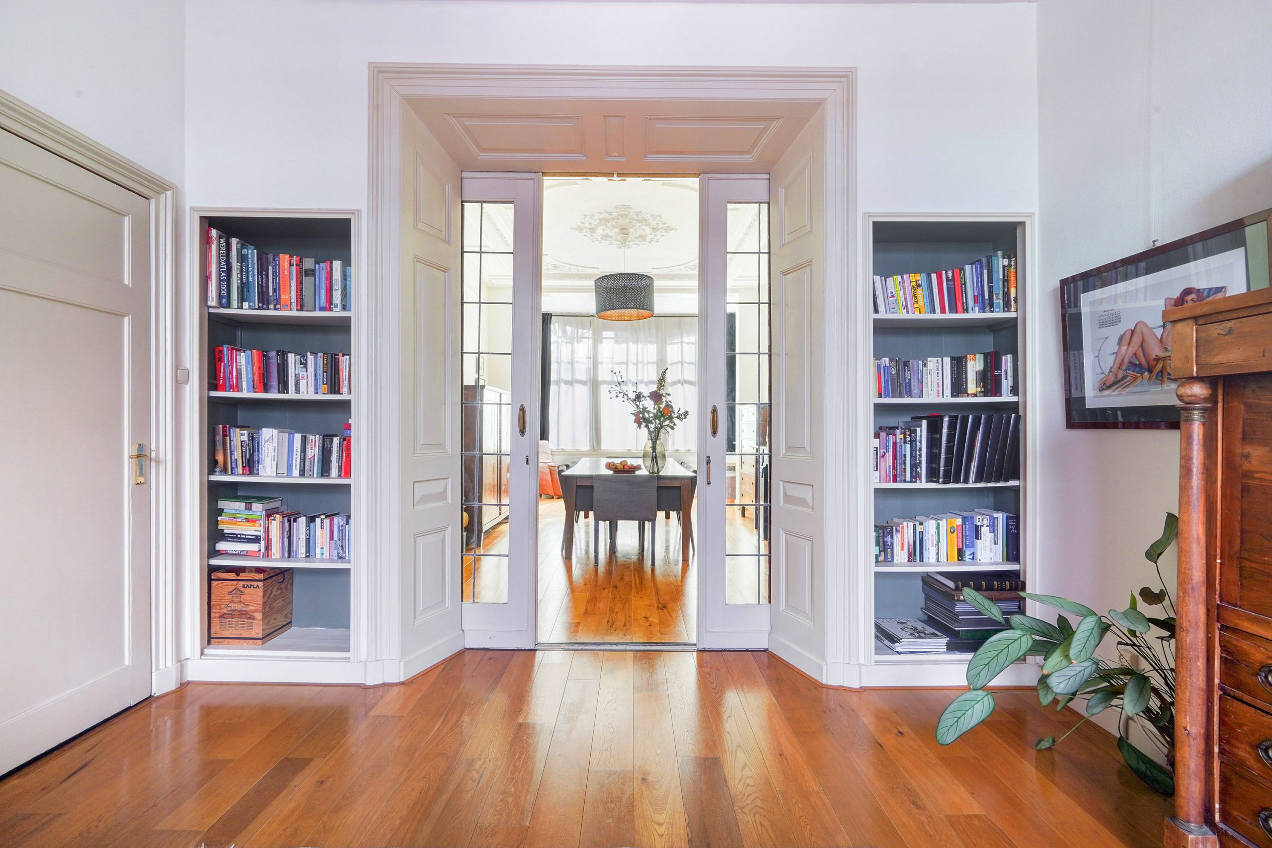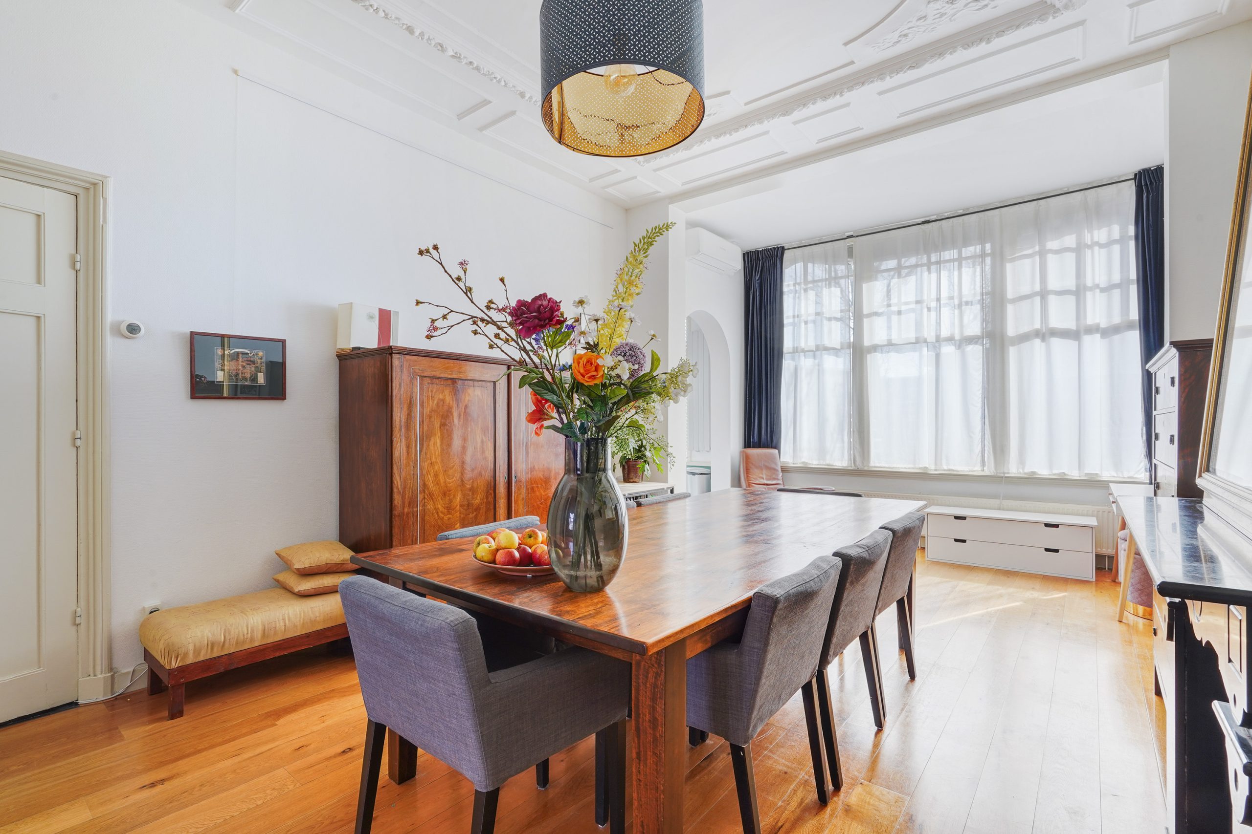 Eigen entree op straatniveau met hal en trap naar de eerste verdieping. Op deze verdieping bevindt zich de overloop met garderobekast en een modern toilet. De ruime woon- en eetkamer is opvallend licht dankzij de grote raampartijen aan zowel de voor- als achterzijde. De fraaie schuifseparatie en de karakteristieke hoge plafonds met ornamenten zorgen voor een bijzonder prettige en sfeervolle leefruimte.