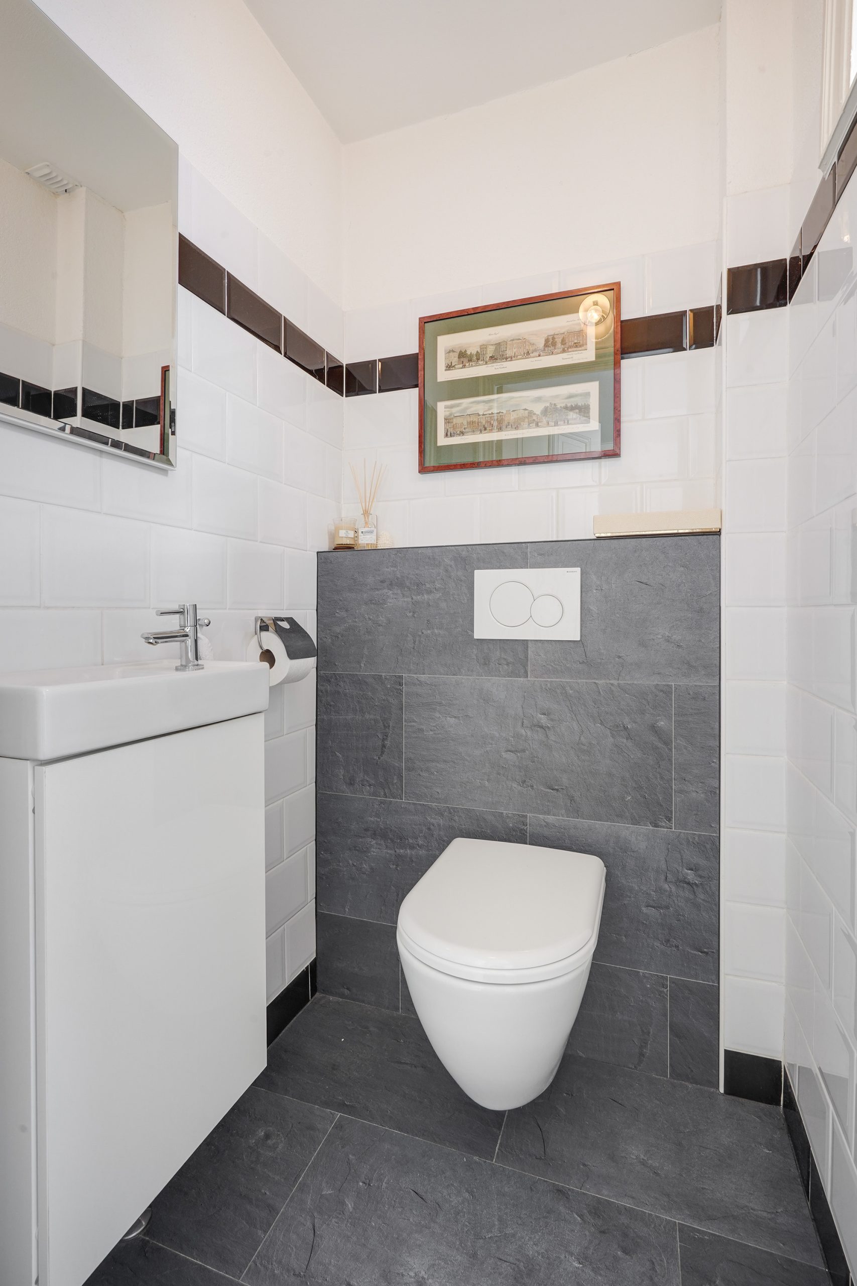 Private entrance at street level with hallway and staircase to the first floor. This floor features a landing with wardrobe space and a modern toilet. The spacious living and dining room is wonderfully bright thanks to large windows at both the front and rear. The elegant sliding doors and high ceilings with original ornamental details create a particularly attractive and comfortable living space.