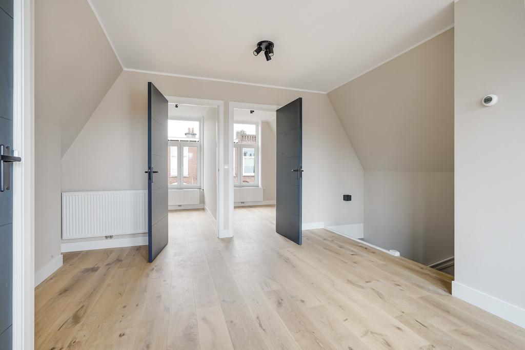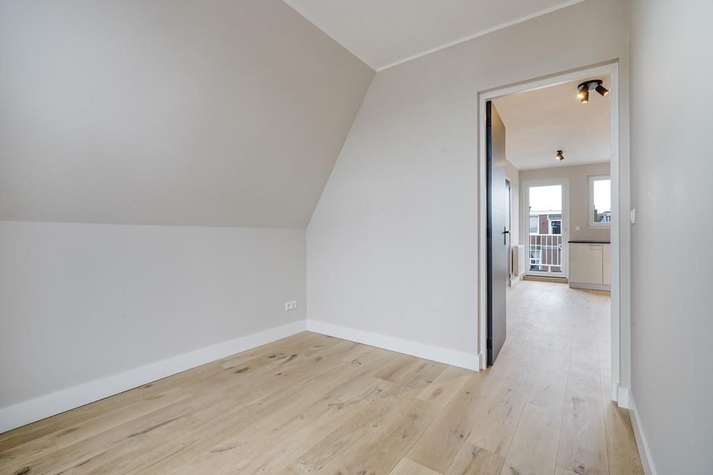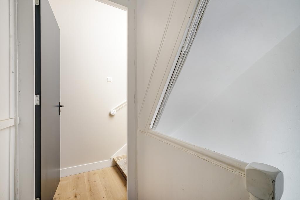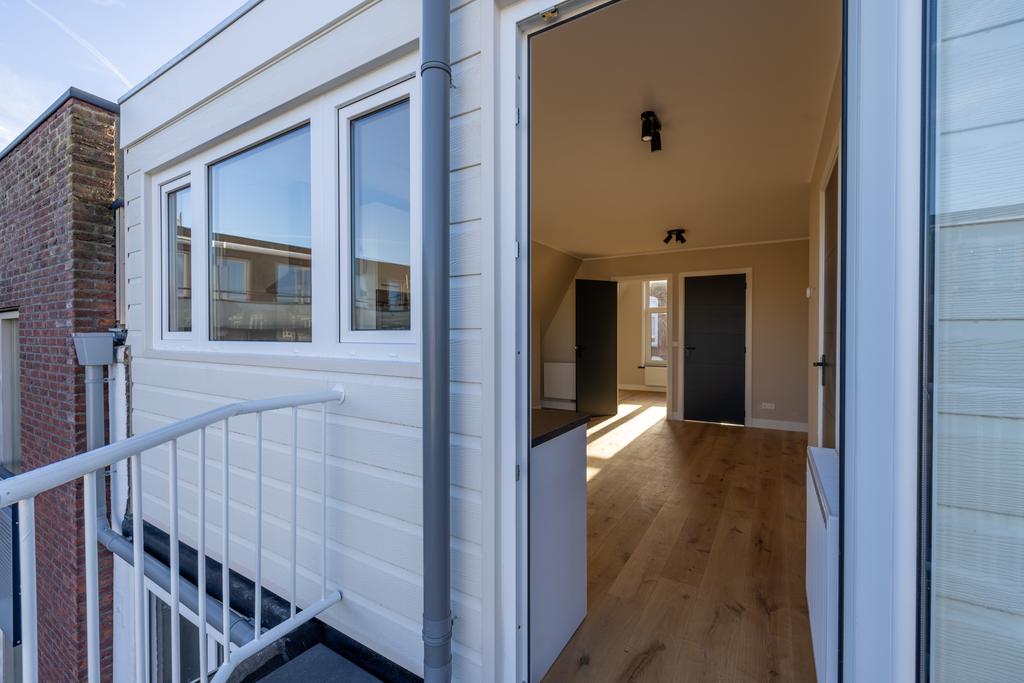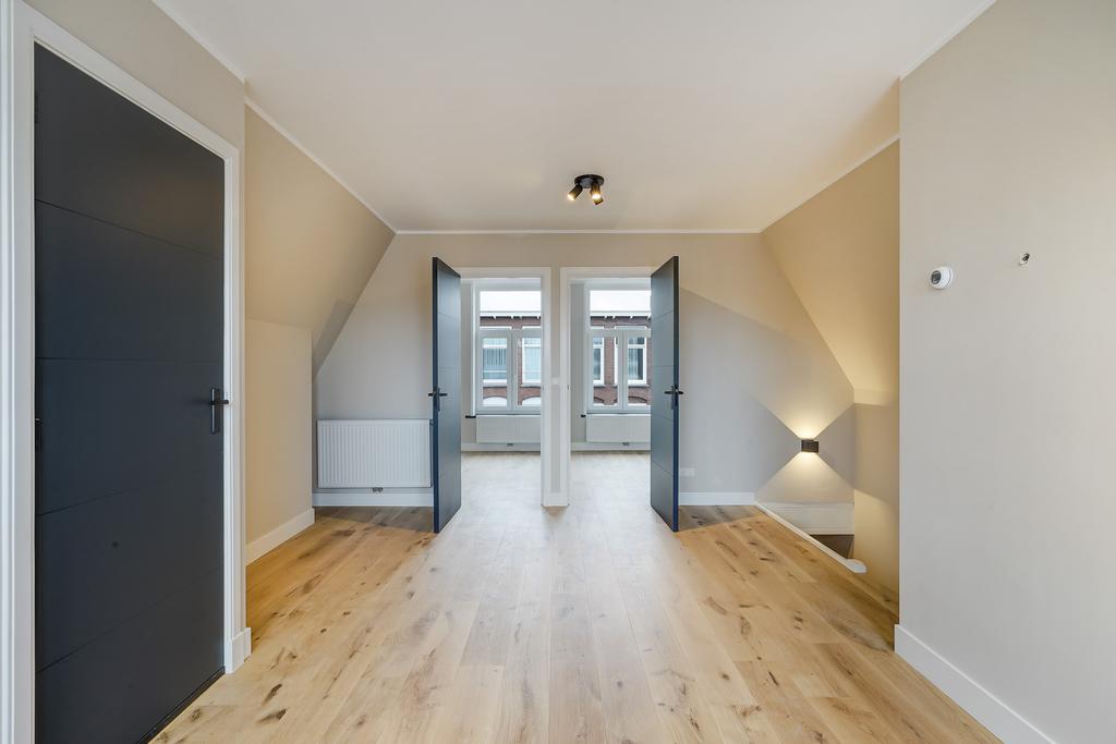 Gezamenlijke entree, middels trap naar de overloop op de eerste verdieping. Entree woning, na de trapopgang is de woning te bereiken op de 2de verdieping. De woonkamer is voorzien van een open keuken uit 2023 met diverse inbouwapparatuur als een combi-oven, vaatwasser, inductie kookplaat met afzuigkap, koelkast en voldoende opbergruimte. Naast de keuken in de provisiekast bevindt zich de Remeha Avanta CV-ketel uit 2022 en uitgebreide meterkast. De badkamer uit 2023 is voorzien van een wandcloset, inloopdouche, badkamermeubel, handdoek-radiator en strakke betegeling. Aan de voorzijde bevinden zich twee slaapkamers. De gehele woning is voorzien van een prachtig eikenhouten parketvloer. Het ruime dakterras aan de achterzijde is te betreden vanuit de woonkamer. Aan de achterzijde van de woning zijn nieuwe kunststof kozijnen geplaatst met HR++ glas.