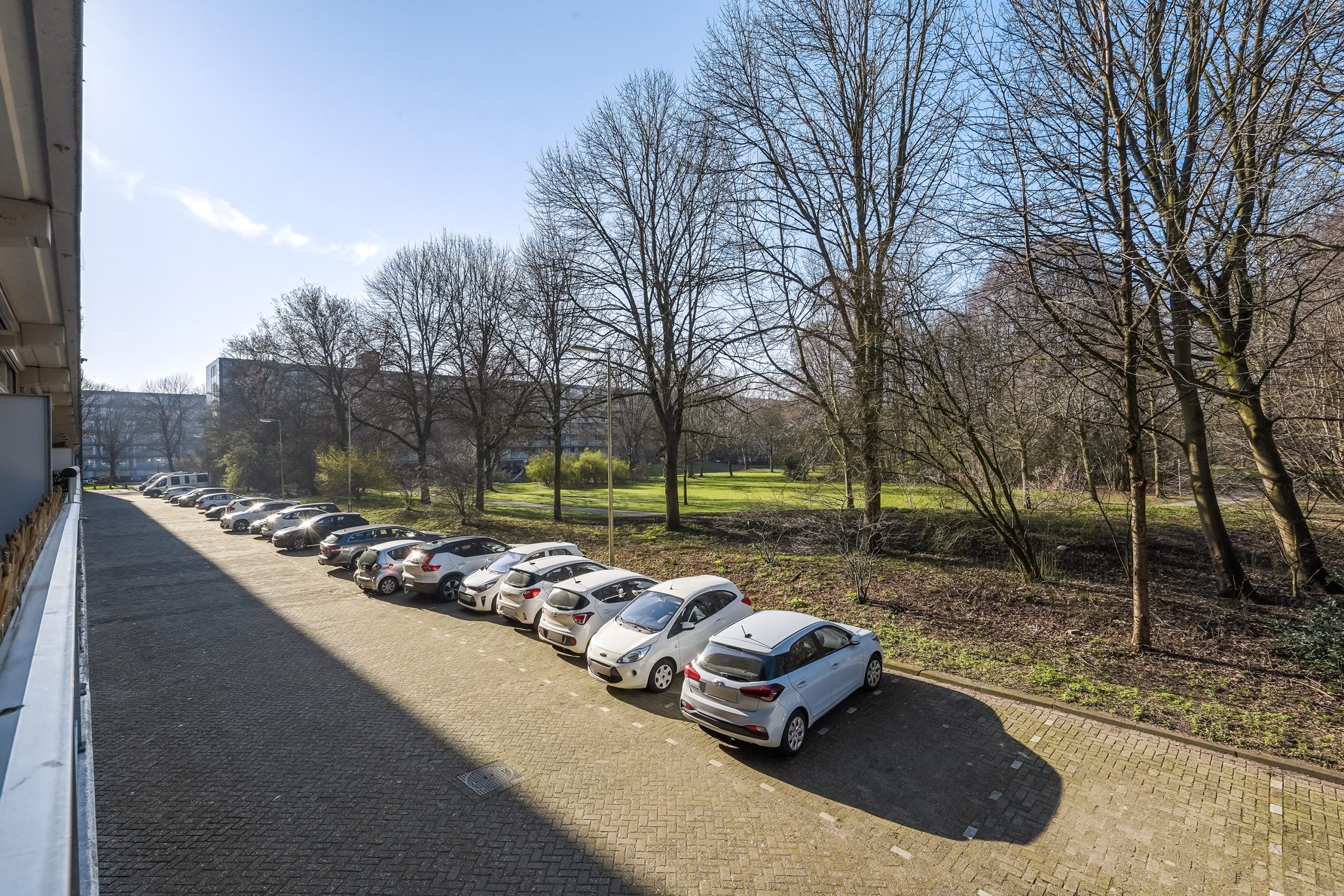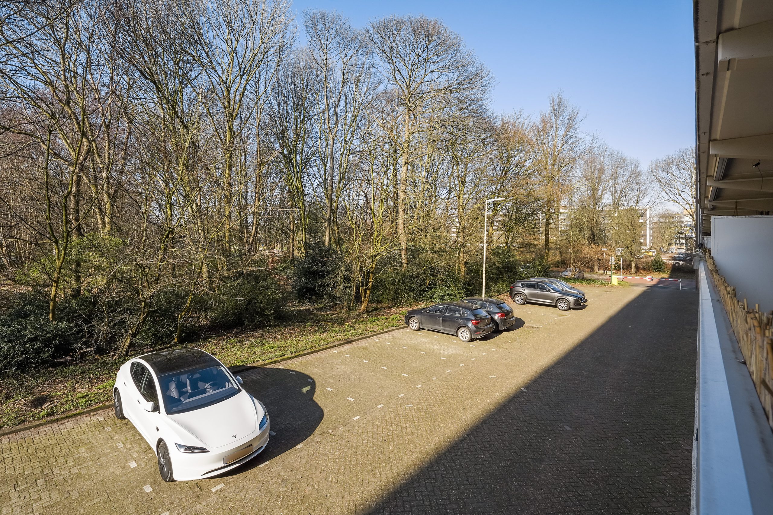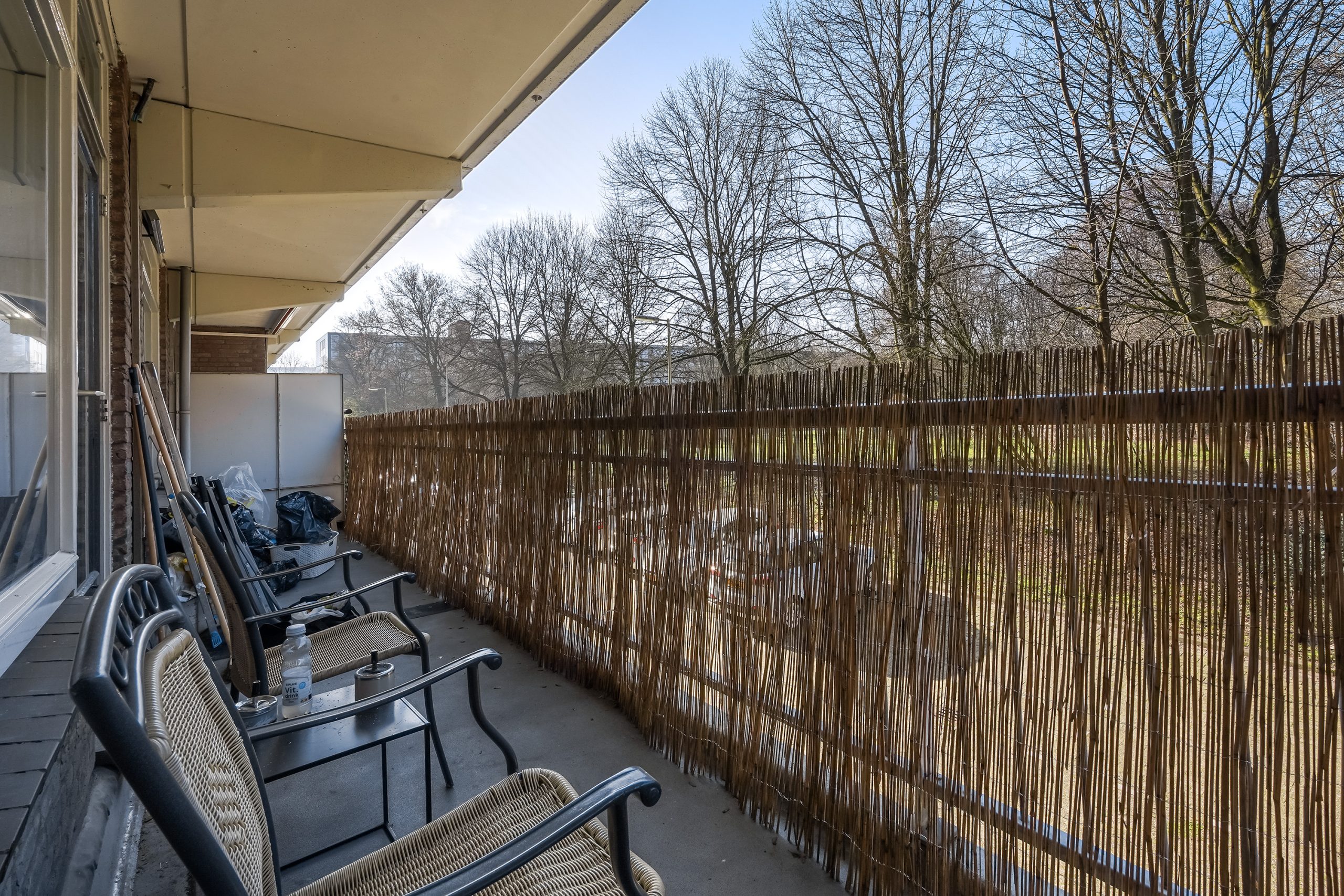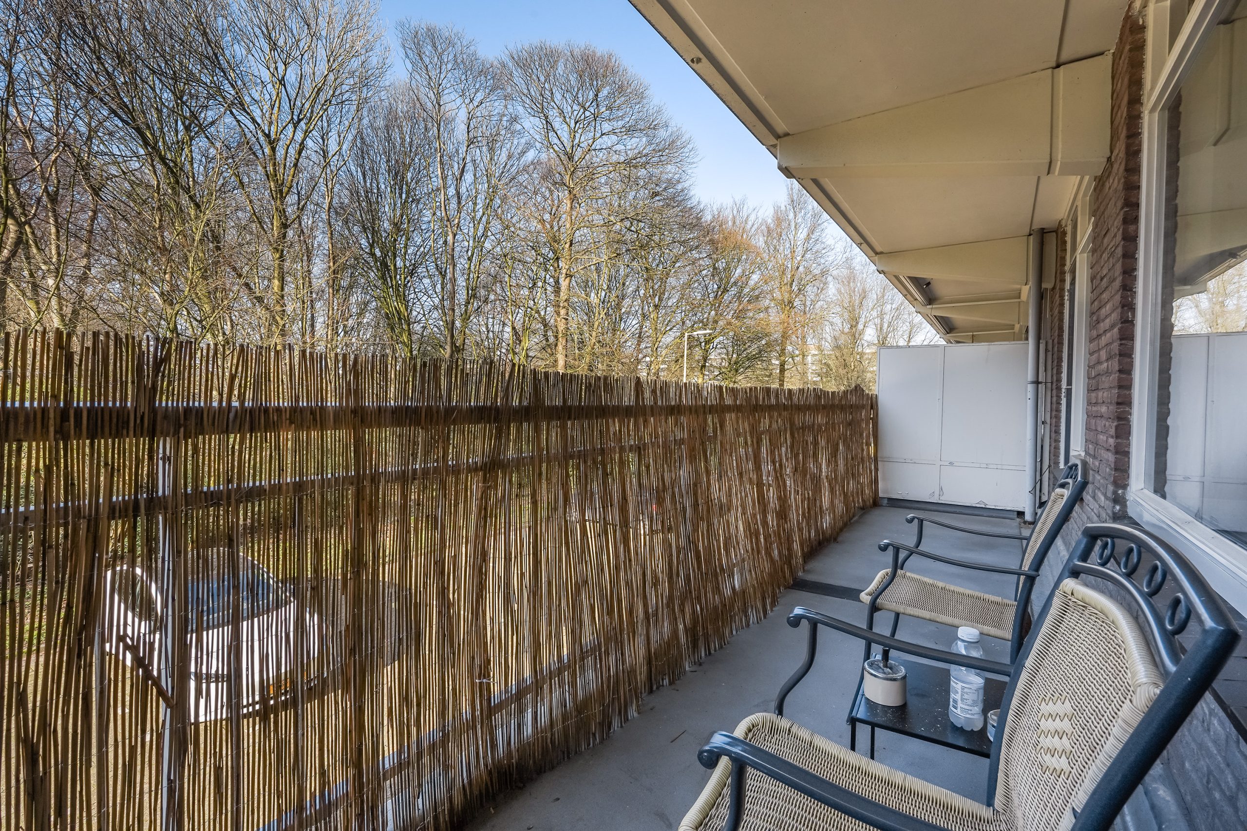 Het royale balkon op het zuidwesten biedt volop zon en een vrij uitzicht op het park.