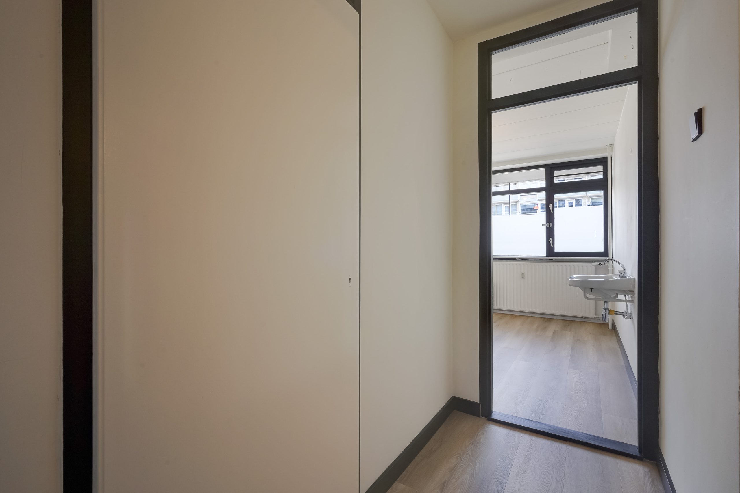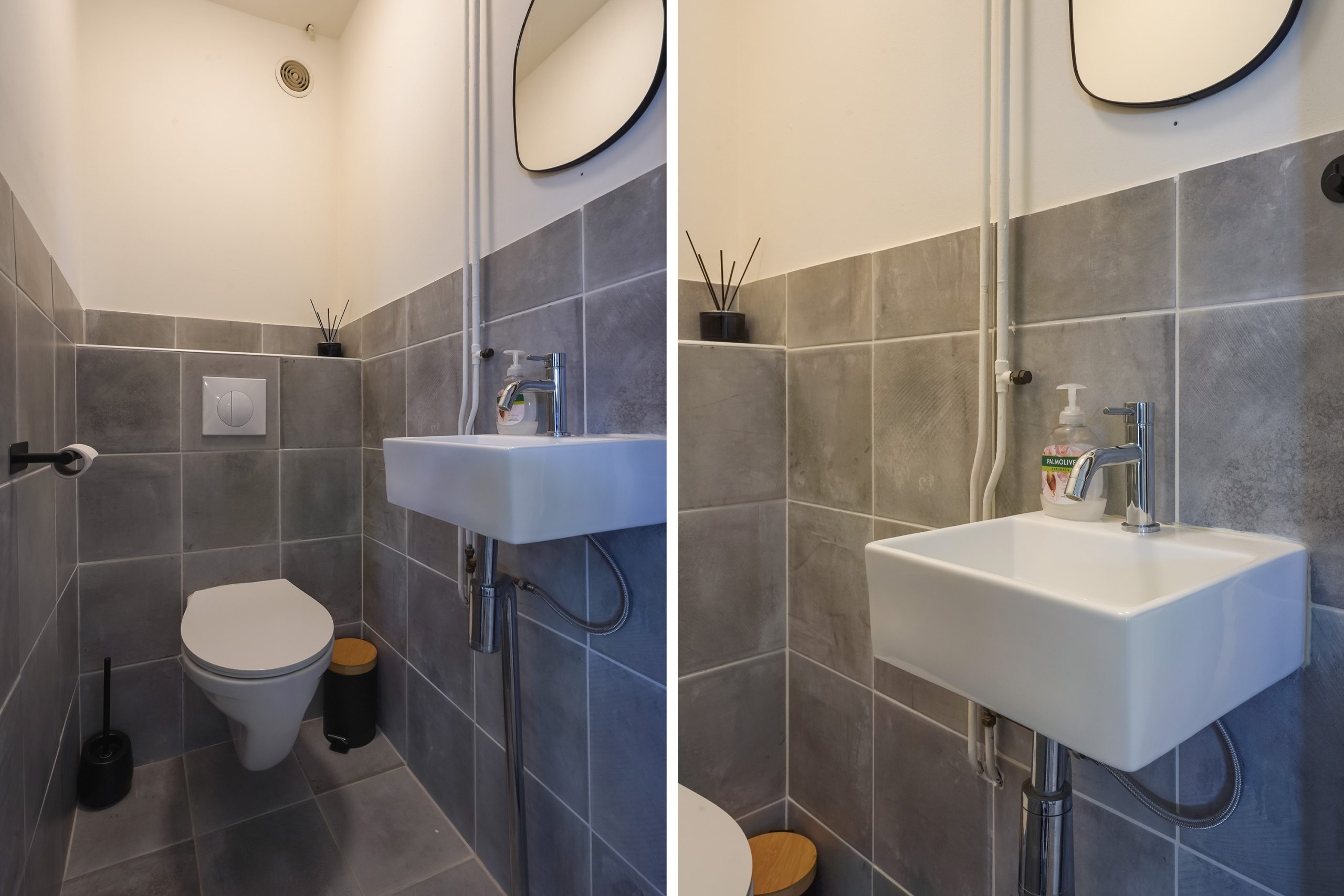 Entree woning met vestibule en hal, voorzien van modern toilet met fonteintje.