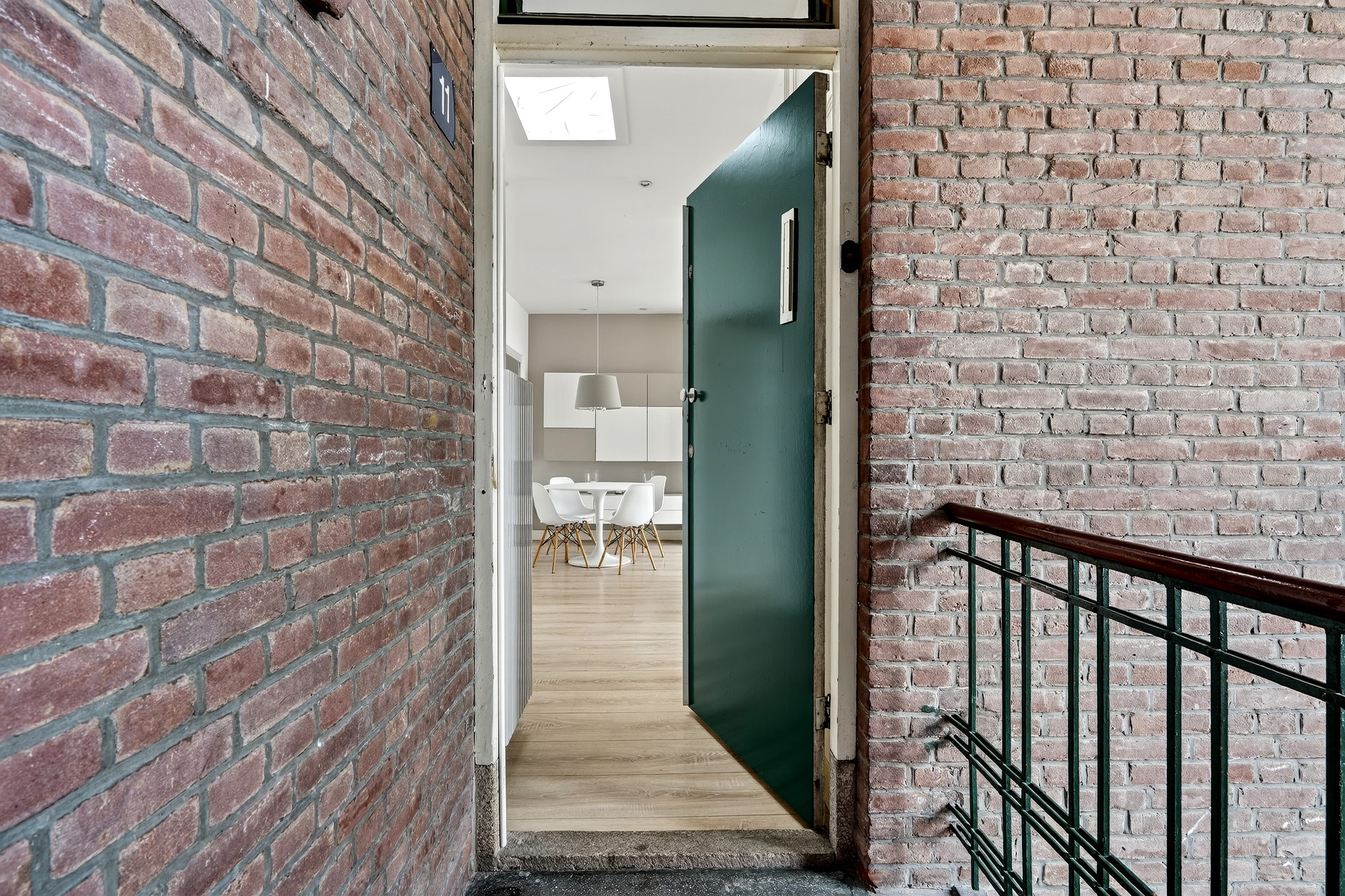 The apartment is located on the top floor and accessed via an open staircase. Upon entering, a spacious hallway connects all rooms.