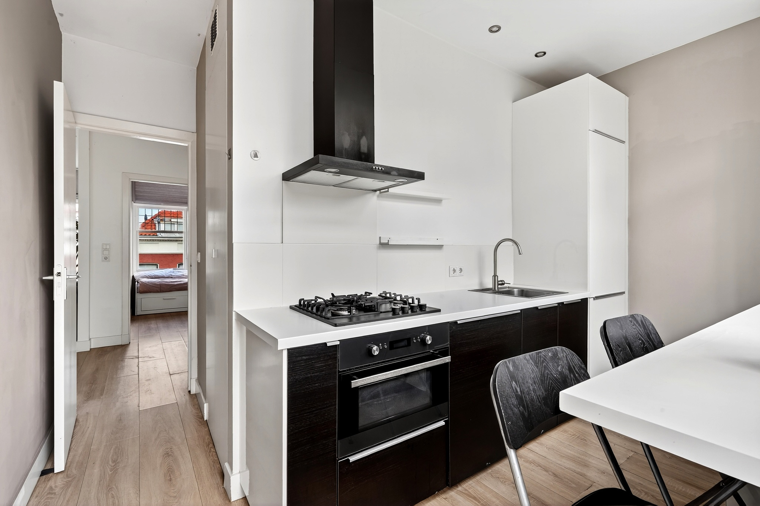 De separate moderne keuken beschikt over diverse inbouwapparatuur, waaronder een oven, koel-vriescombinatie, vaatwasser en afzuigkap. Vanuit de keuken is er ook toegang tot het balkon.