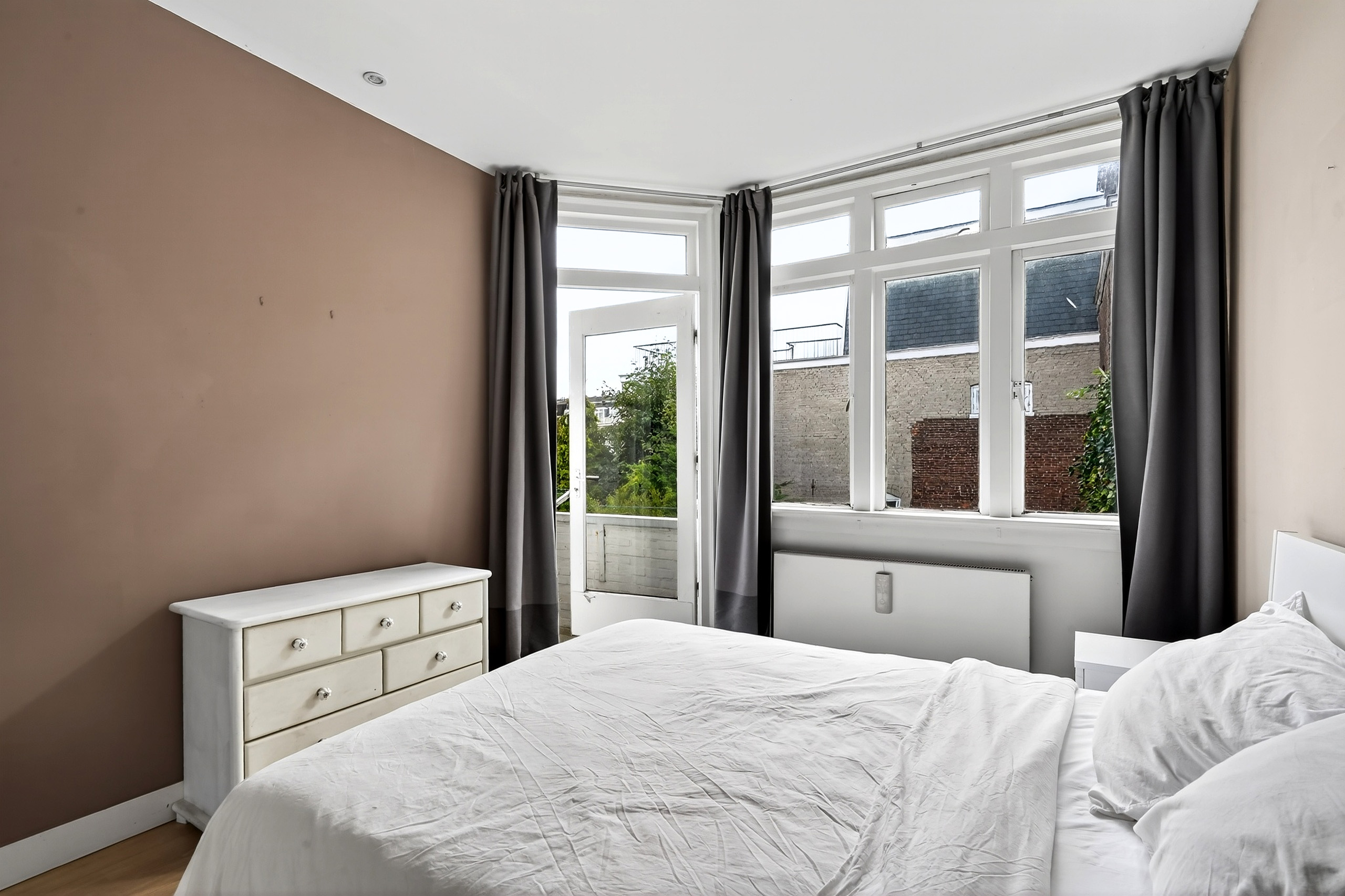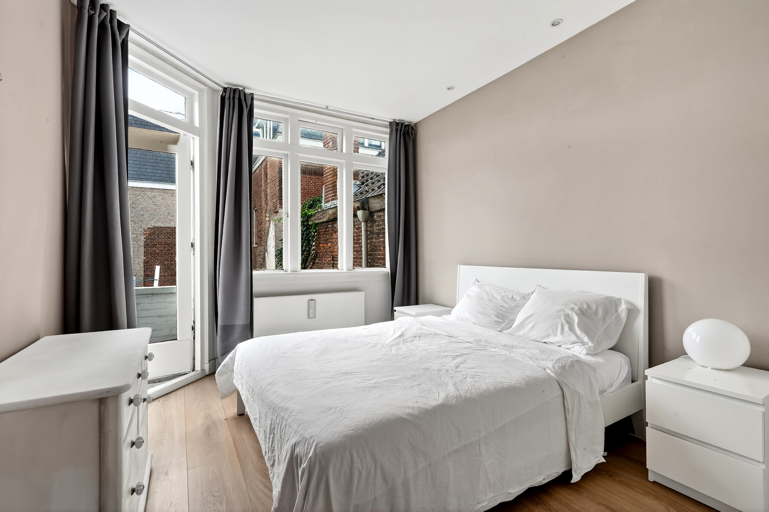 De royale woonkamer valt direct op door de ruime lichtinval dankzij drie grote kozijnen. De sfeervolle haard zorgt voor extra warmte en gezelligheid tijdens de koudere maanden. Aan de voorzijde van het appartement treft u de eerste slaapkamer.