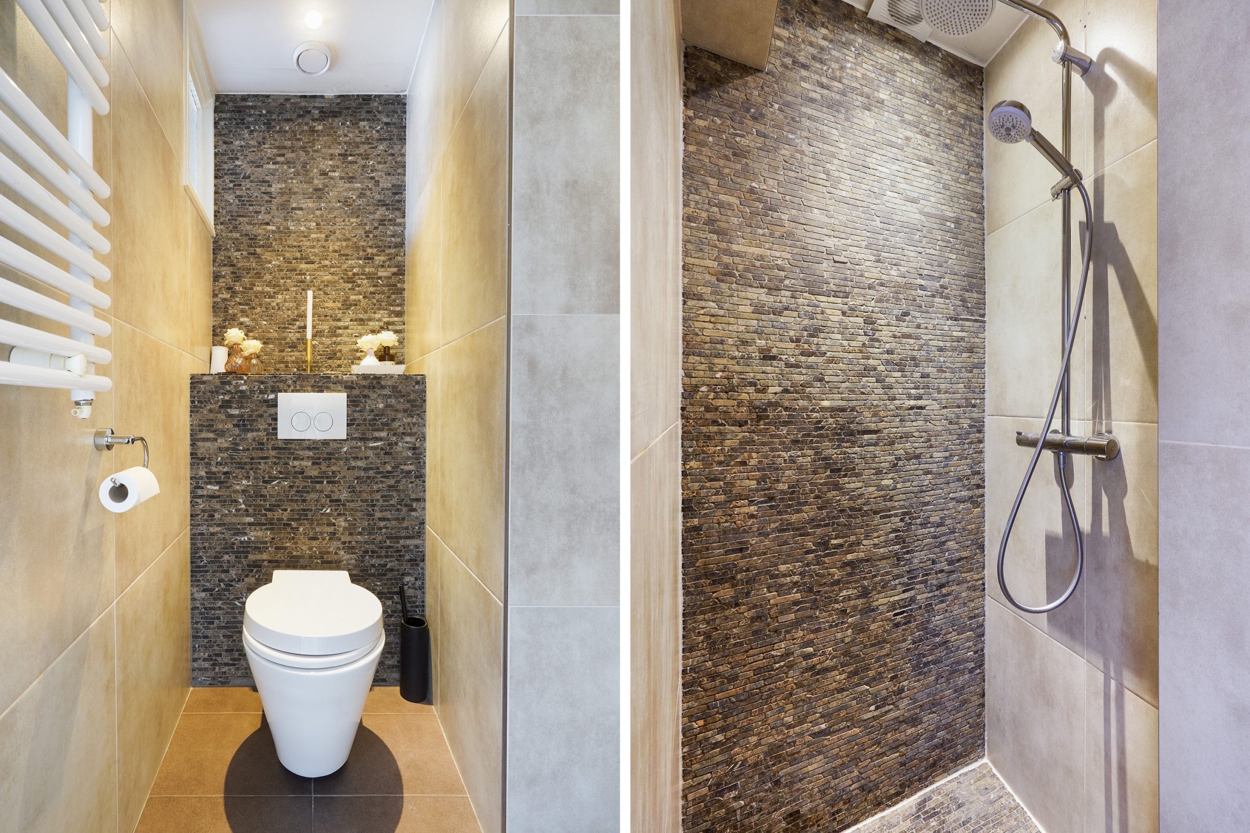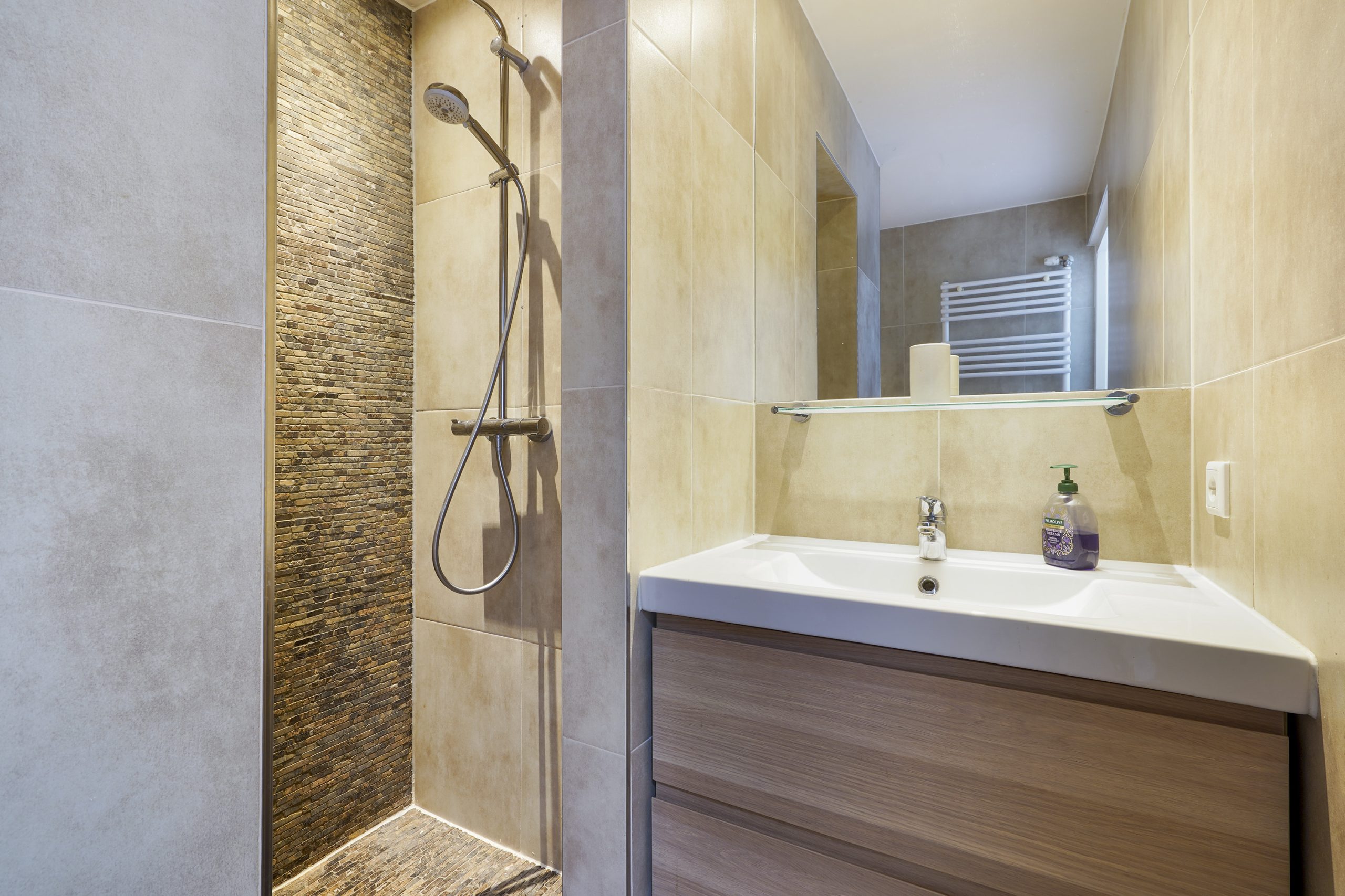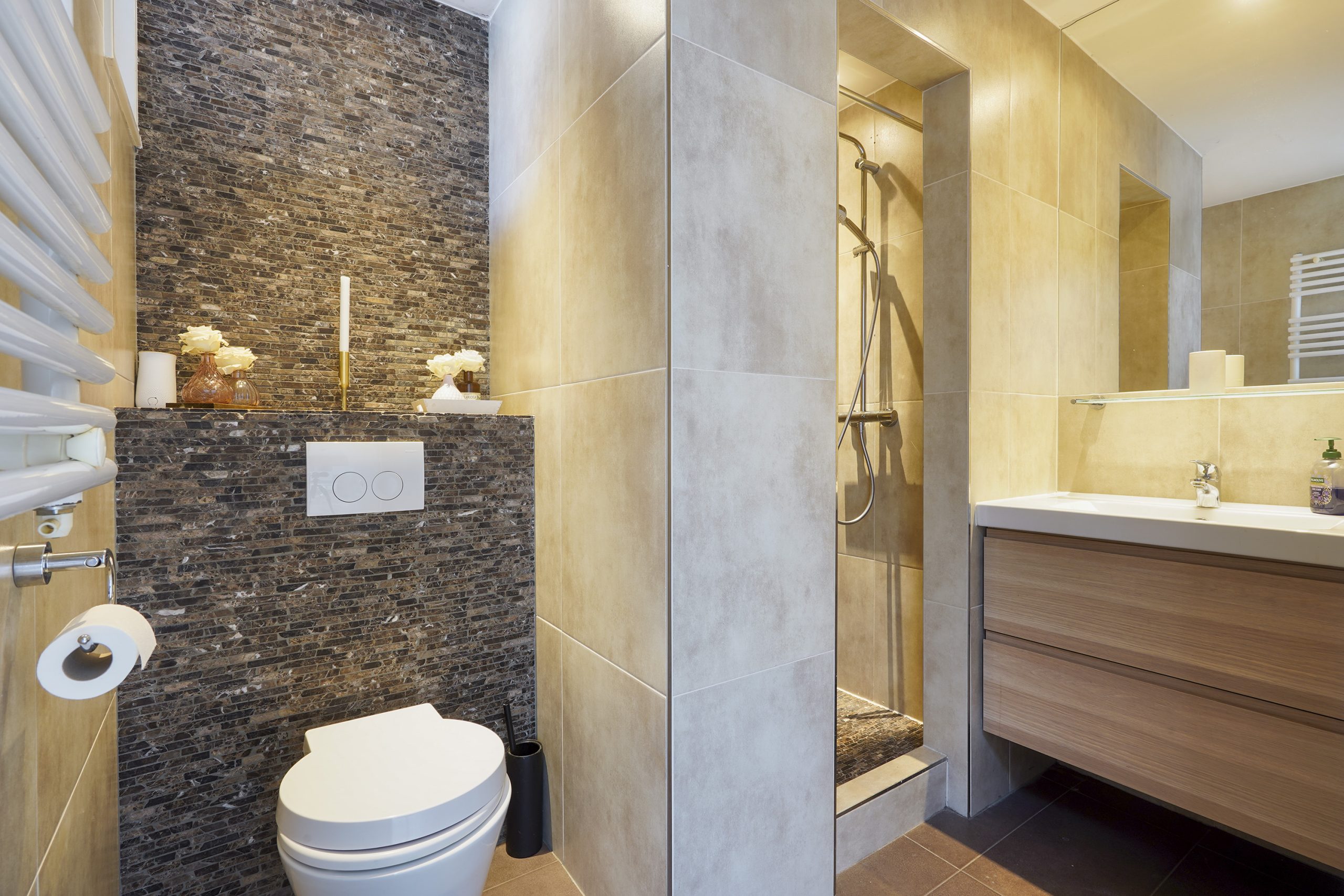 The modern bathroom is fitted with a walk-in shower, toilet, washbasin cabinet, and towel radiator.