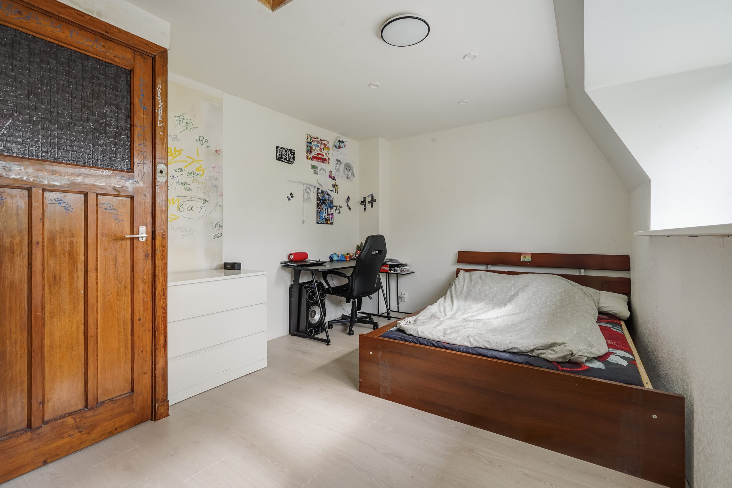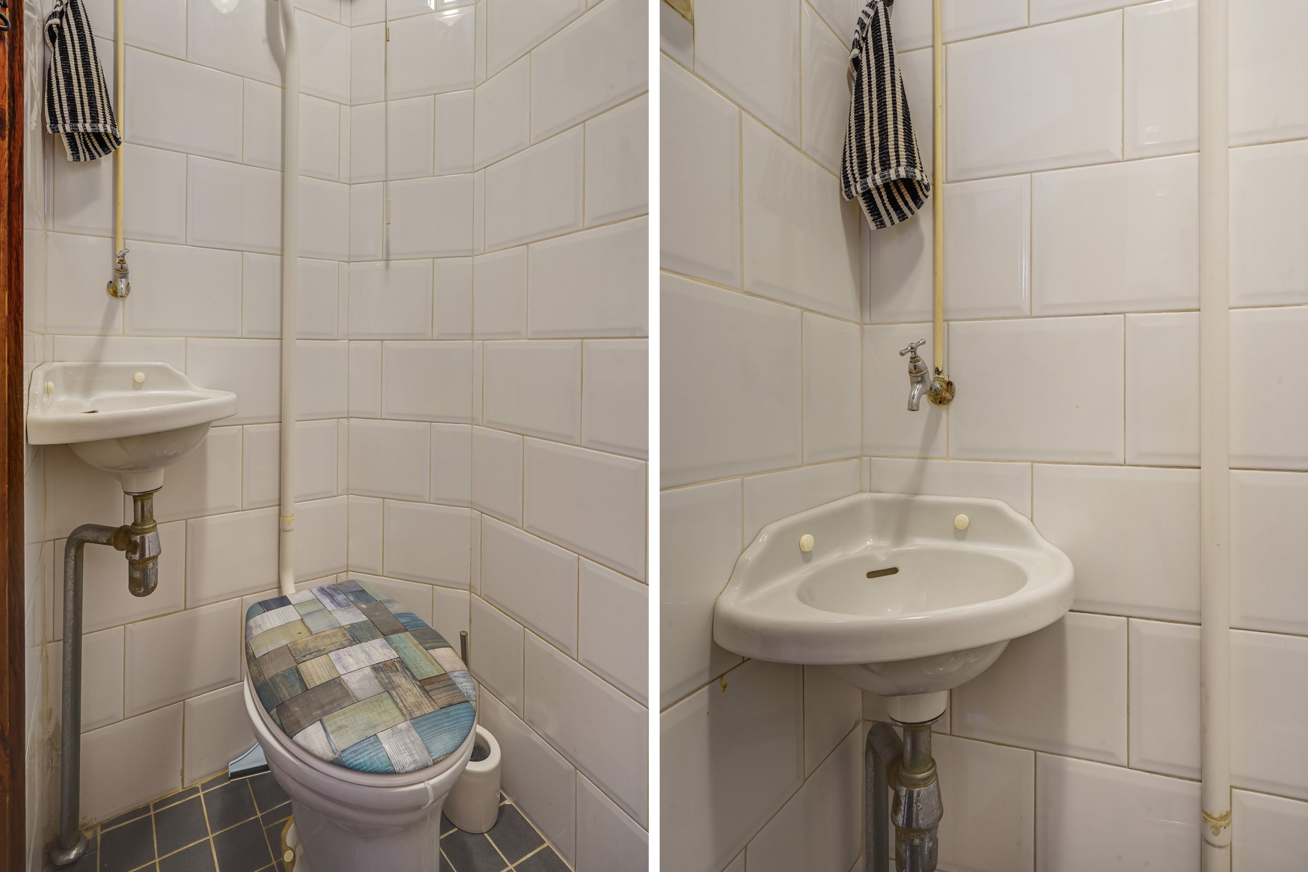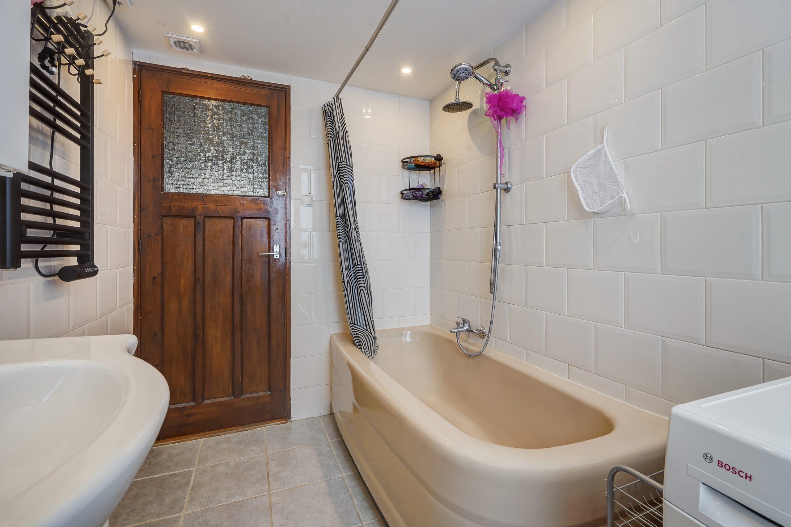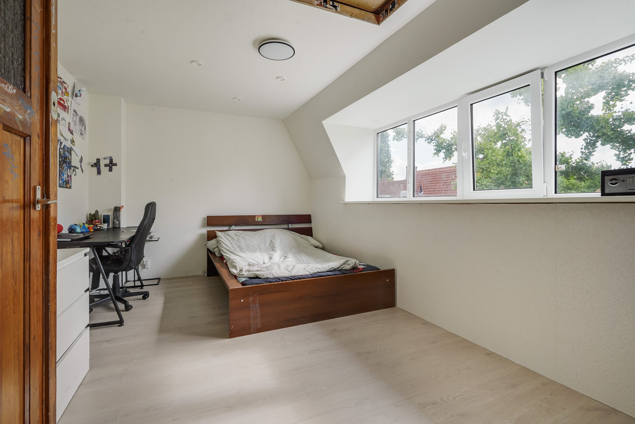 Via een vaste trap bereikt u de tweede verdieping. Hier bevindt zich nog een slaapkamer en de badkamer. De slaapkamer aan de achterzijde biedt direct toegang tot het balkon en het dak. De badkamer is uitgerust met een ligbad met douche, wastafelmeubel en radiator – een fijne plek om tot rust te komen.