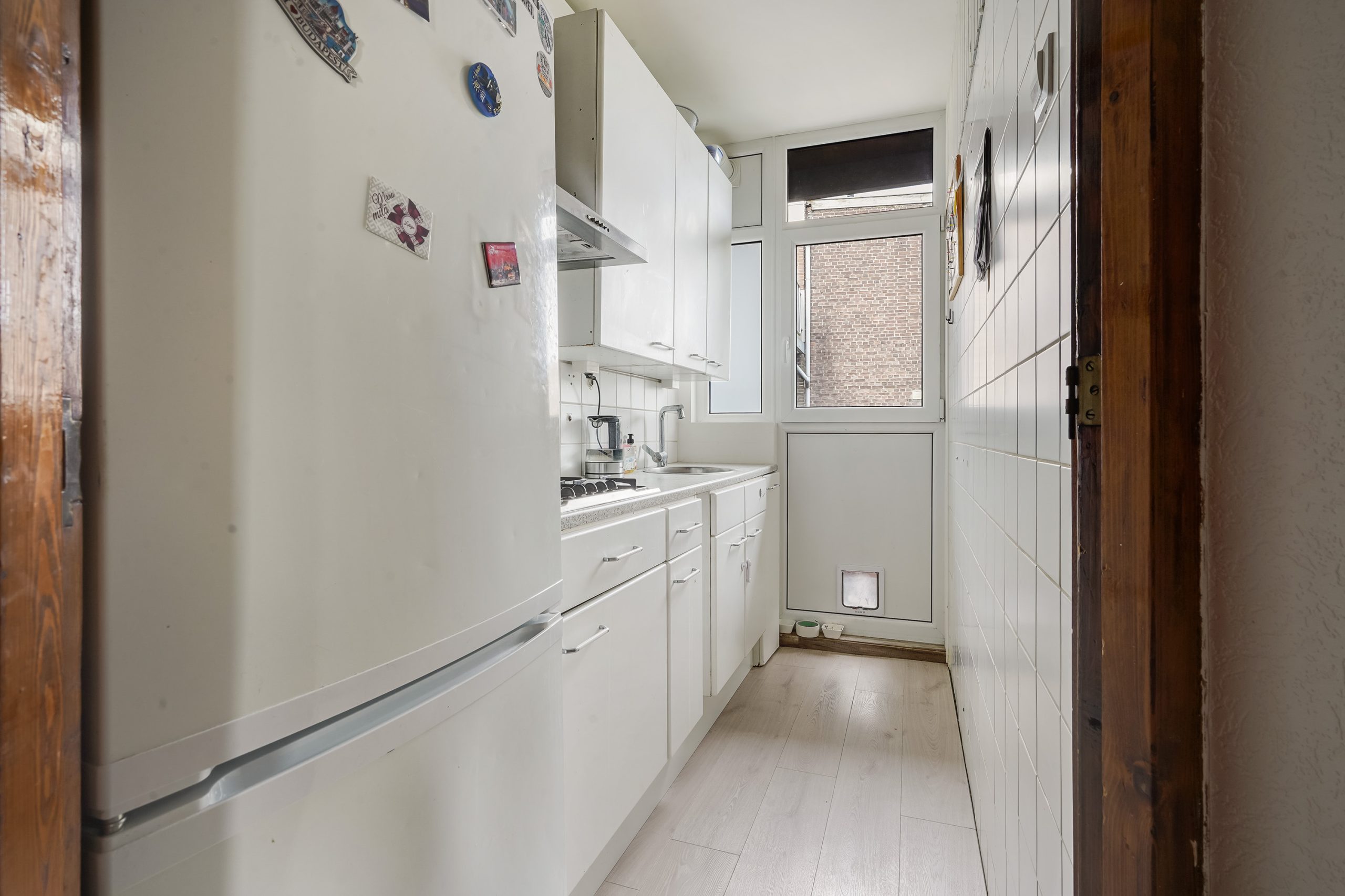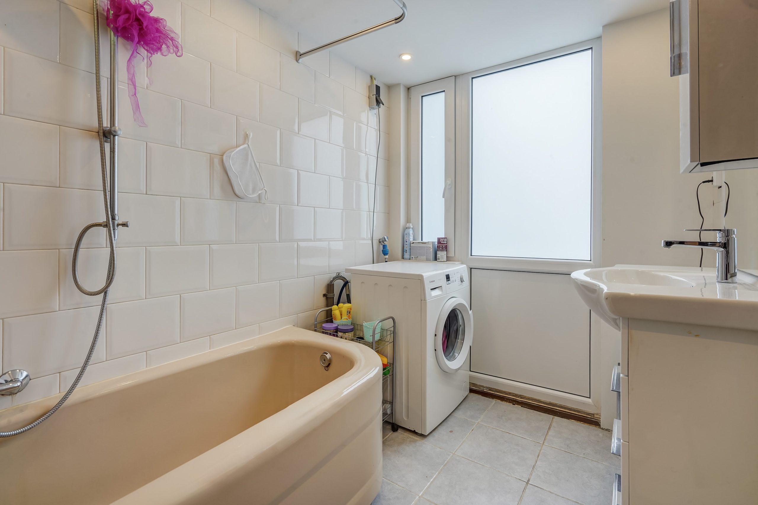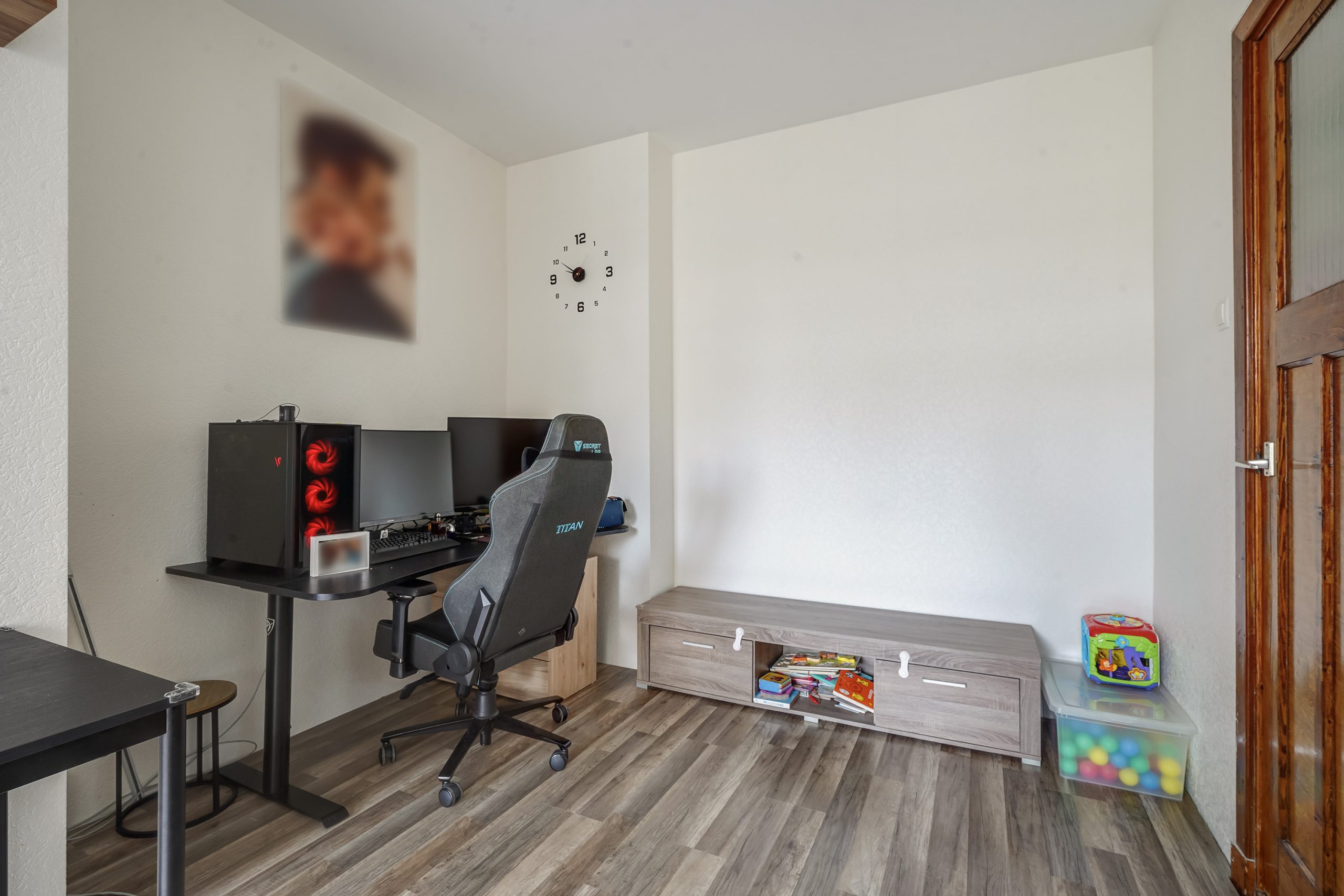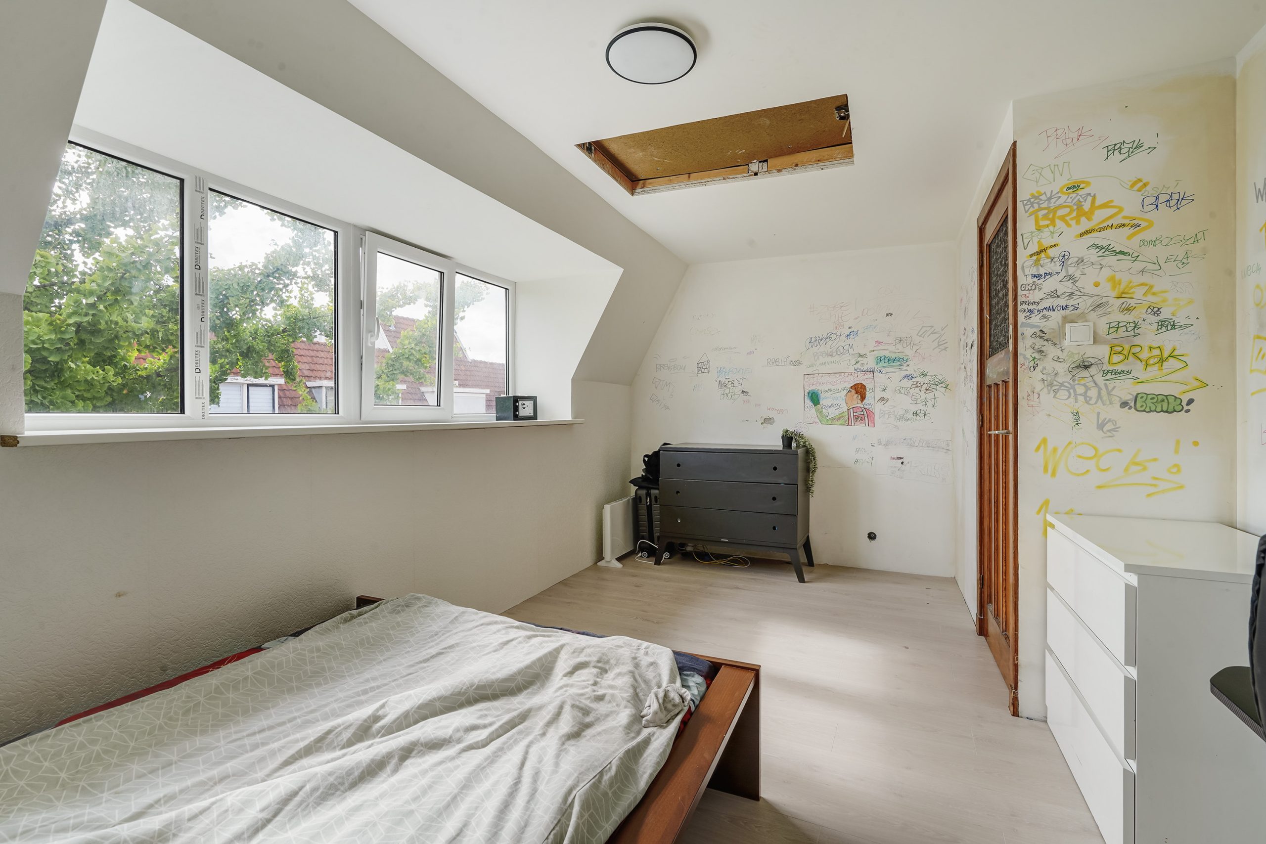 Via een vaste trap bereikt u de tweede verdieping. Hier bevindt zich nog een slaapkamer en de badkamer. De slaapkamer aan de achterzijde biedt direct toegang tot het balkon en het dak. De badkamer is uitgerust met een ligbad met douche, wastafelmeubel en radiator – een fijne plek om tot rust te komen.