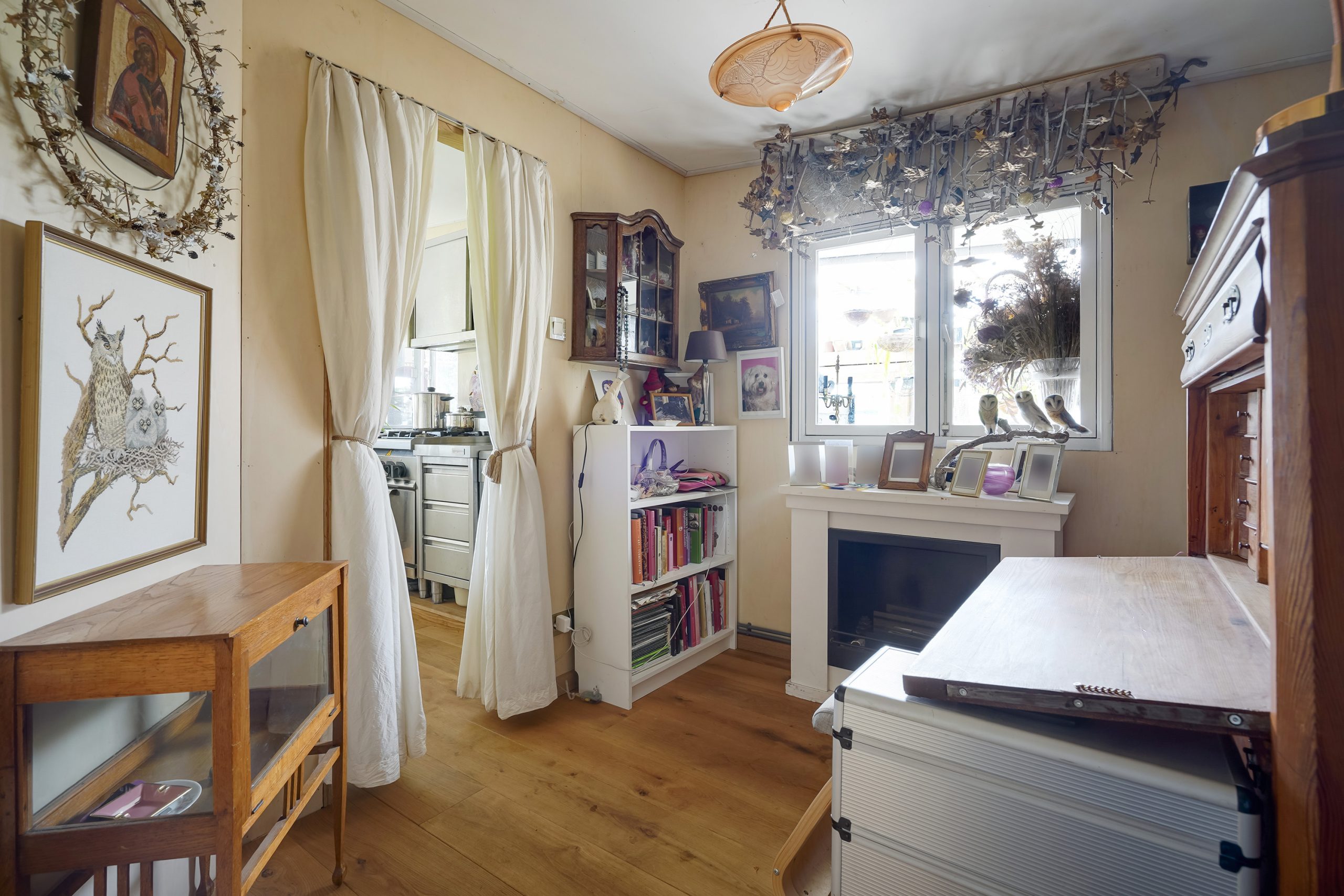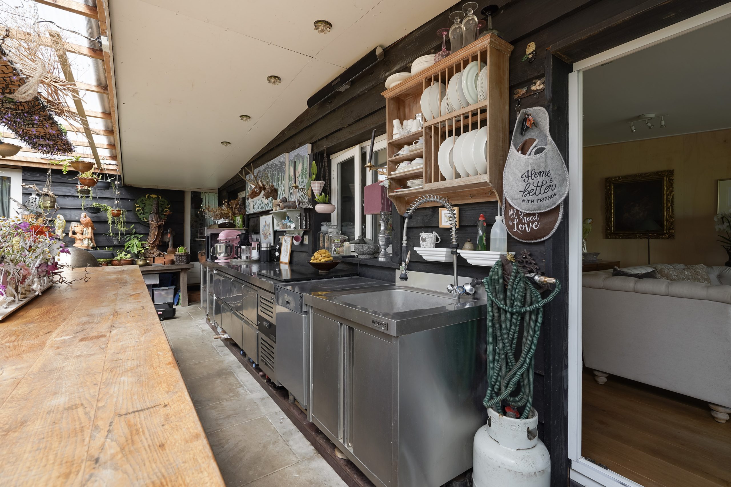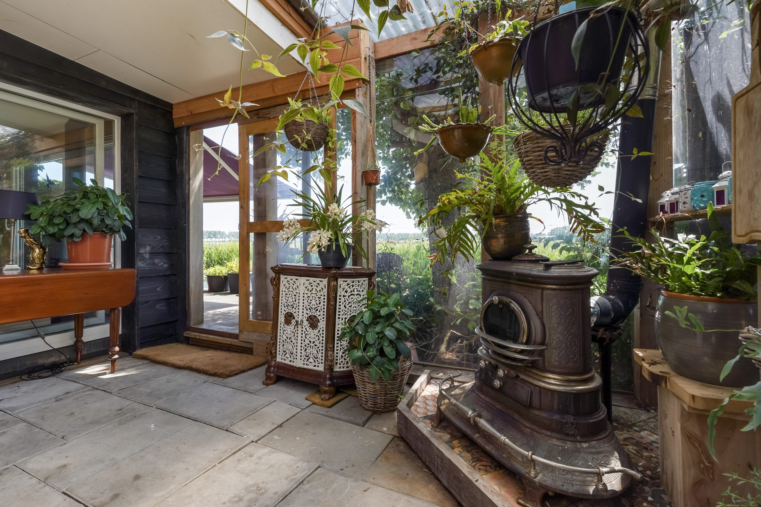 De ruime serre vormt het hart van het huis: hier is een tweede keuken geplaatst met spoelbak, koeling, vaatwasser en volop werk- en bergruimte. Aan de robuuste houten eettafel kun je uitgebreid dineren met vrienden en familie. Dankzij de houtkachel is dit een heerlijke plek om ook in de winter te verblijven.