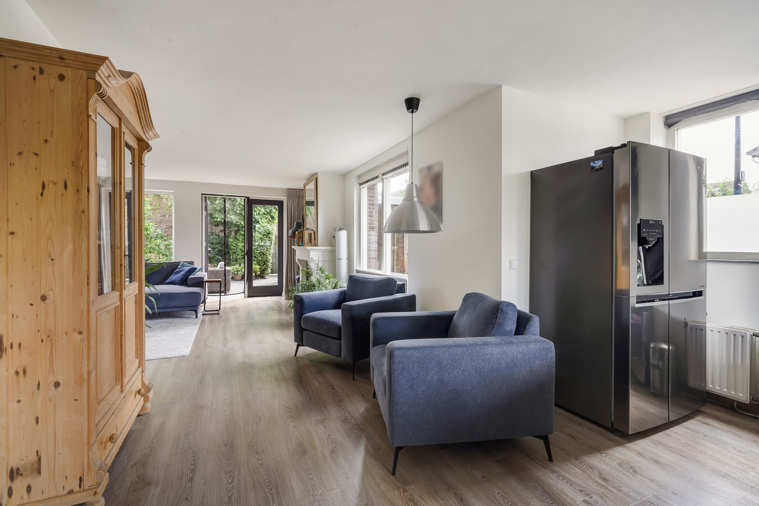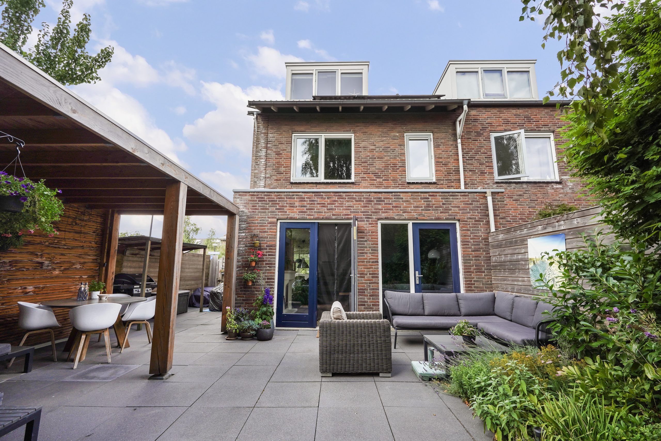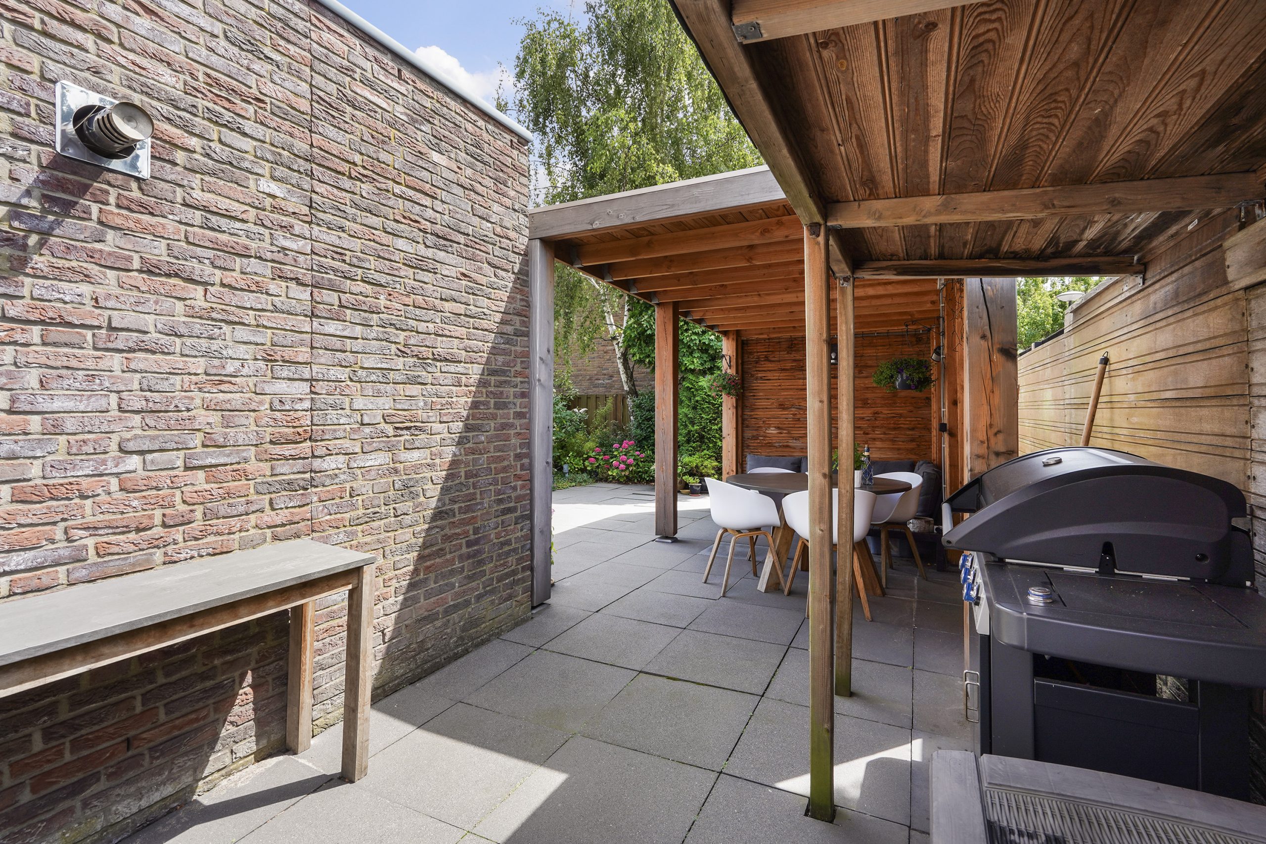 Front garden, entrance hall with fuse box and separate toilet. The bright living room with open kitchen is a perfect place to gather. The kitchen is equipped with modern built-in appliances such as a dishwasher, Quooker tap, 6-burner Boretti gas stove with convection oven, a conventional oven, and a microwave. From the living room you step directly into the garden, where a spacious, electrically connected roofed terrace has recently been added – perfect for enjoying your outdoor space all year round. A practical detached storage shed completes the garden.