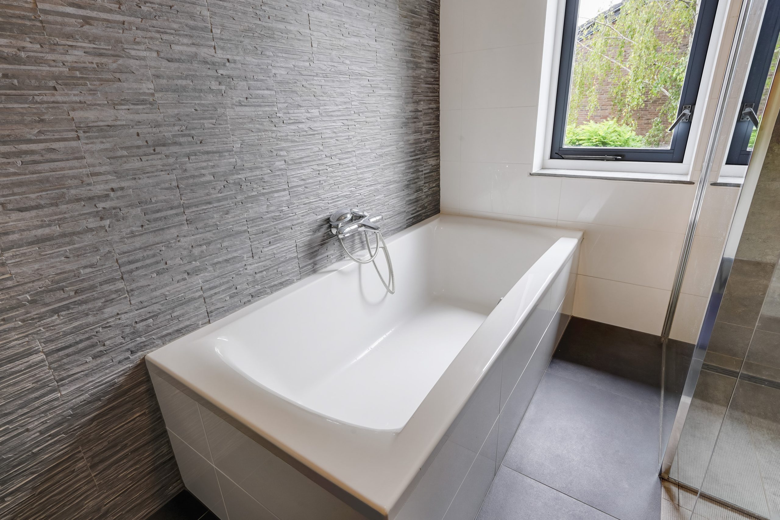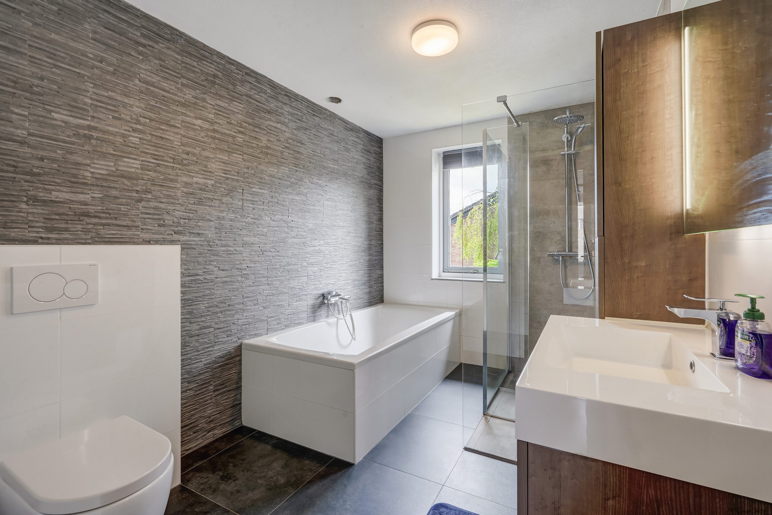 Landing, modern bathroom with walk-in shower, washbasin unit, bathtub, and toilet. At the front you’ll find a large bedroom that can easily be divided into two separate rooms. At the rear there is another spacious bedroom.