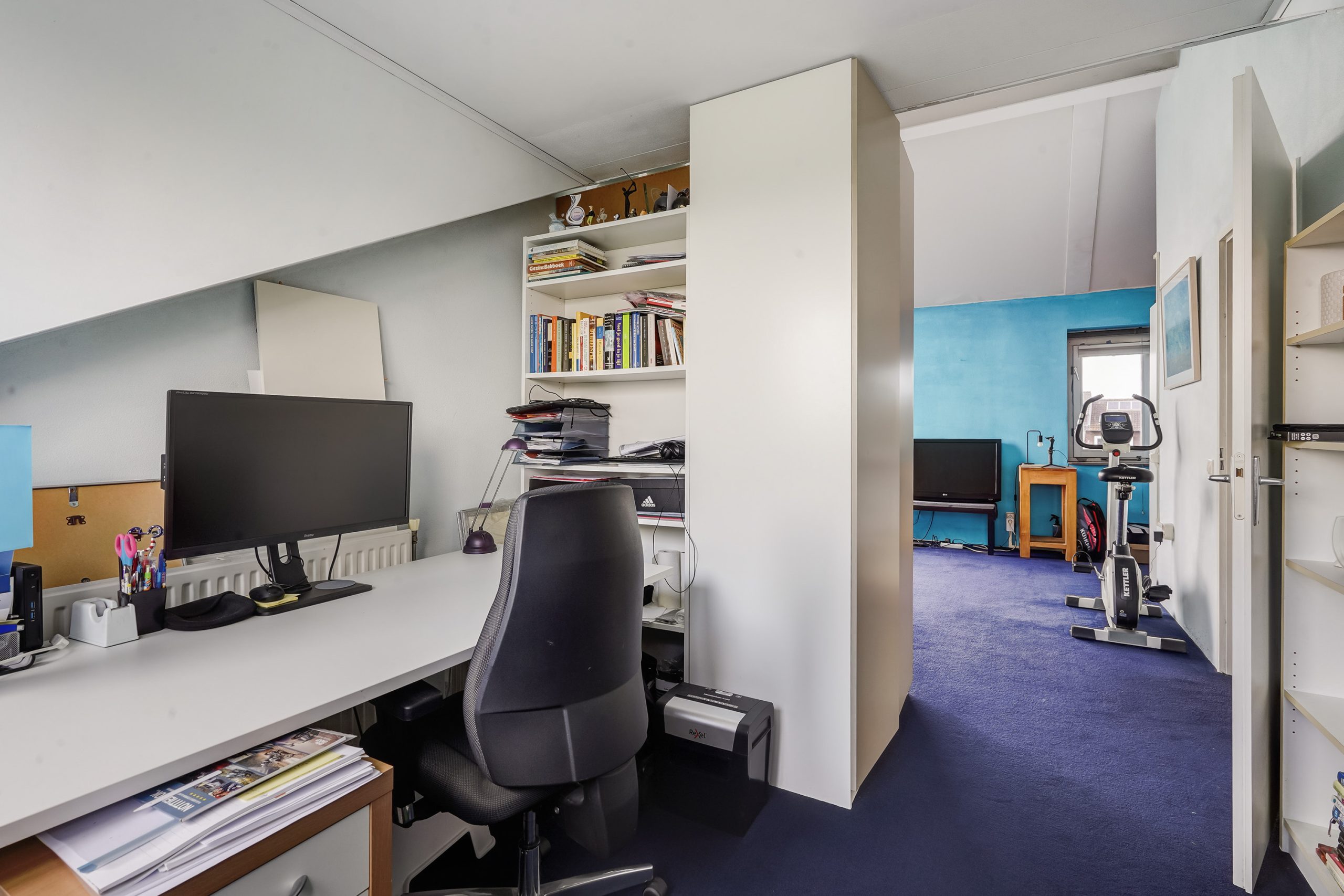 Overloop met wasmachineaansluiting en cv-ketelopstelling. Daarnaast een grote slaapkamer met werkhoek, ideaal als thuiswerkplek of extra slaapruimte.